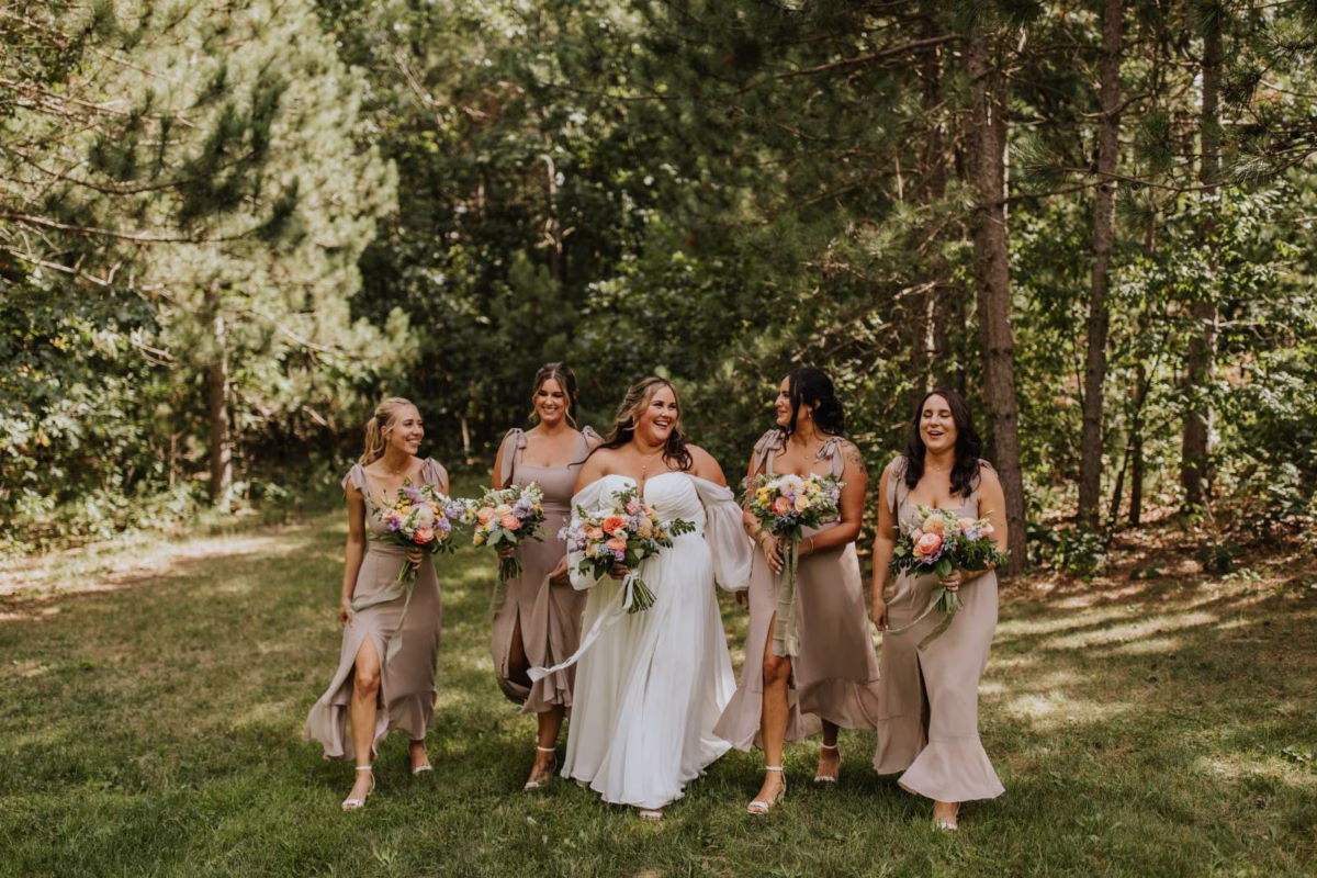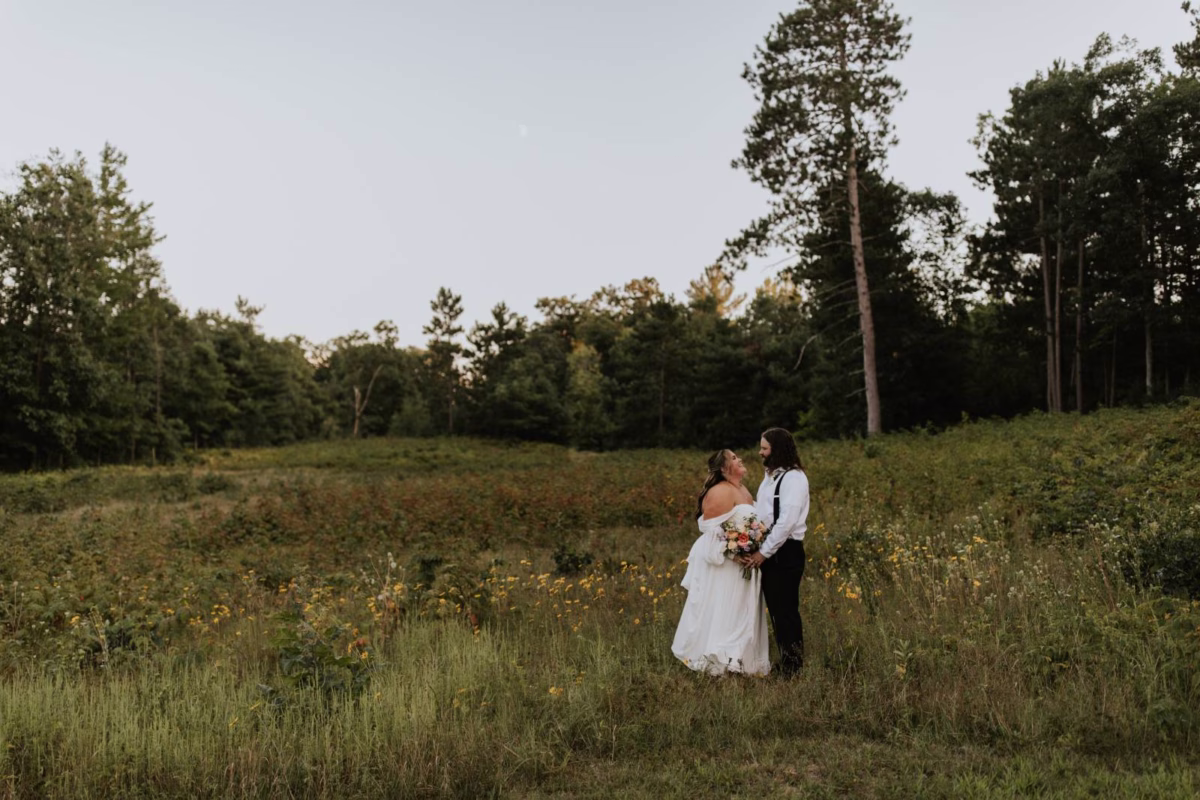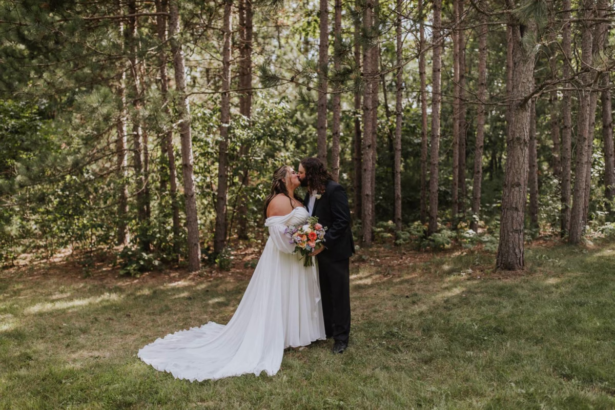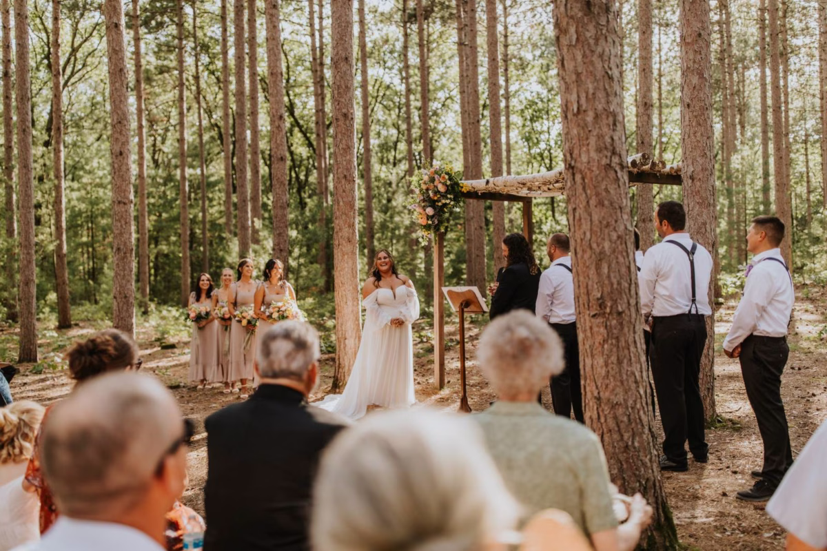 These two celebrated their love on a beautiful August day tucked in the Wisconsin woods at Burlap & Belles’ venue in Black River Falls, surrounded by the romance of the pines, the love of their friends and family, and the whimsy of wildflowers gracing every corner.