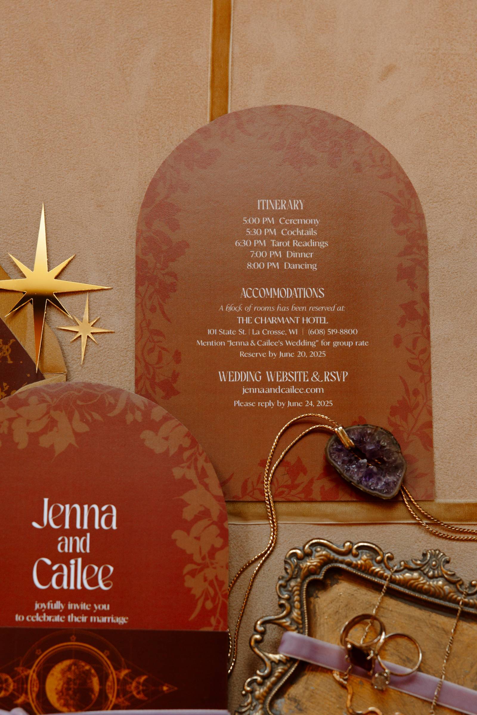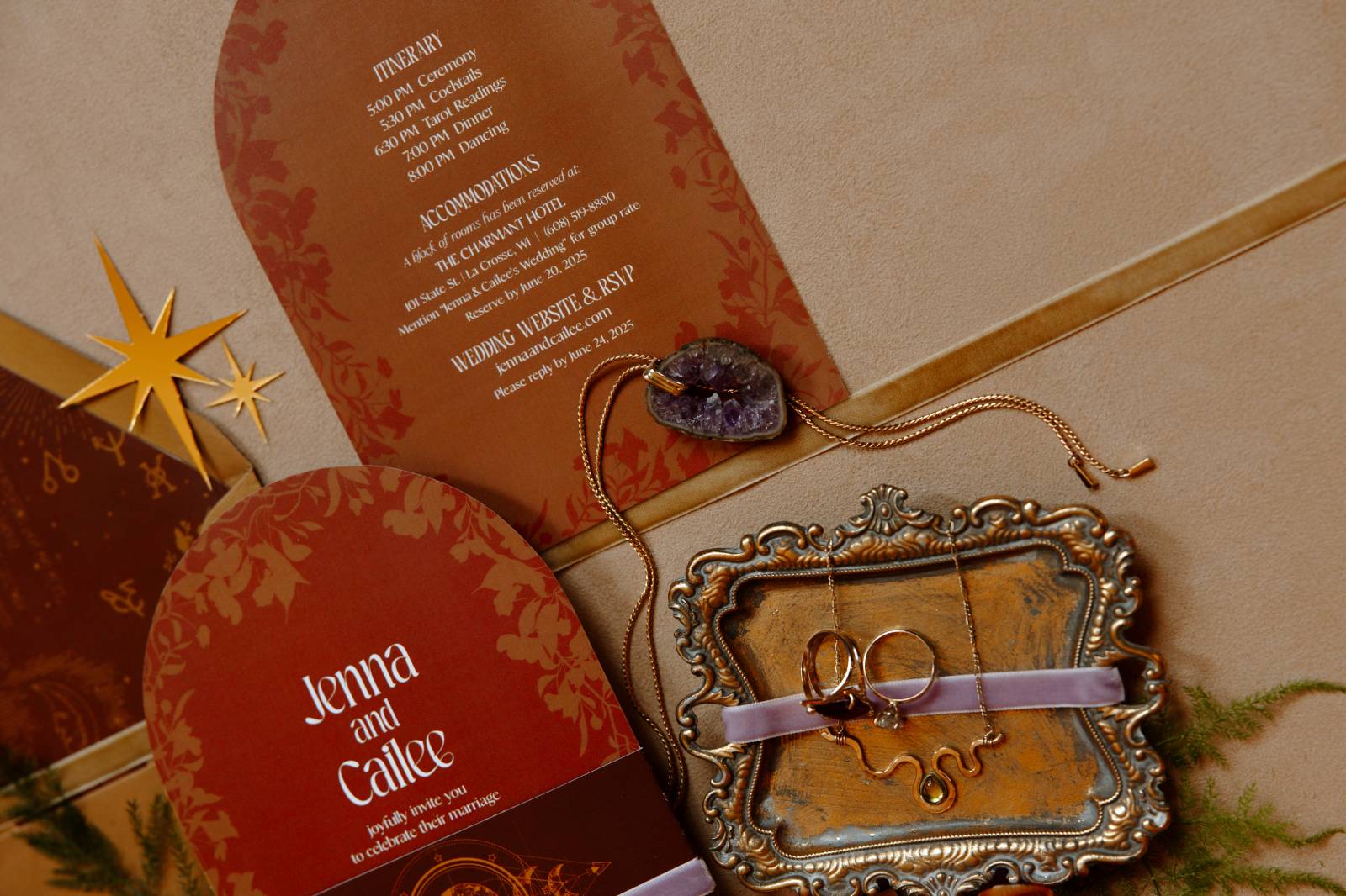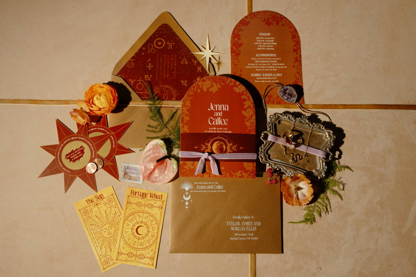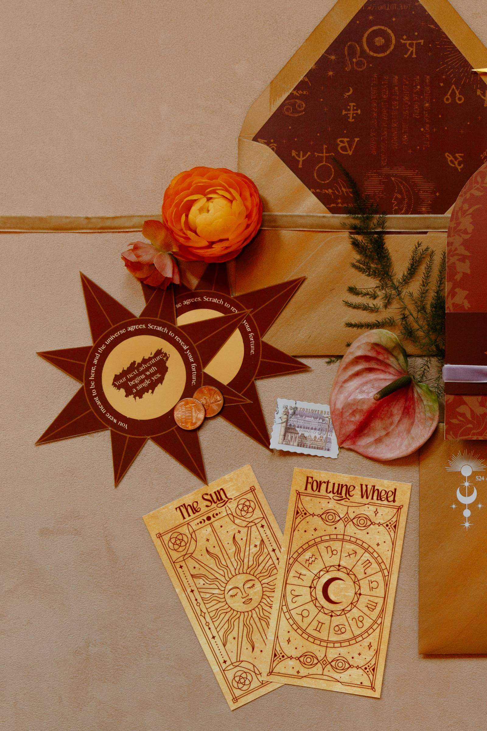 LK Bridal Studio captured the essence of the Alternative Fortune editorial by working within a natural palette of red, orange, gold, mustard, and lavender. The stationery suite began with a contour-cut invitation and details card, secured with a burgundy, celestial belly band and velvet ribbon. The invitation fit inside a gold envelope with astrology-inspired liner, paired with custom tarot cards and scratch-off fortunes.
