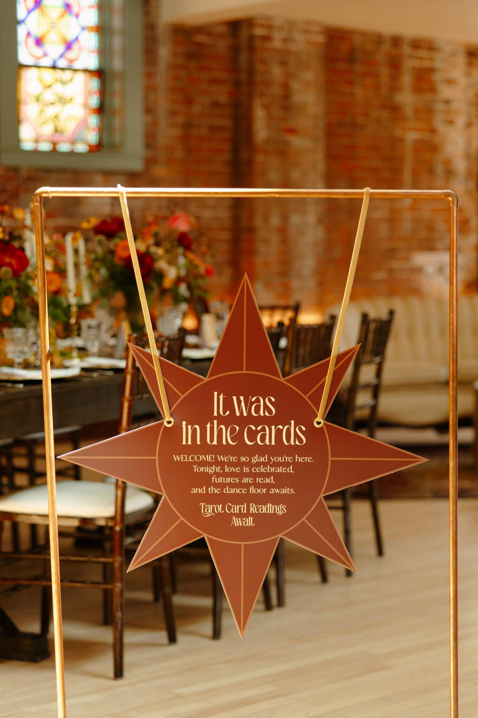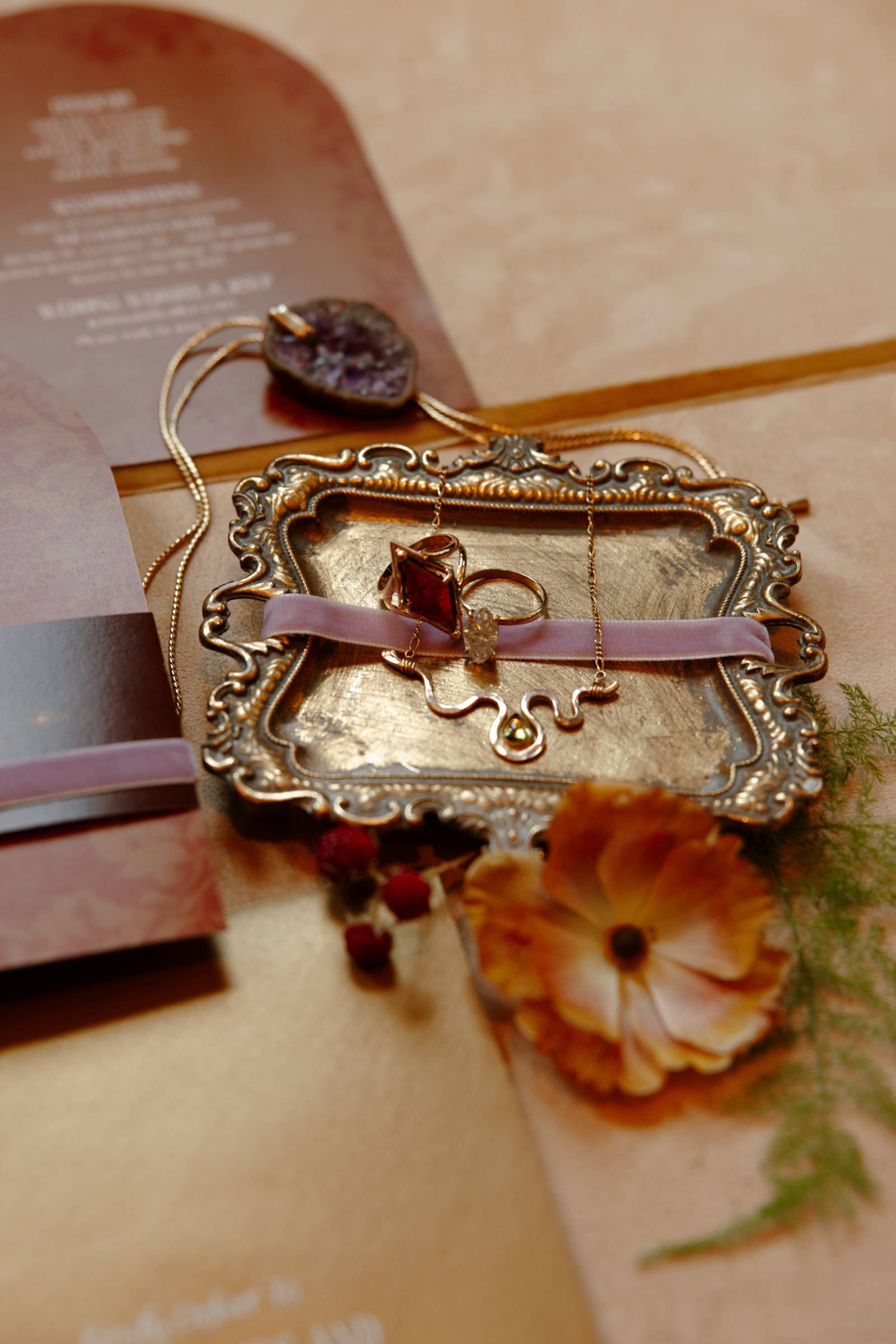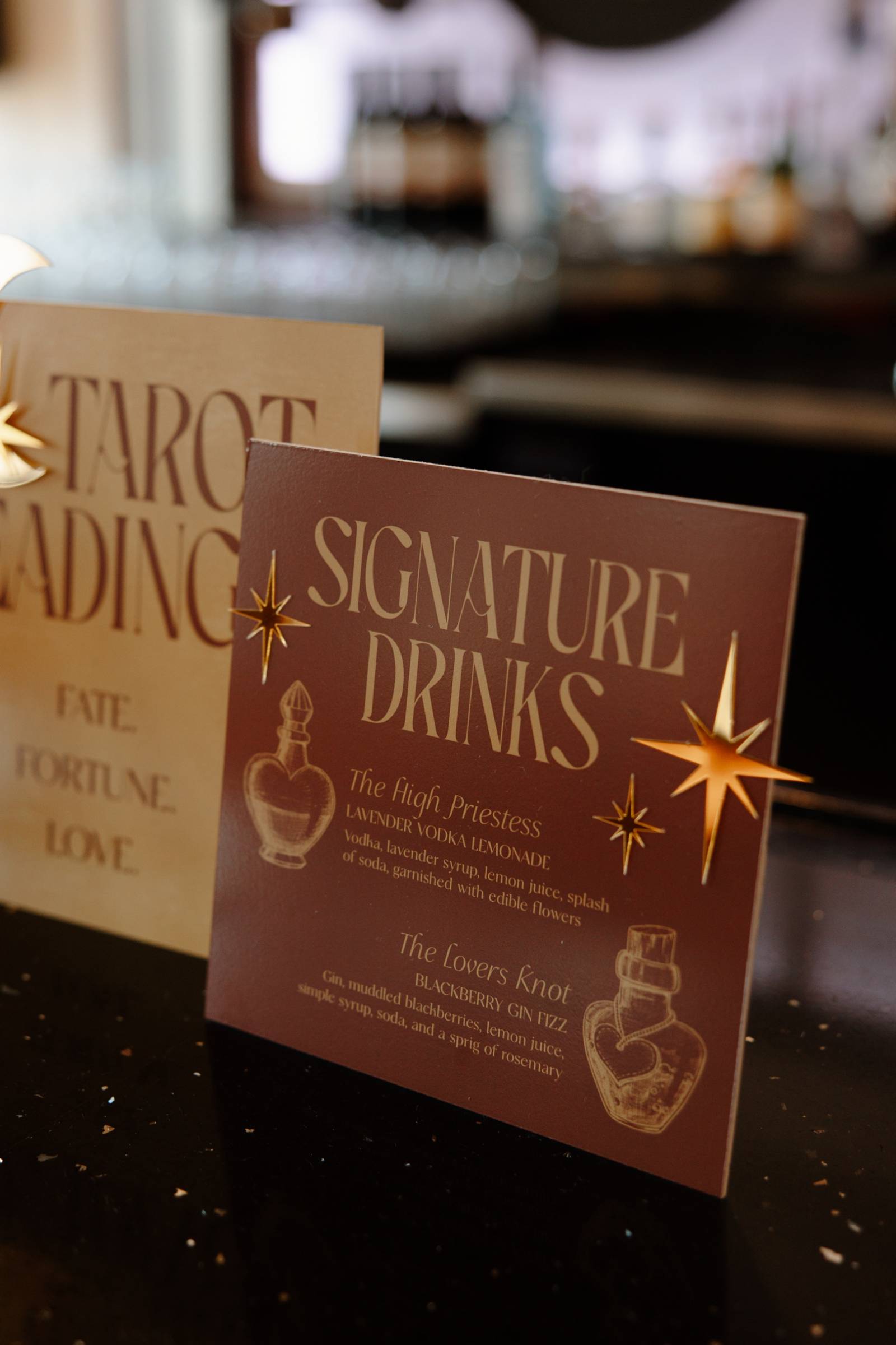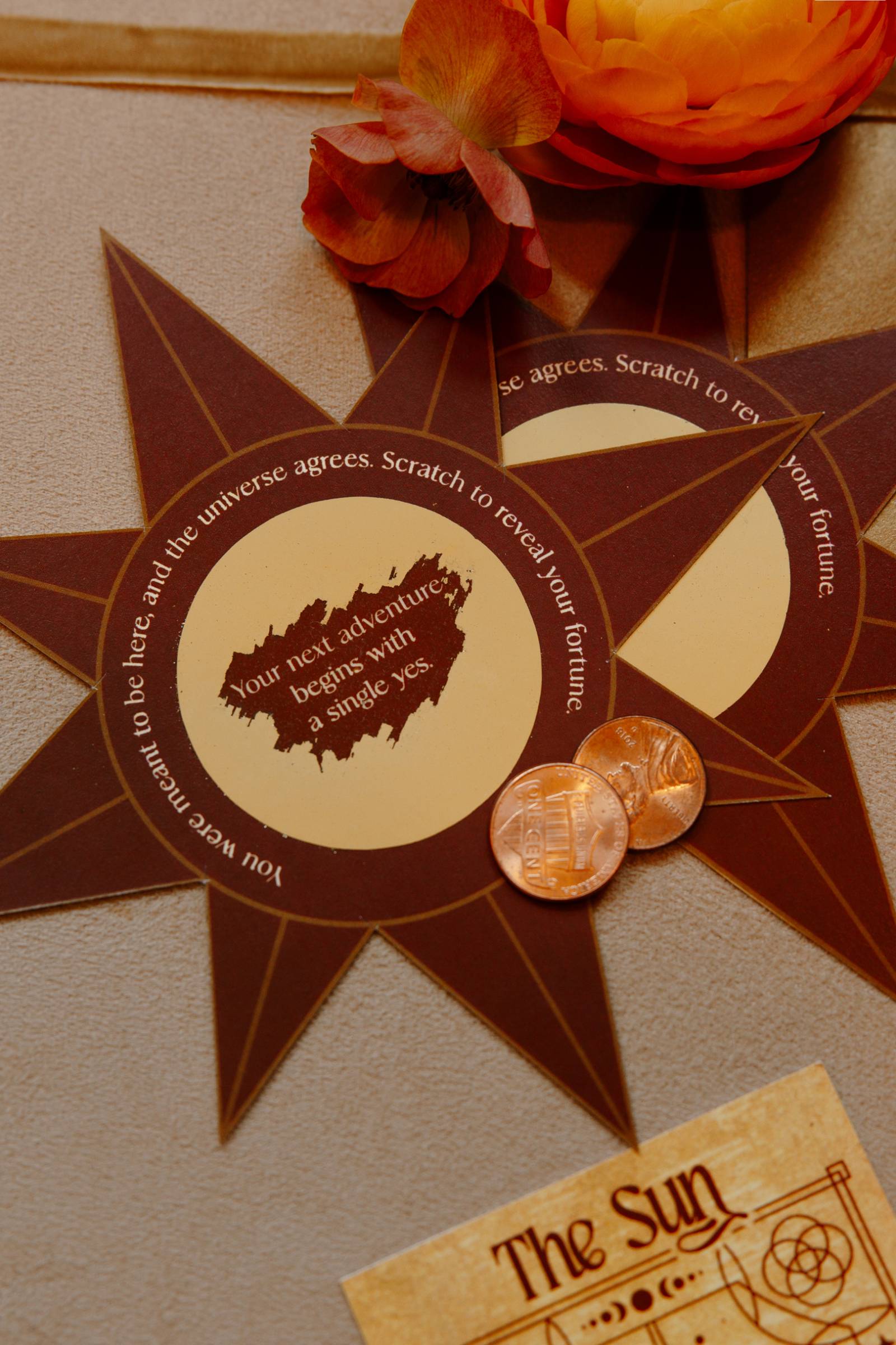 LK Bridal Studio captured the essence of the Alternative Fortune editorial by working within a natural palette of red, orange, gold, mustard, and lavender. The stationery suite began with a contour-cut invitation and details card, secured with a burgundy, celestial belly band and velvet ribbon. The invitation fit inside a gold envelope with astrology-inspired liner, paired with custom tarot cards and scratch-off fortunes.