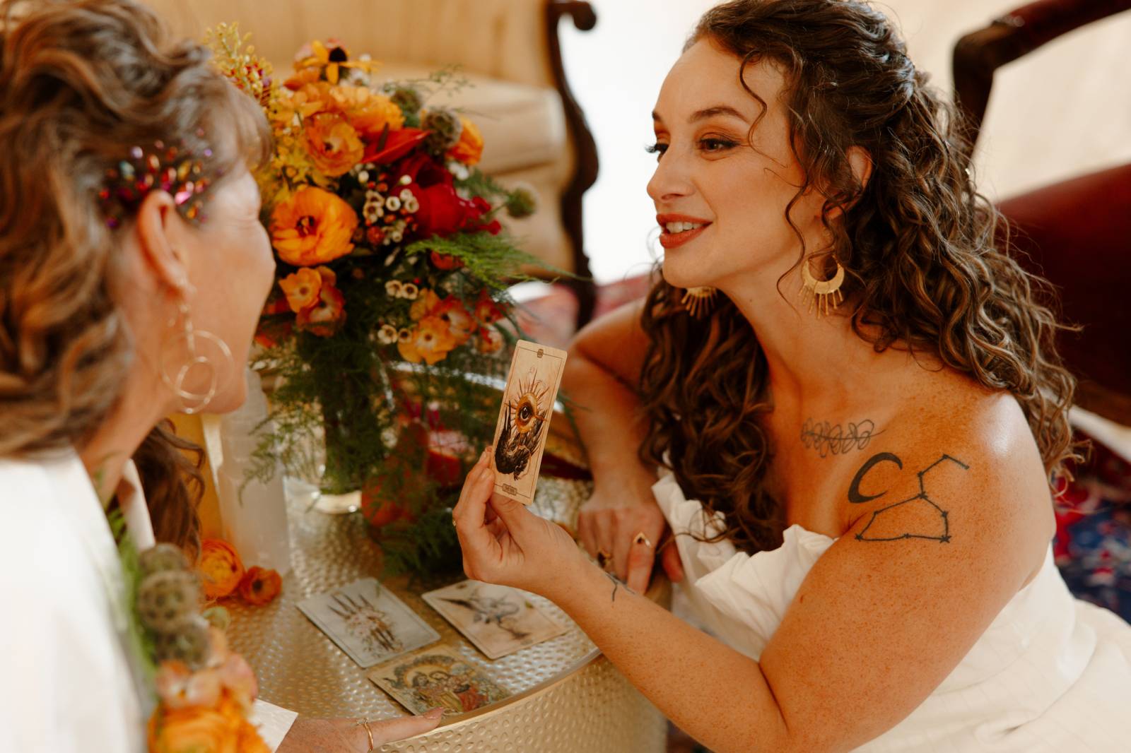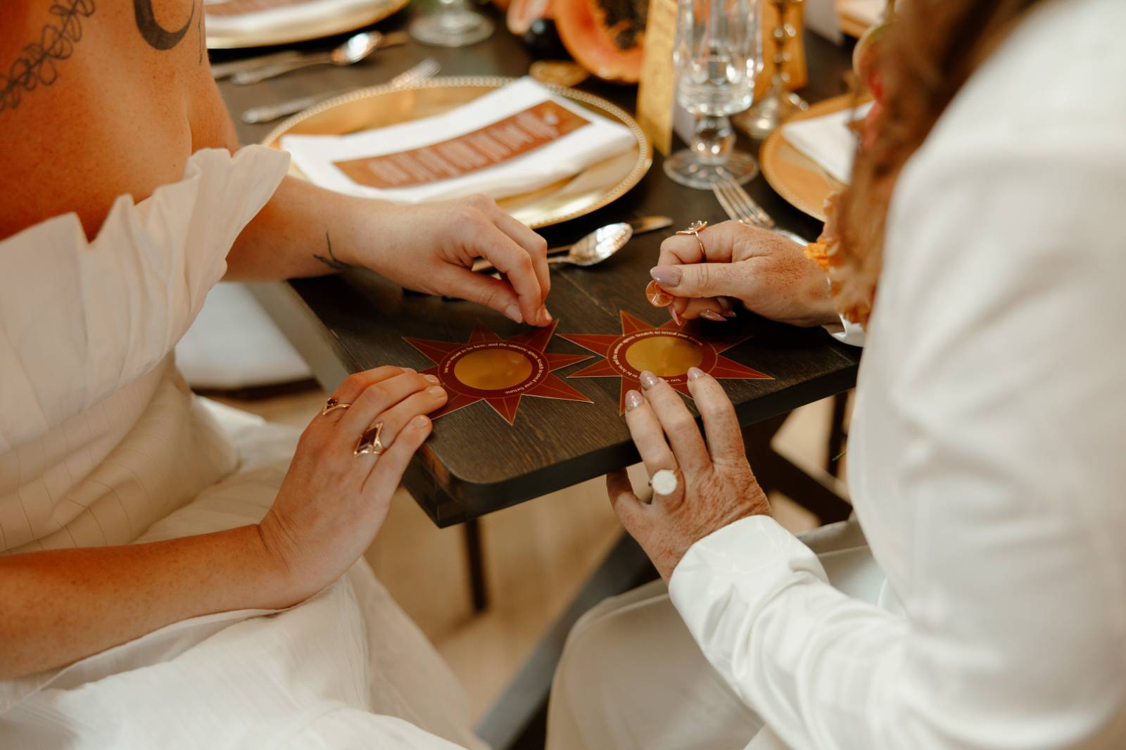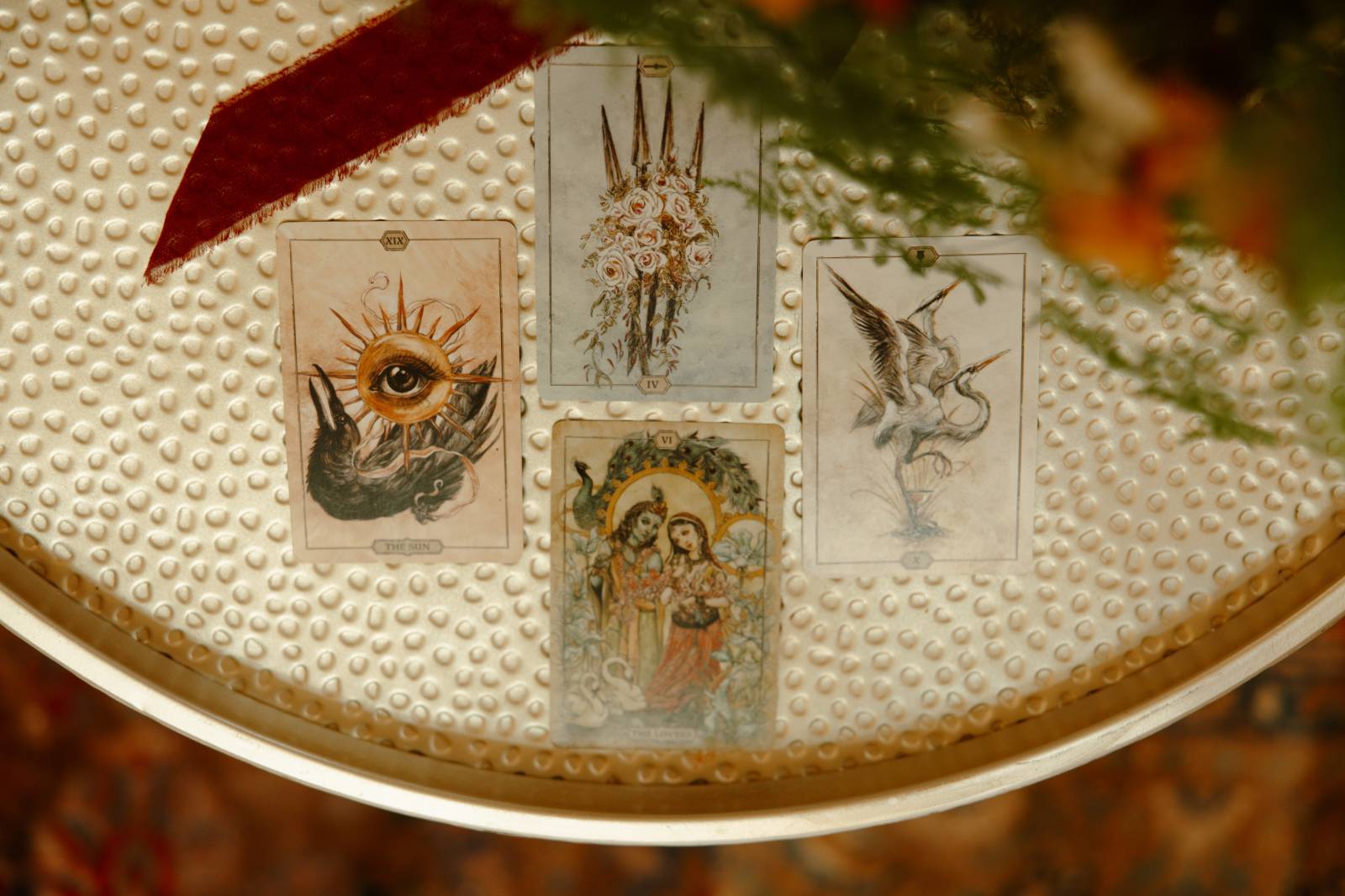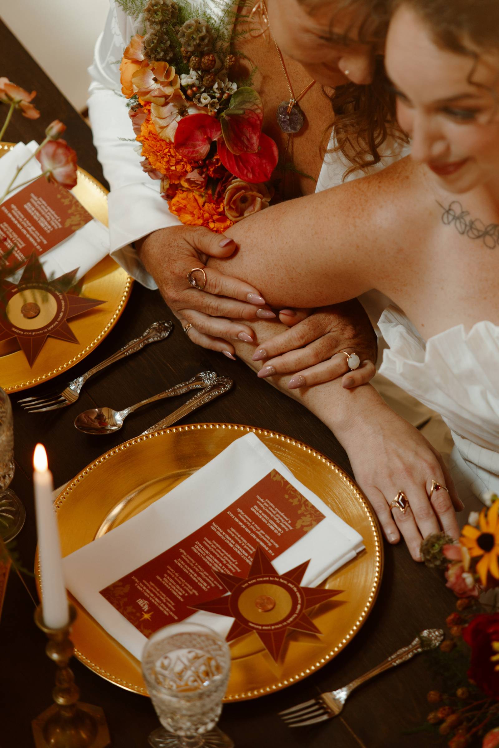 LK Bridal Studio captured the essence of the Alternative Fortune editorial by working within a natural palette of red, orange, gold, mustard, and lavender. The stationery suite began with a contour-cut invitation and details card, secured with a burgundy, celestial belly band and velvet ribbon. The invitation fit inside a gold envelope with astrology-inspired liner, paired with custom tarot cards and scratch-off fortunes.