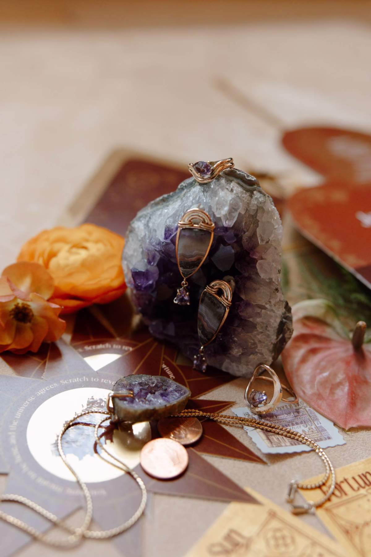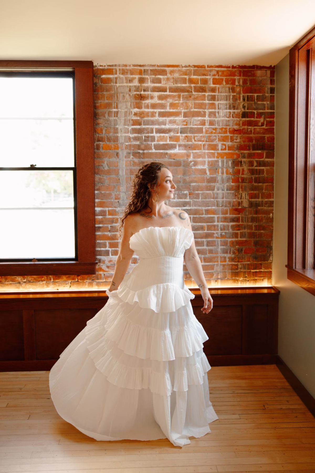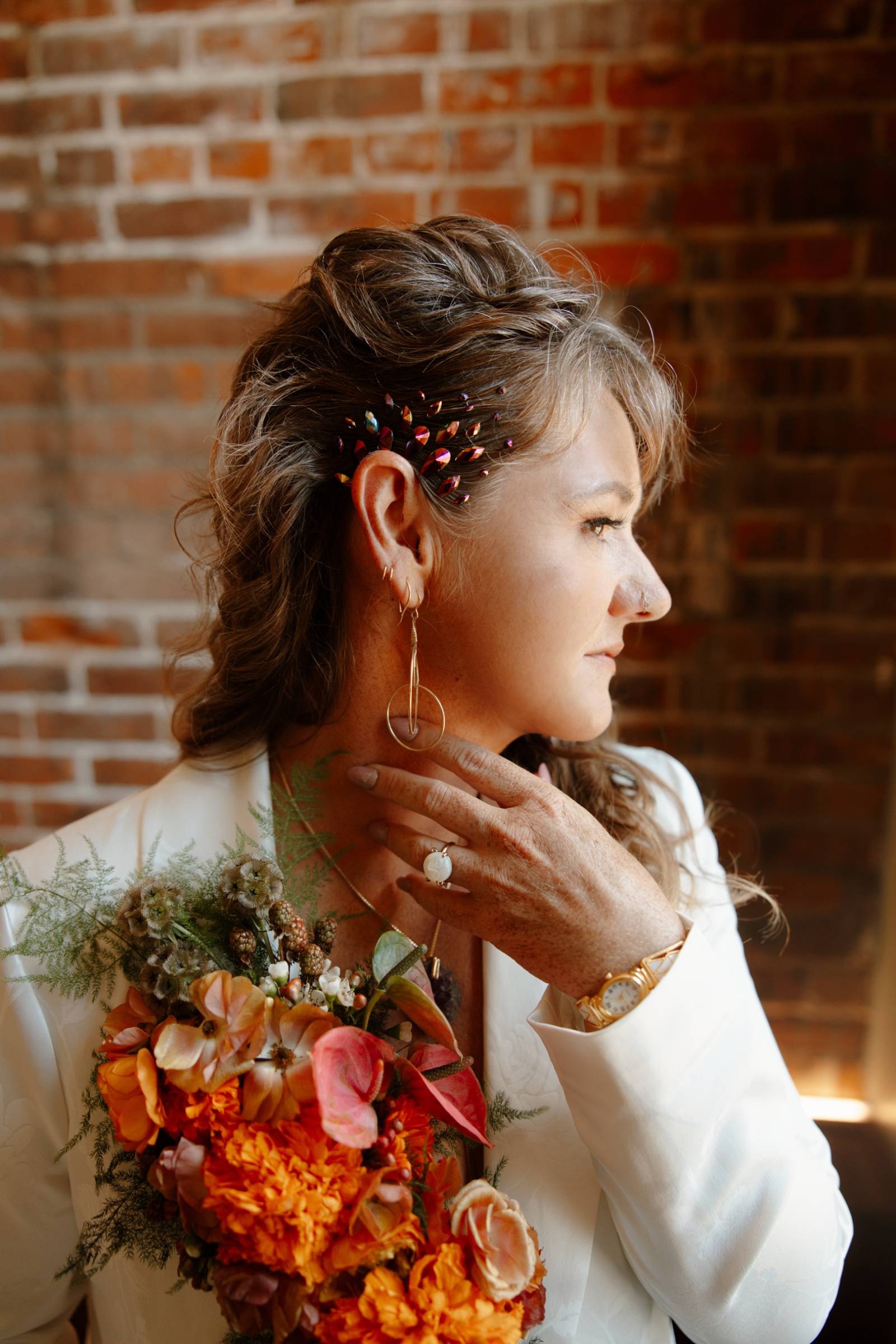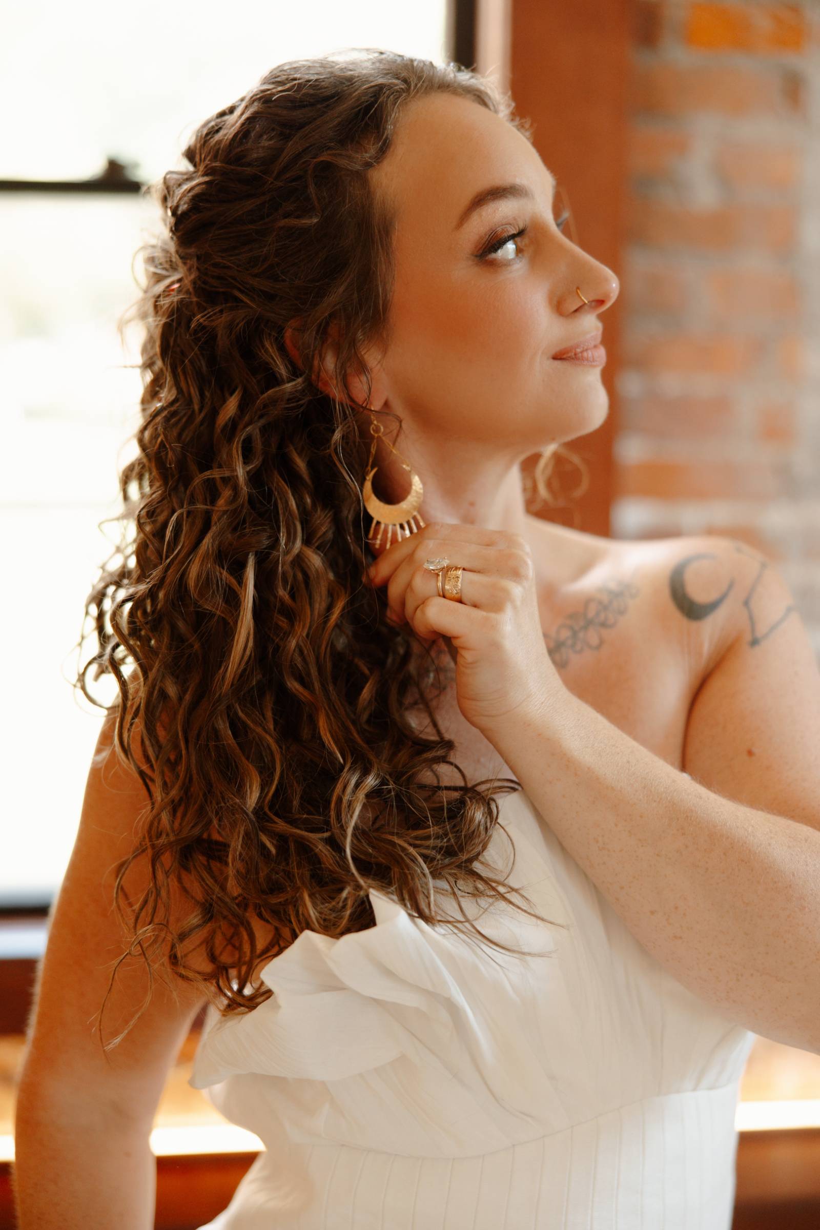 For model Cailee, Sincerely Yours Studios selected an artful, strapless ruffled gown with a tiered skirt. The fabric was lightweight with subtle texture, making for a flowery counterpart to Jenna’s suit. Electic Sol accessorized both brides with jewelry, including earrings, rings, and necklaces inspired by the elements and the earth.