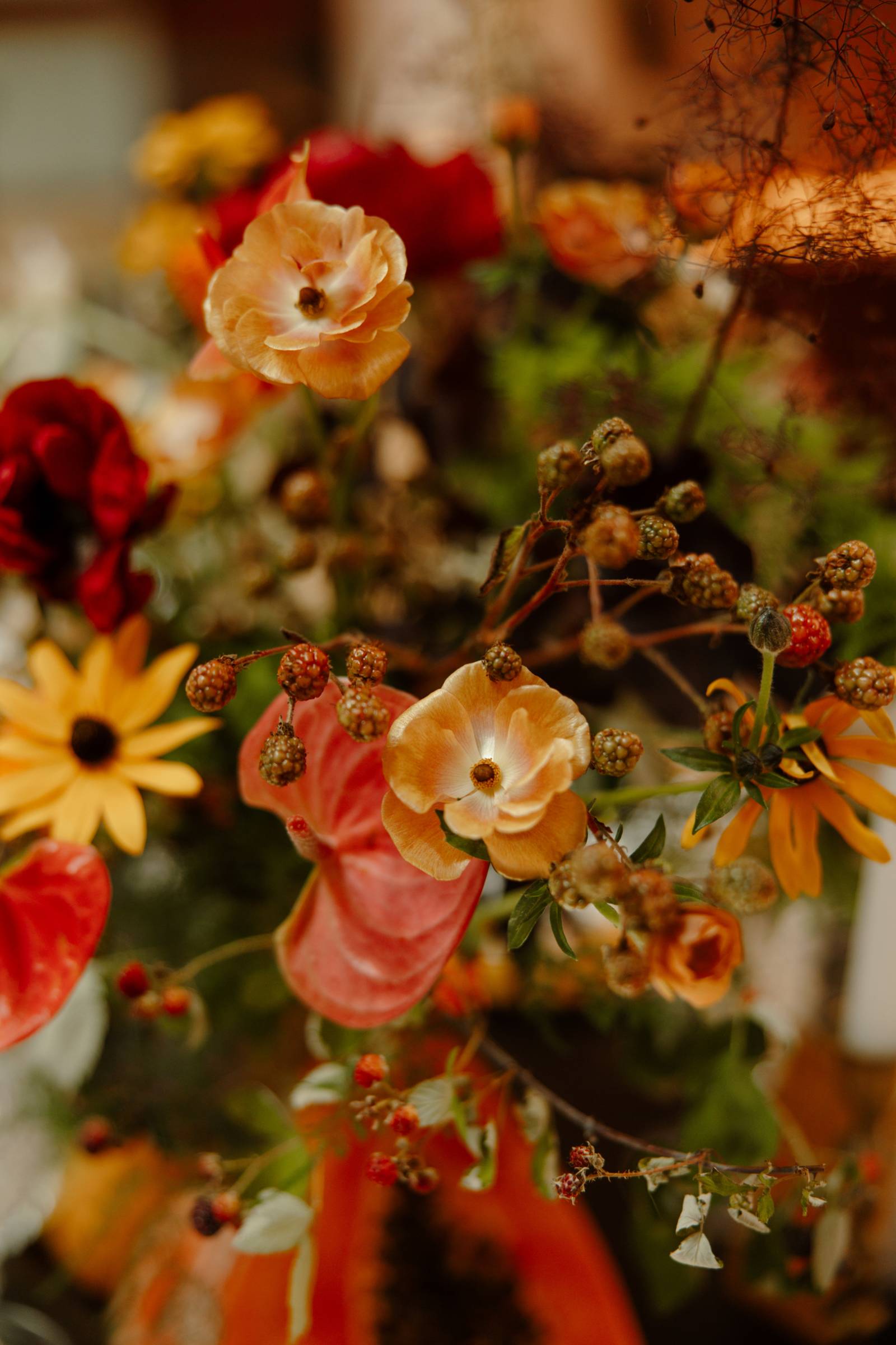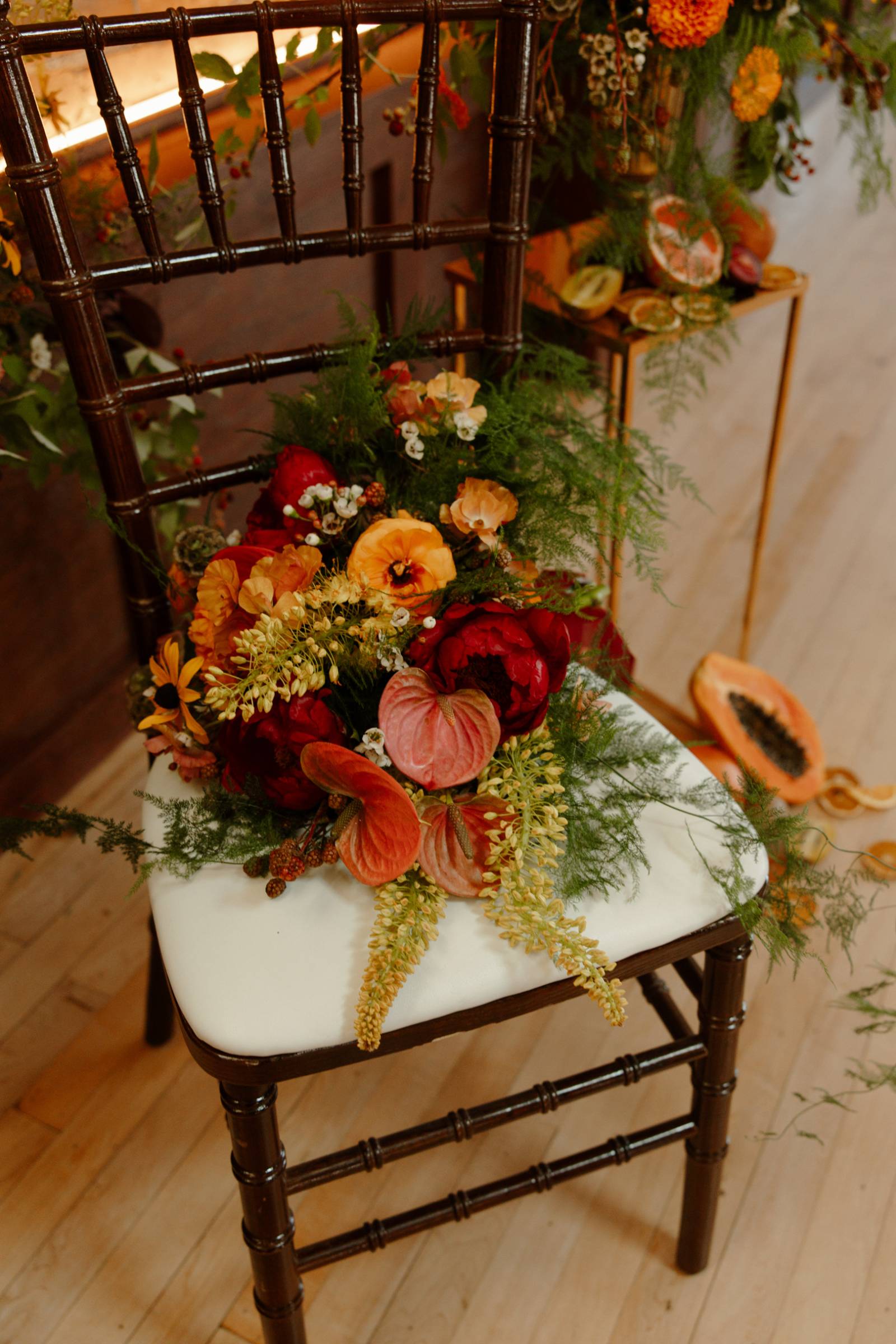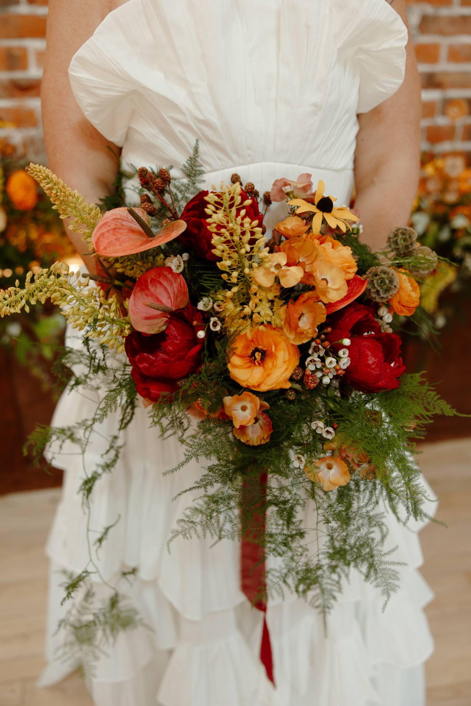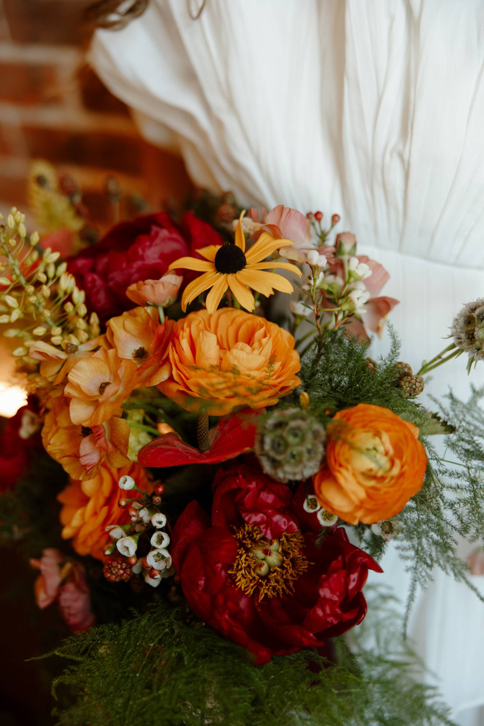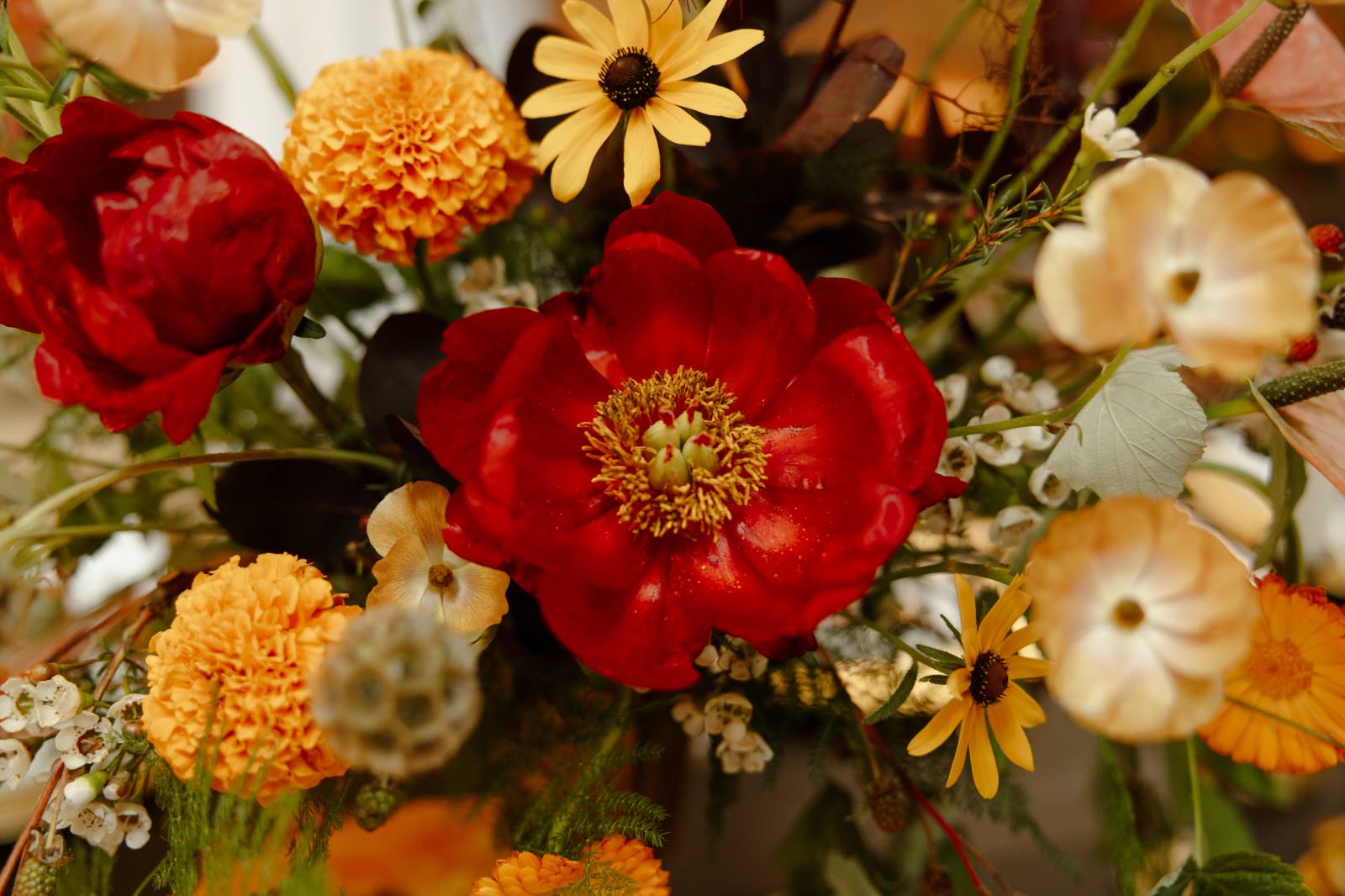 Floral pieces, including wearable florals, a bouquet, and decor, were composed of a warm, bold, and slightly wild aesthetic perfect for a modern wedding. Blooms included bright orange marigolds, red peonies, orange and yellow ranunculus, coral anthurium, black-eyed Susan, billy balls, goldenrod, fern greenery, and more.