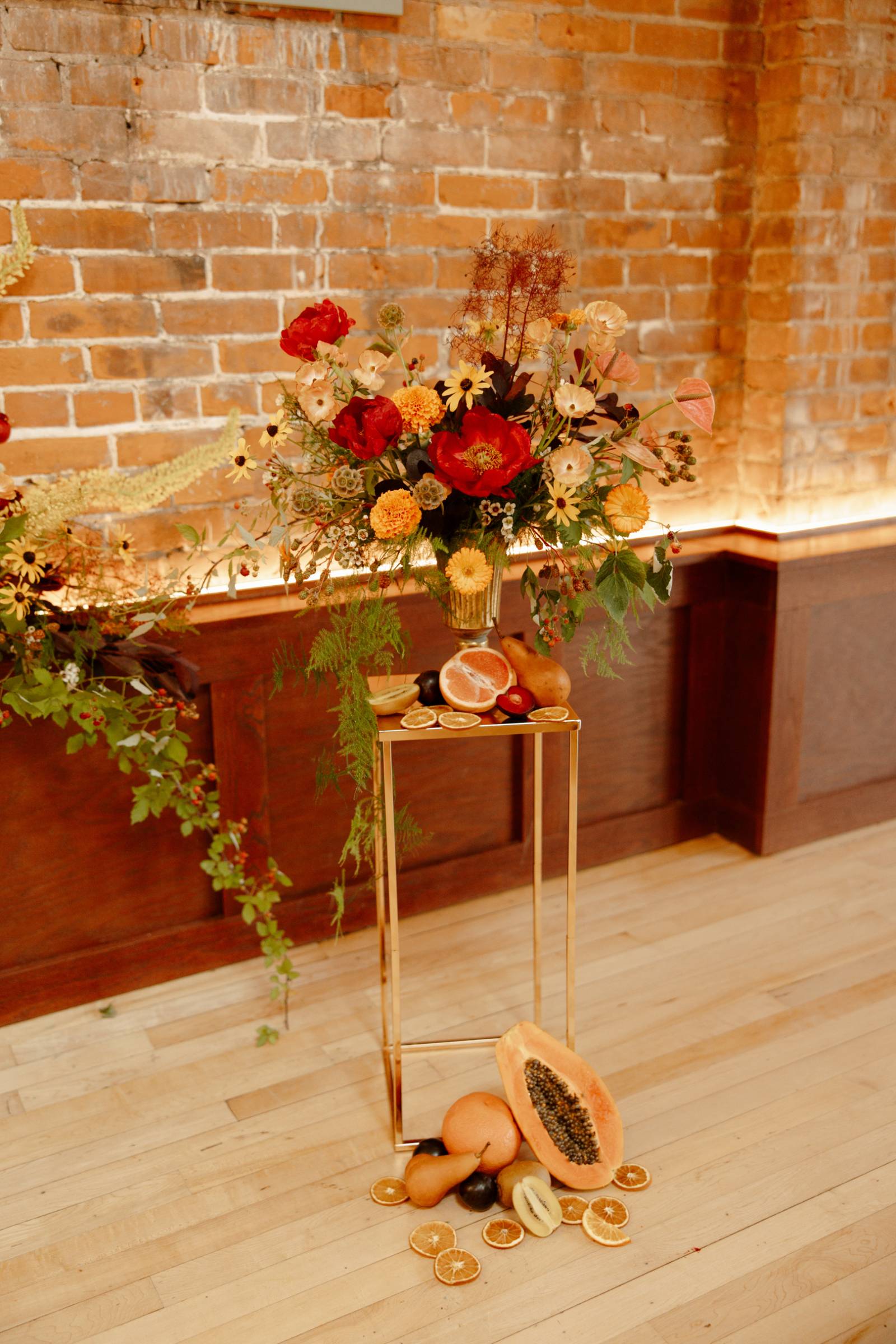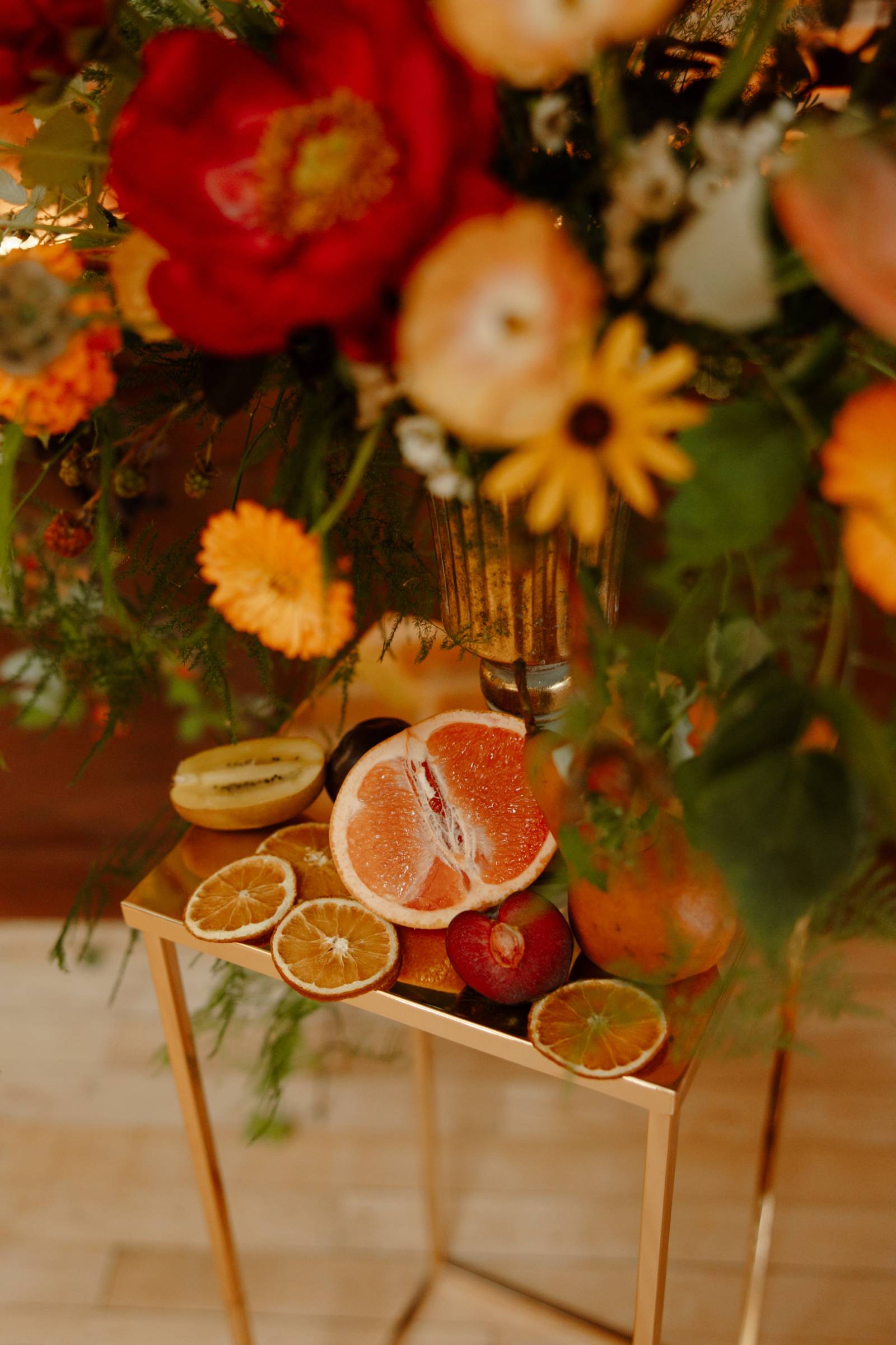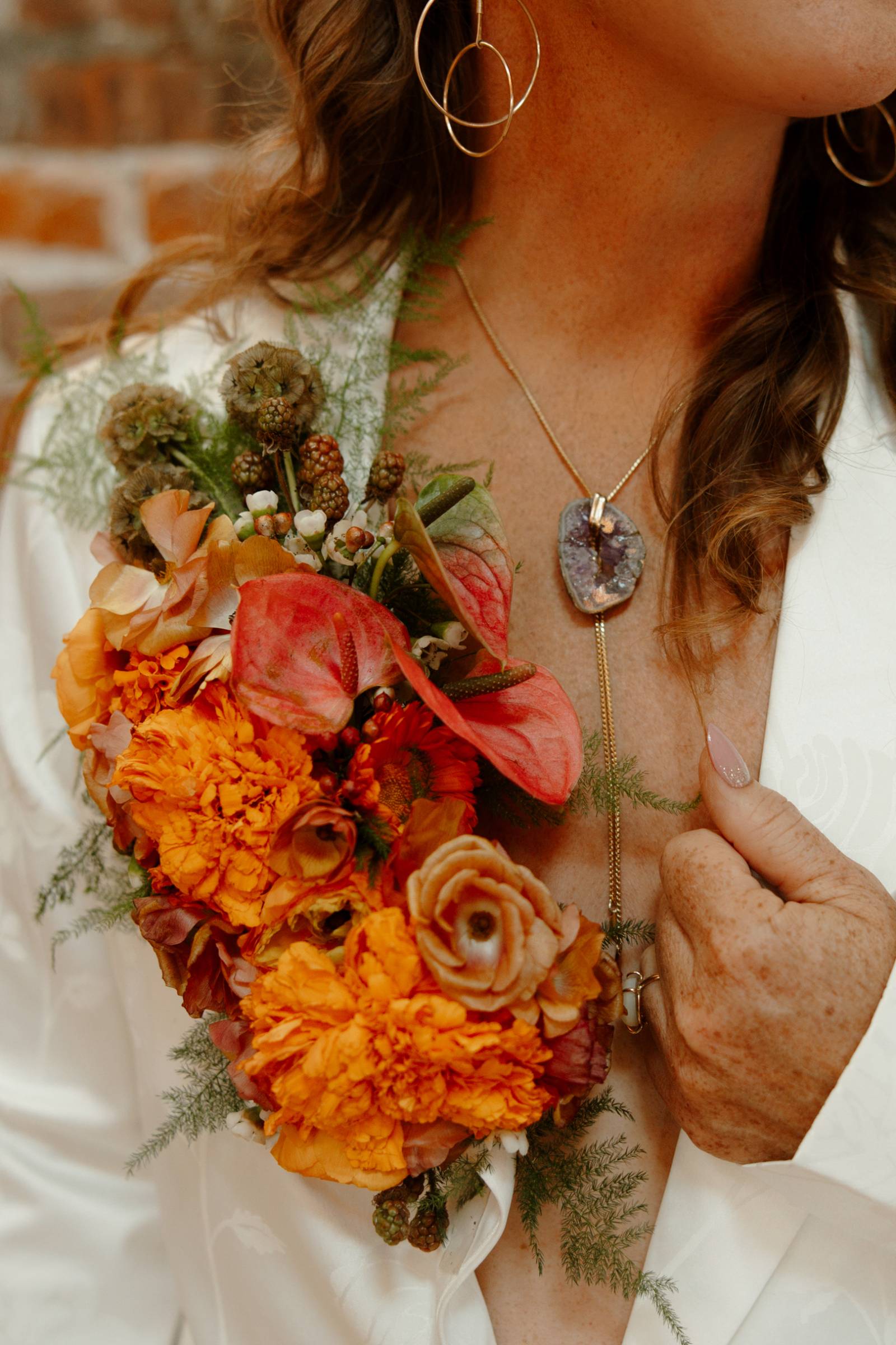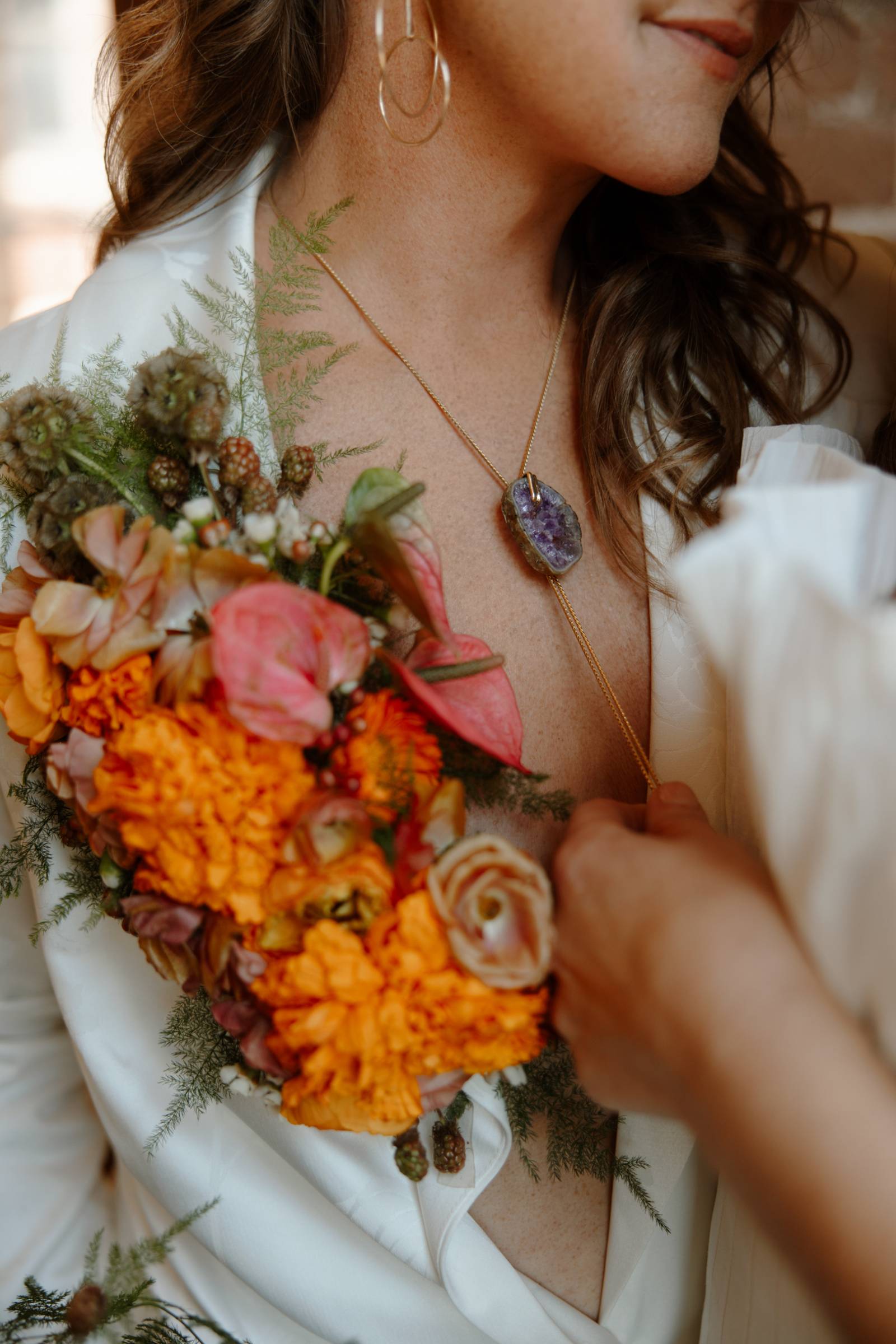 Floral pieces, including wearable florals, a bouquet, and decor, were composed of a warm, bold, and slightly wild aesthetic perfect for a modern wedding. Blooms included bright orange marigolds, red peonies, orange and yellow ranunculus, coral anthurium, black-eyed Susan, billy balls, goldenrod, fern greenery, and more.