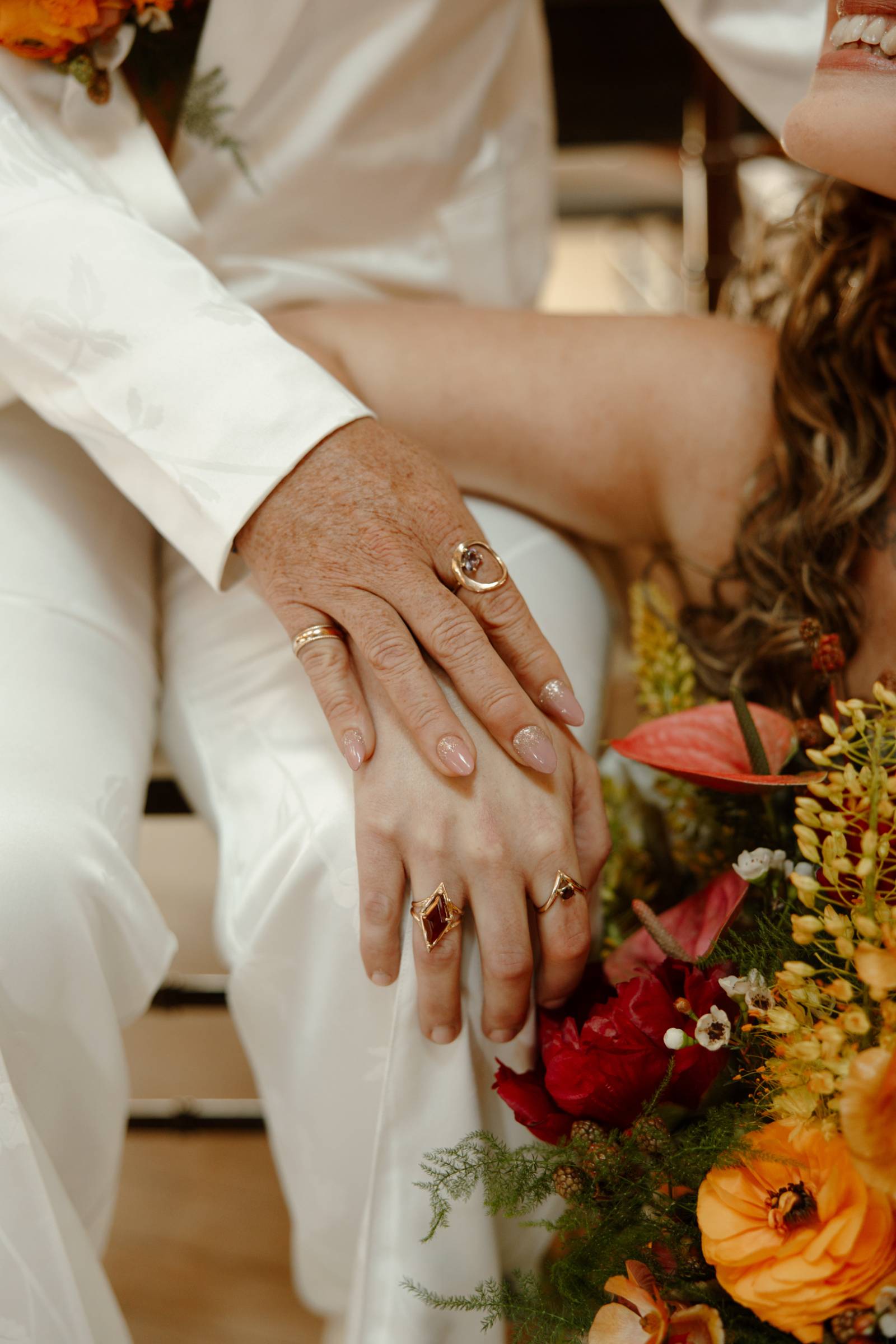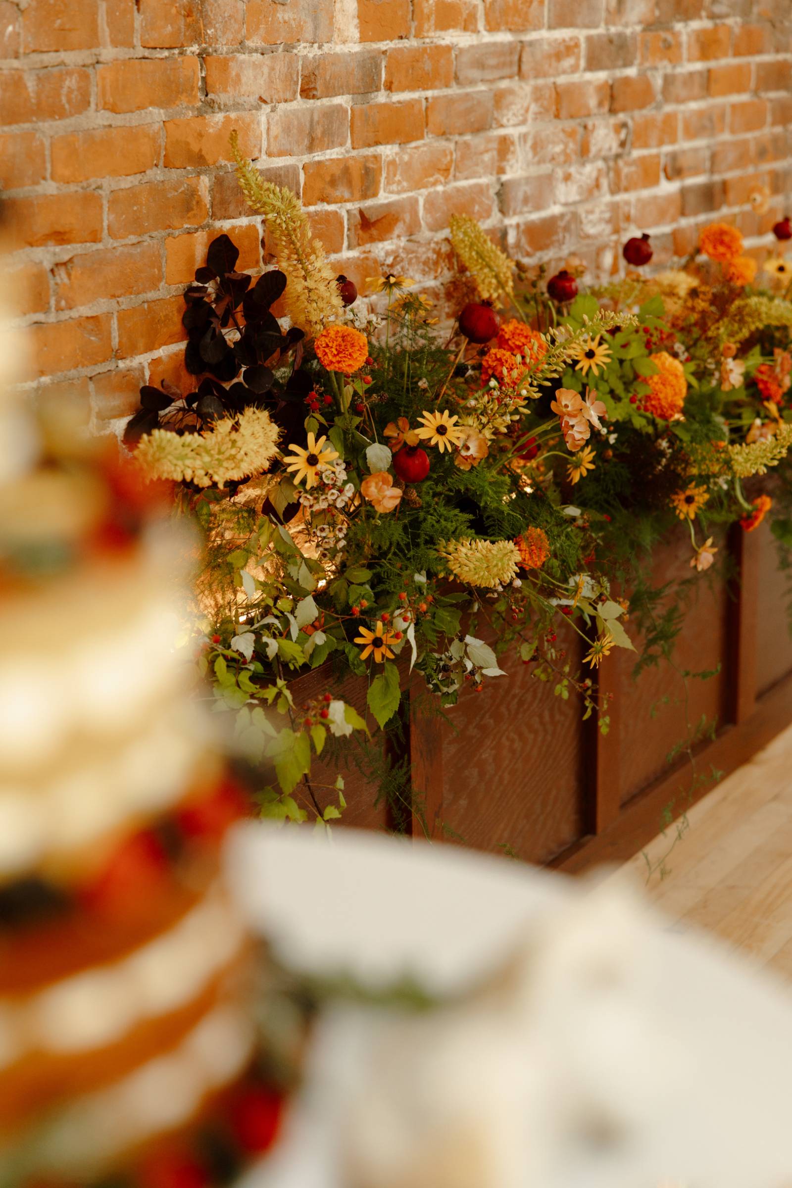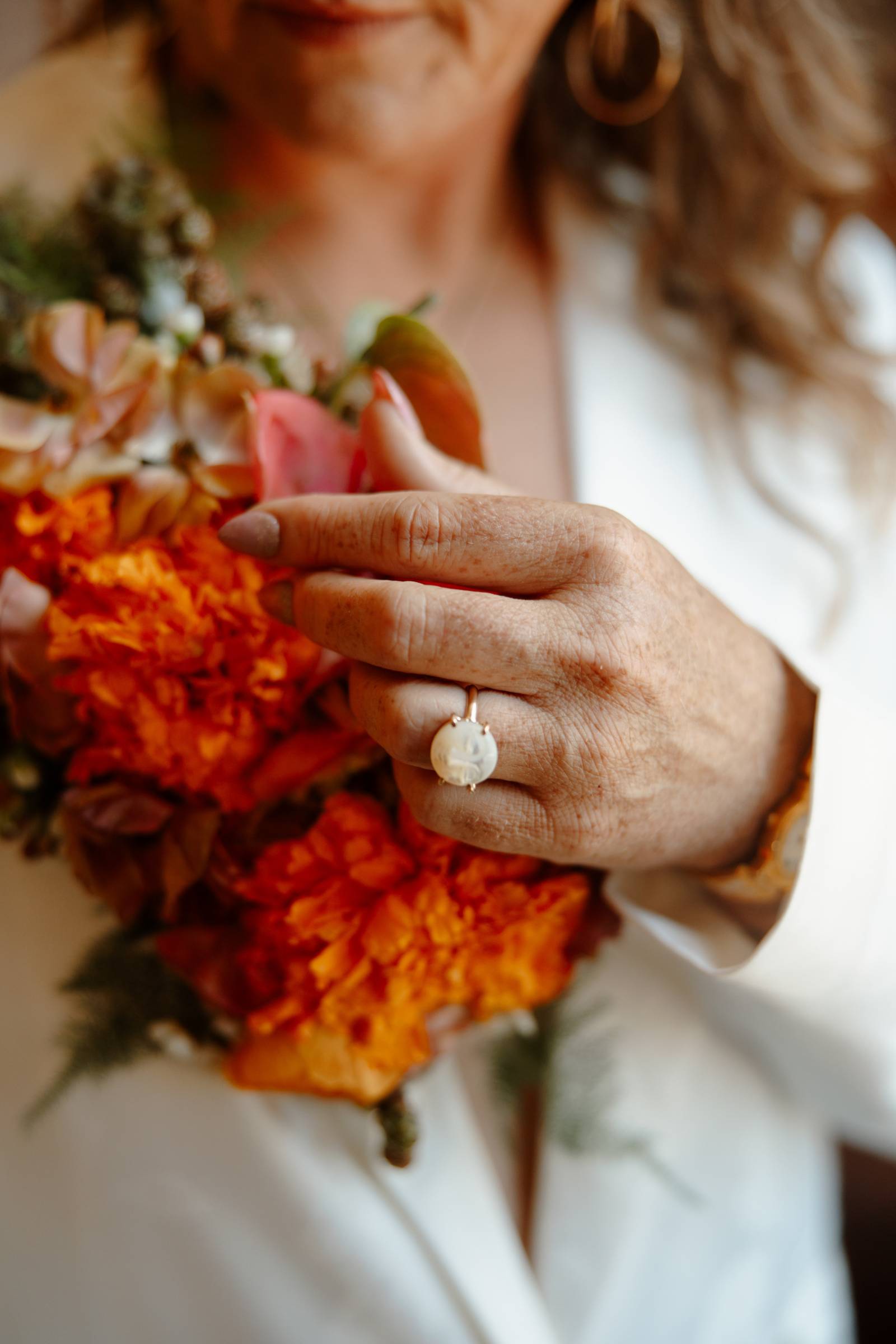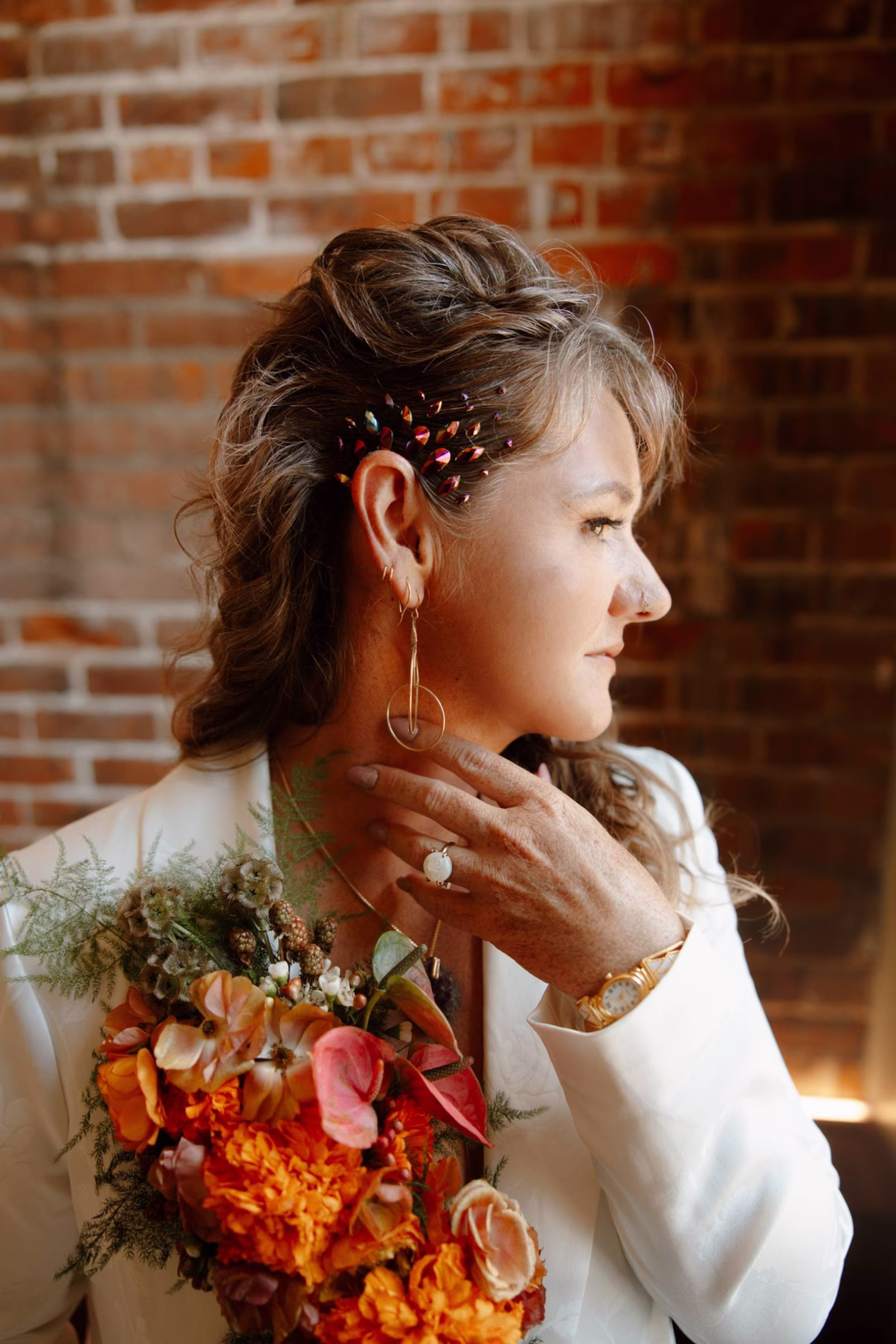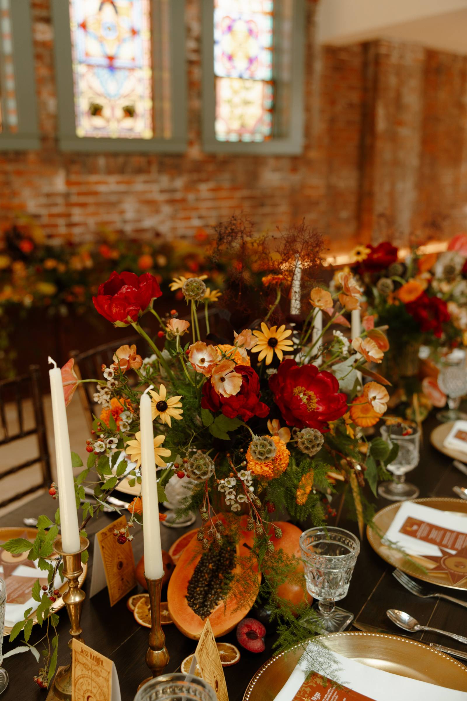 Floral pieces, including wearable florals, a bouquet, and decor, were composed of a warm, bold, and slightly wild aesthetic perfect for a modern wedding. Blooms included bright orange marigolds, red peonies, orange and yellow ranunculus, coral anthurium, black-eyed Susan, billy balls, goldenrod, fern greenery, and more.