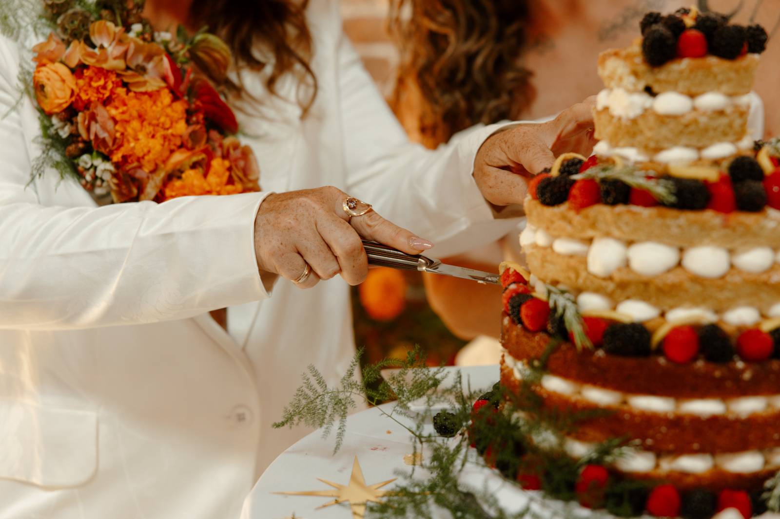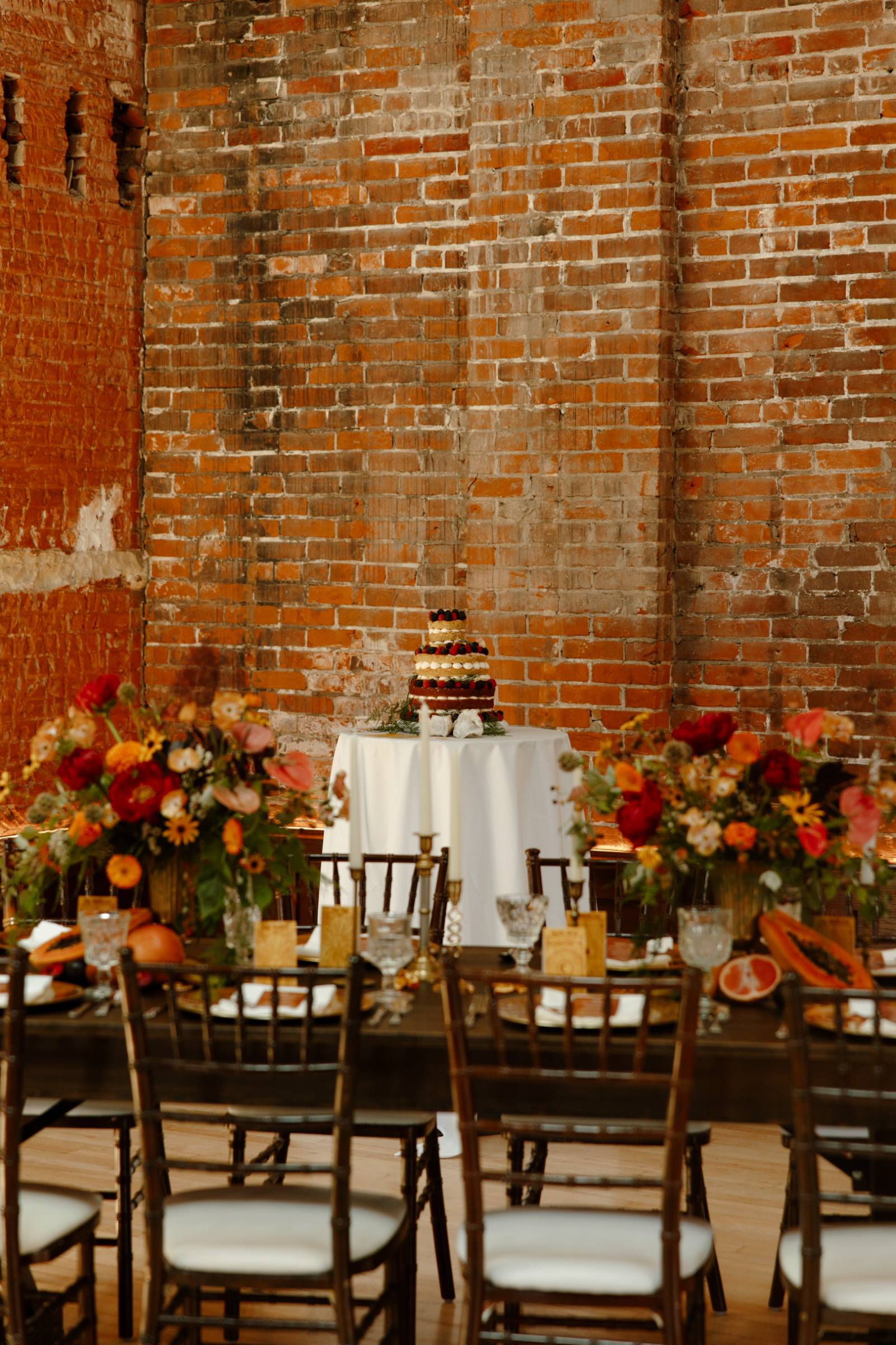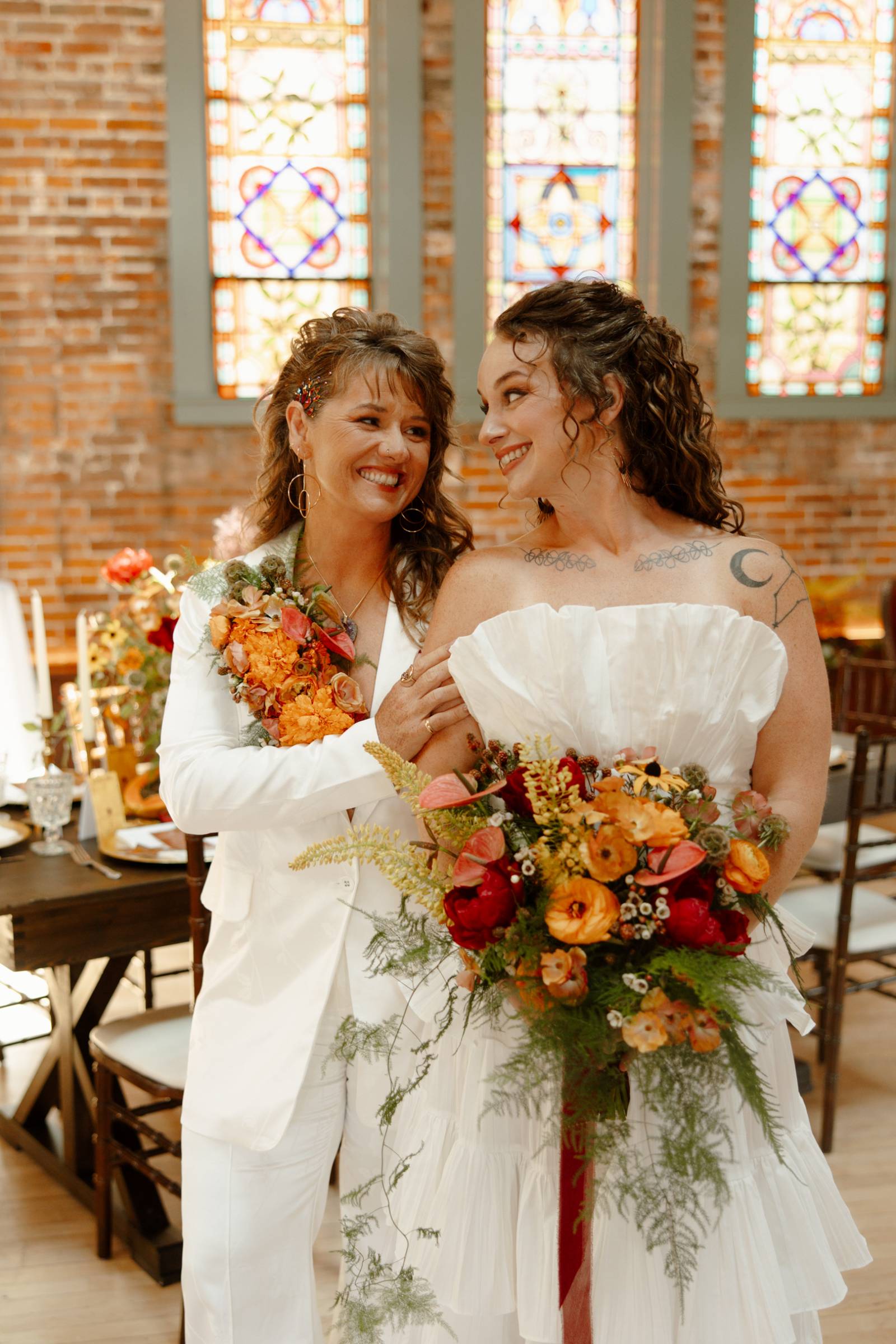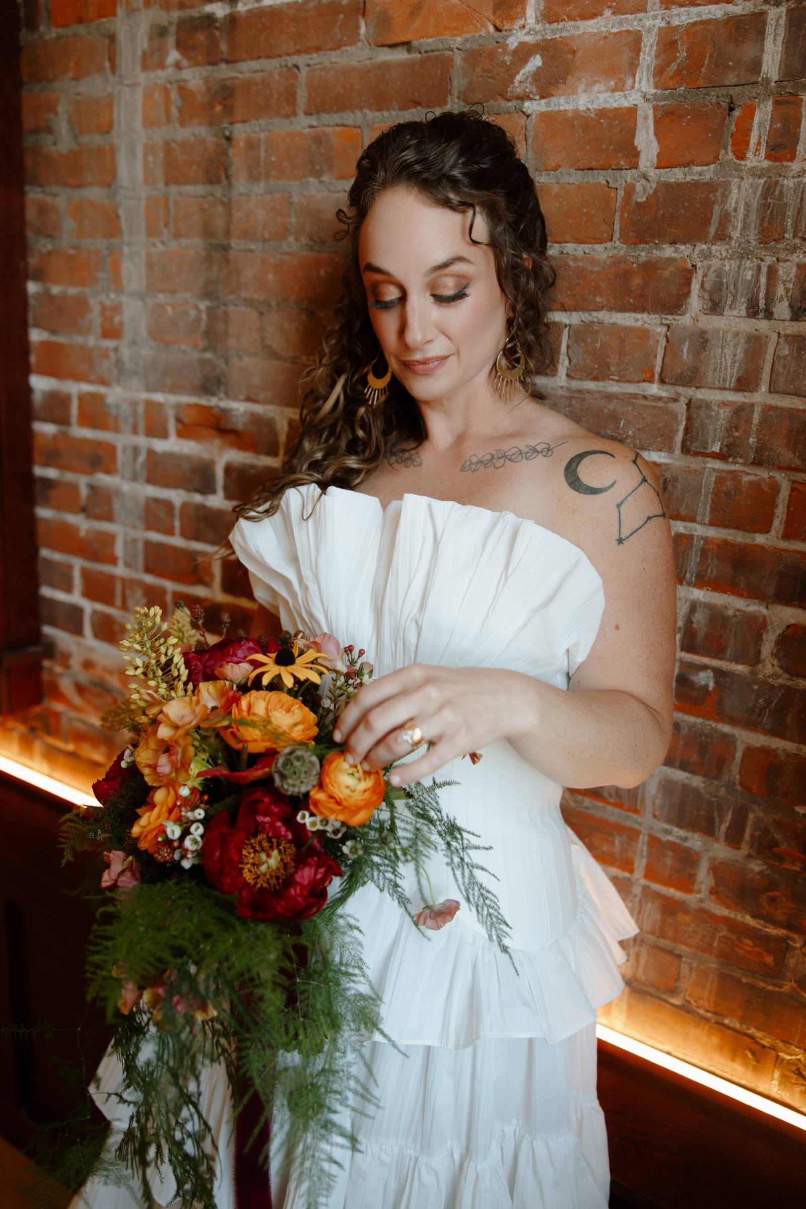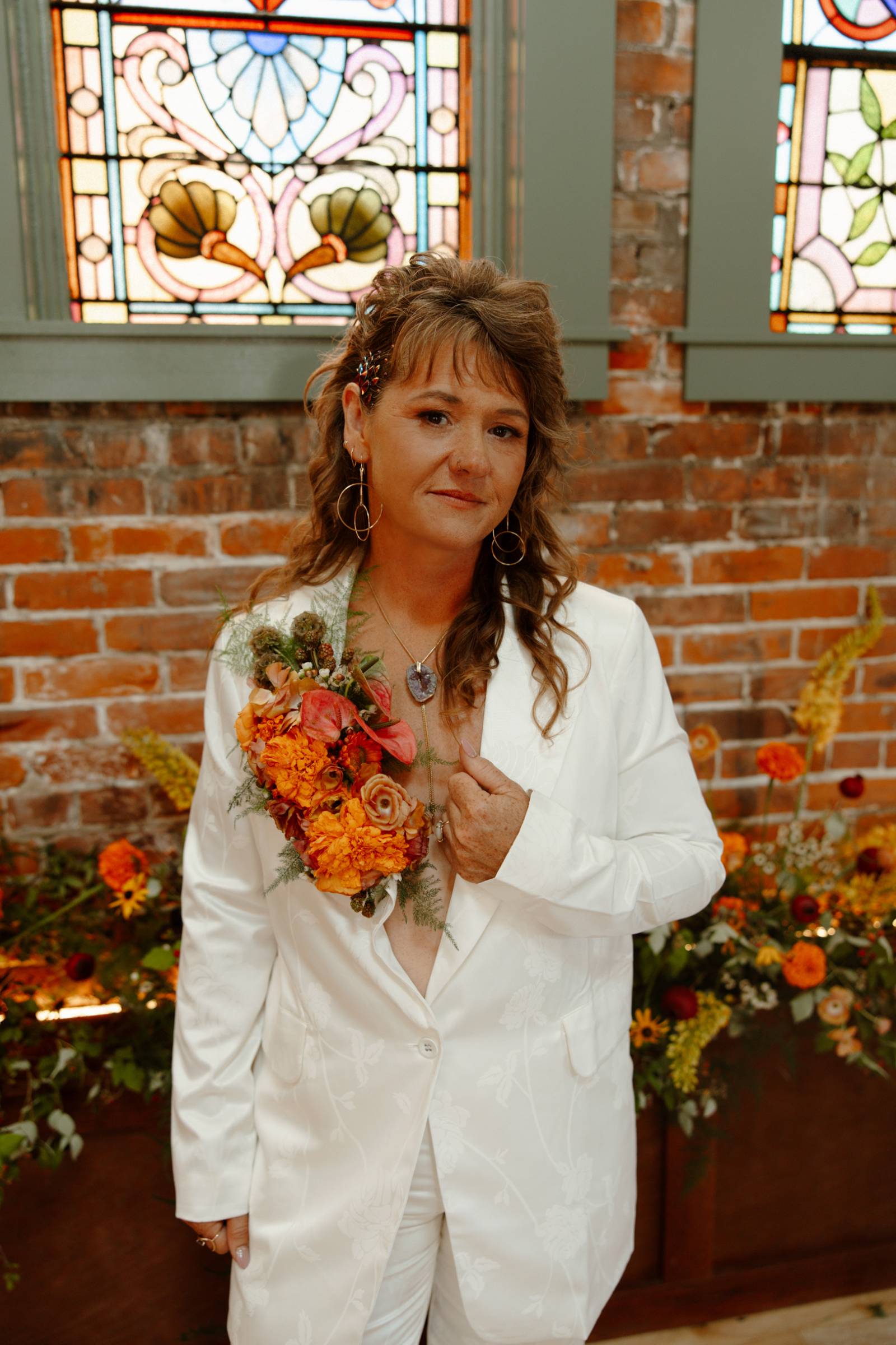 Floral pieces, including wearable florals, a bouquet, and decor, were composed of a warm, bold, and slightly wild aesthetic perfect for a modern wedding. Blooms included bright orange marigolds, red peonies, orange and yellow ranunculus, coral anthurium, black-eyed Susan, billy balls, goldenrod, fern greenery, and more.