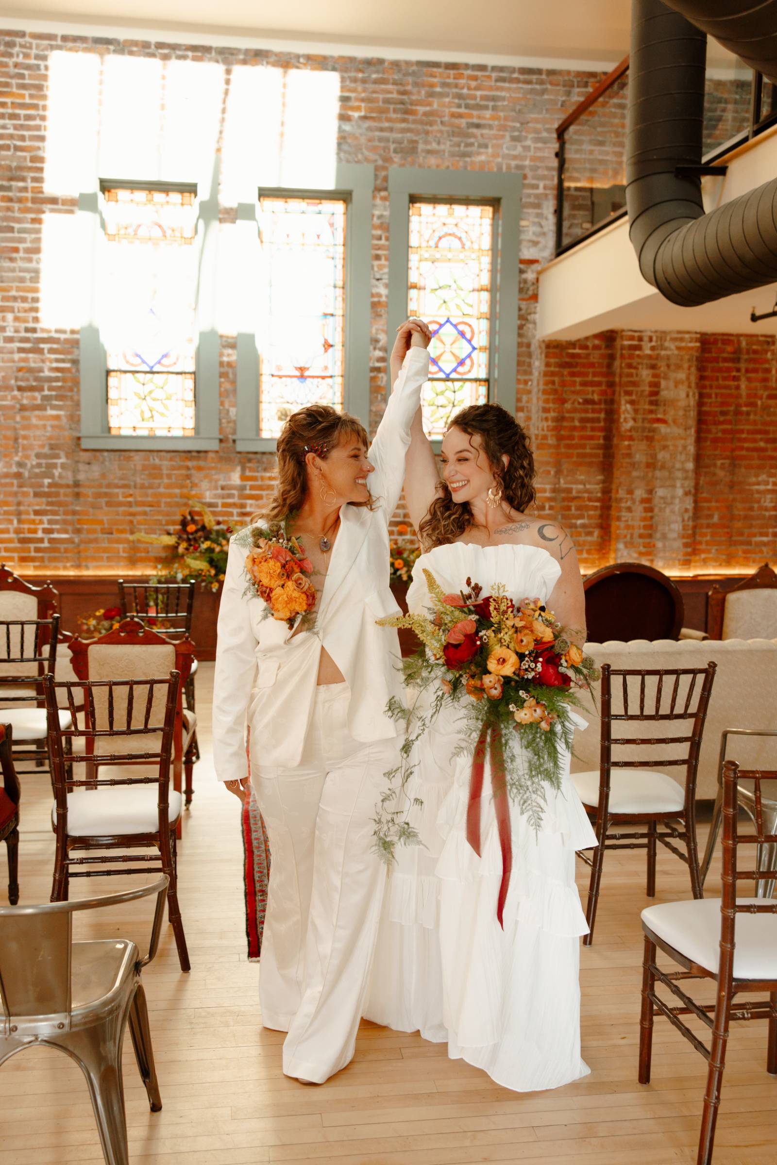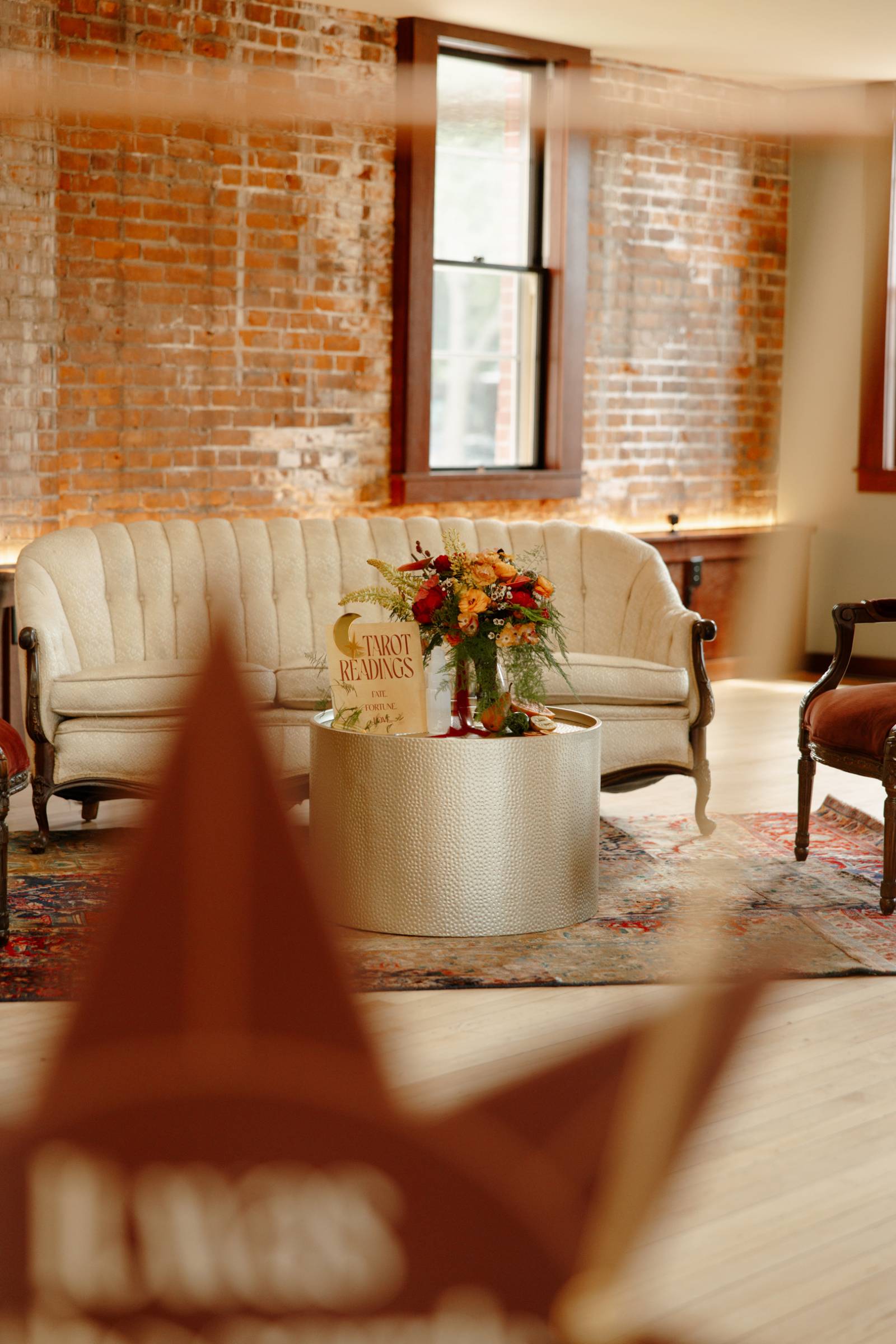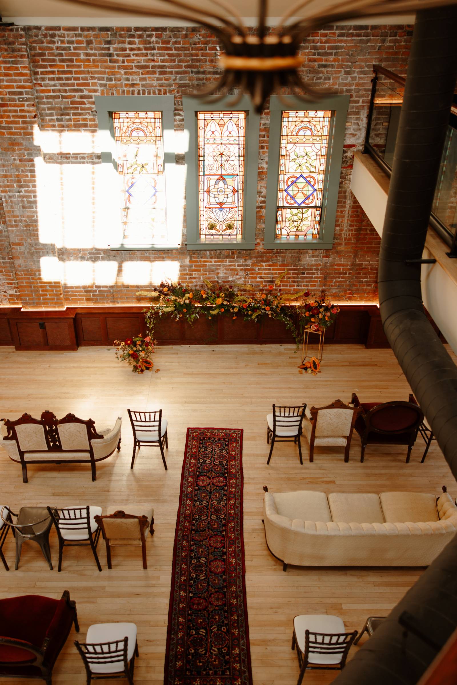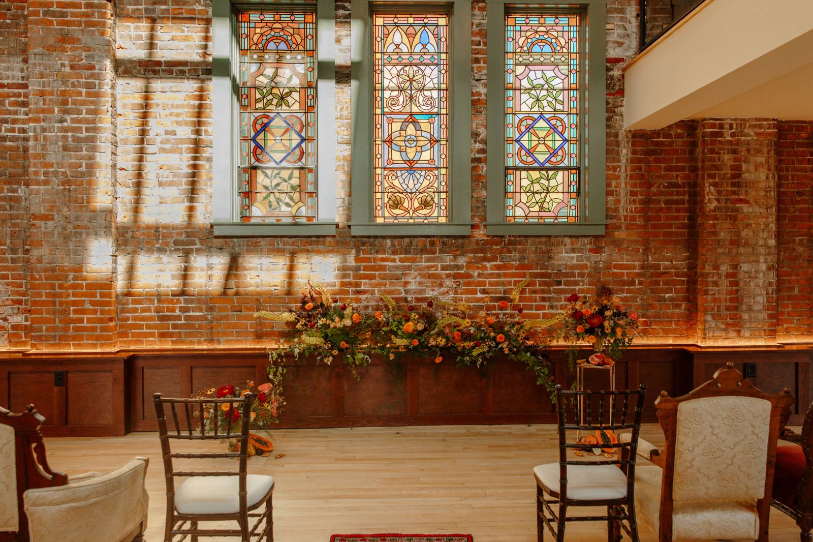 The ceremony was set against those very stained glass windows, further framed by wooden floors and paneling, brick walls, and a floral installation by Bloom & Knot. The couple walked down a carpeted aisle, lined by antique chairs, loveseats, and couches from Cappella Weddings & Events and Resource Vintage Rental.