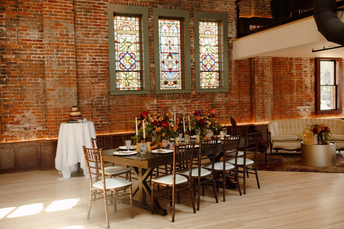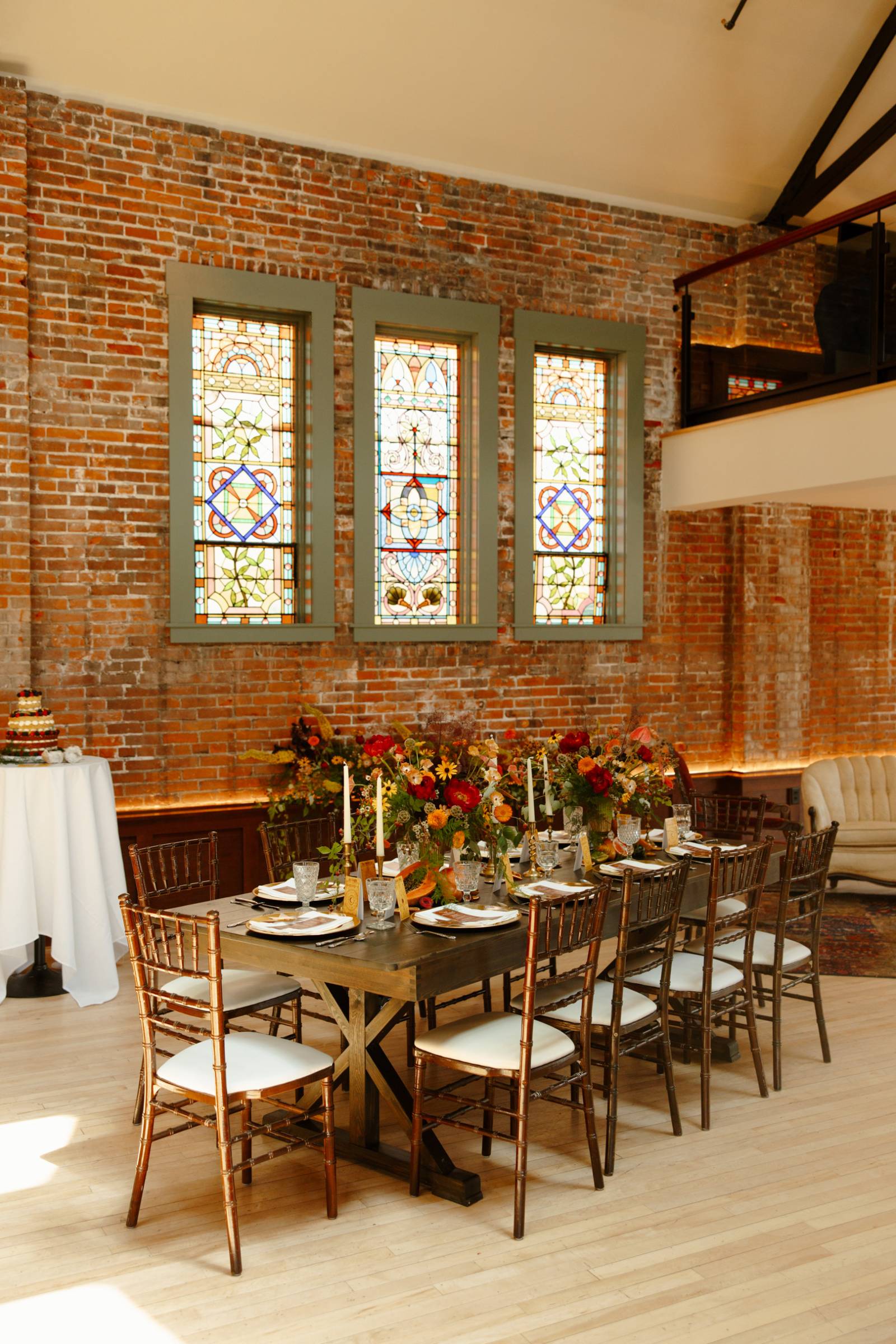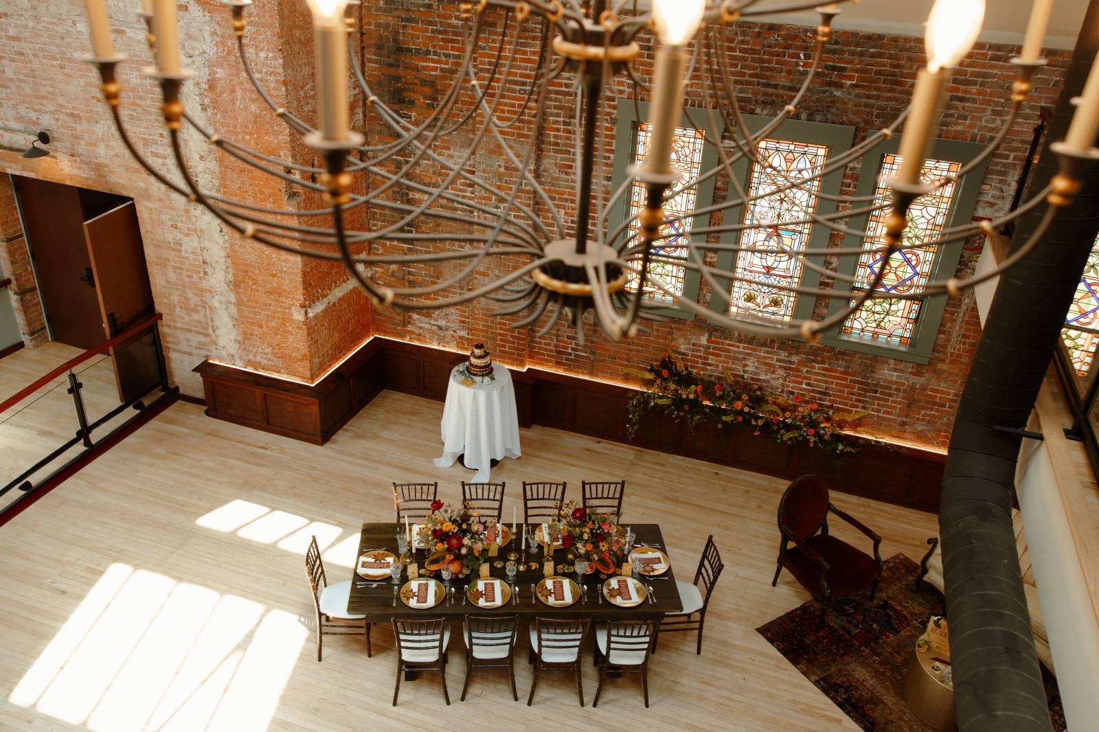 Serving as coordinator and designer, as well as a venue and providing rentals, Cappella Weddings & Events took the lead on this editorial masterpiece. Their original architecture dates back to 1886, when the building first served as the First Methodist Episcopal Church of La Crosse. Through many years and recent renovations, the venue has preserved its historic charm, vaulted ceilings, brick walls, and stained glass windows.