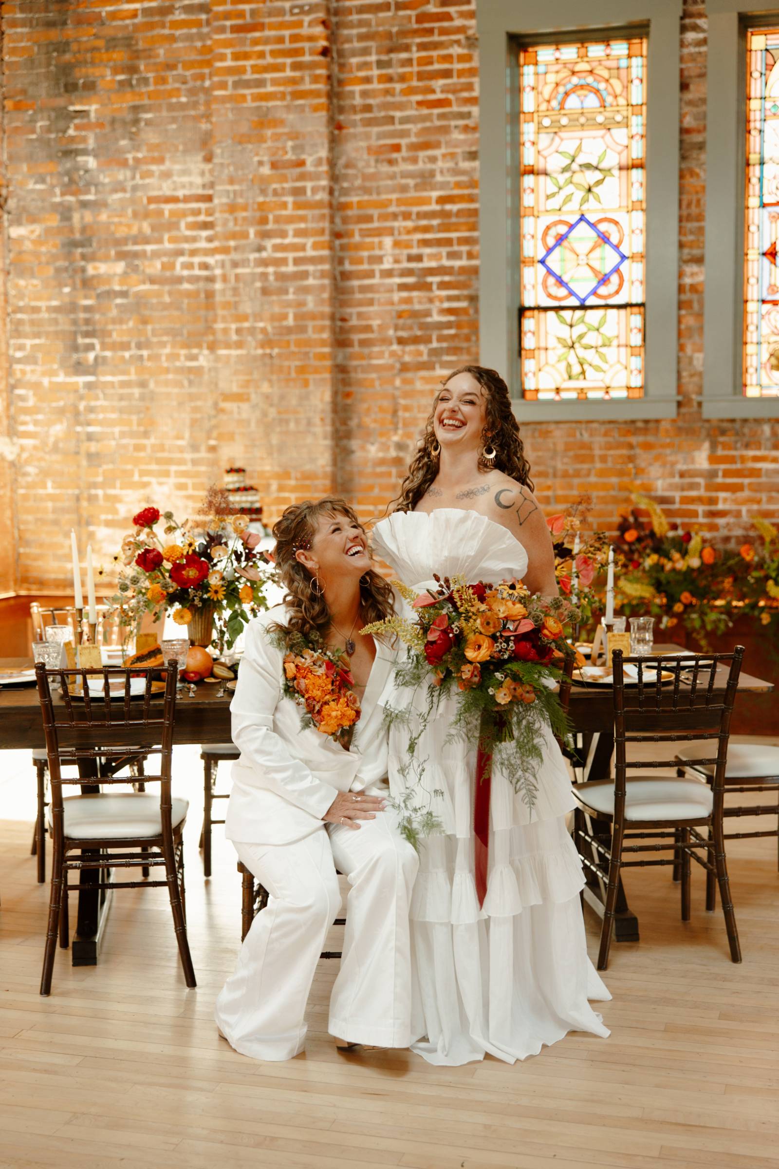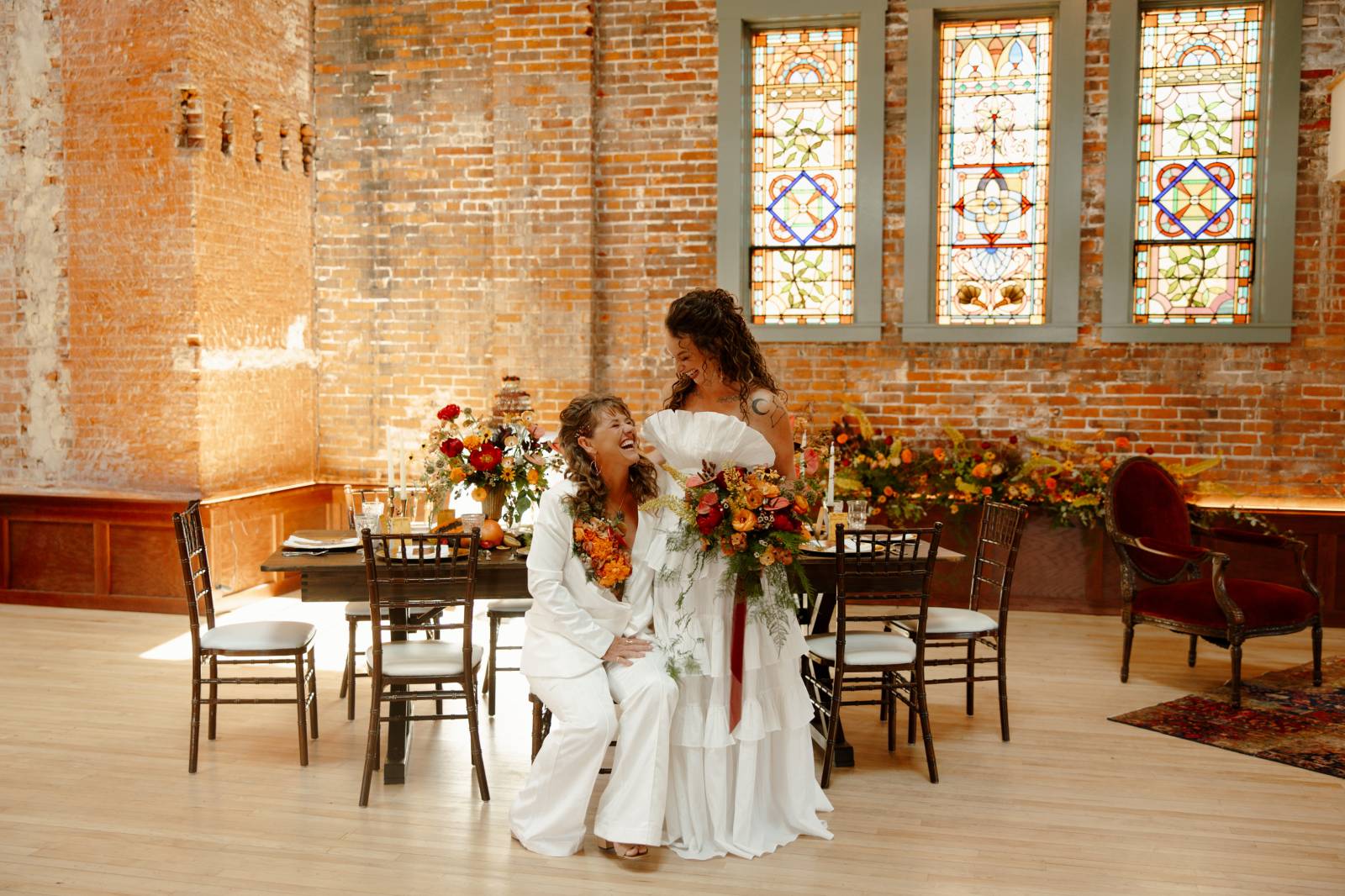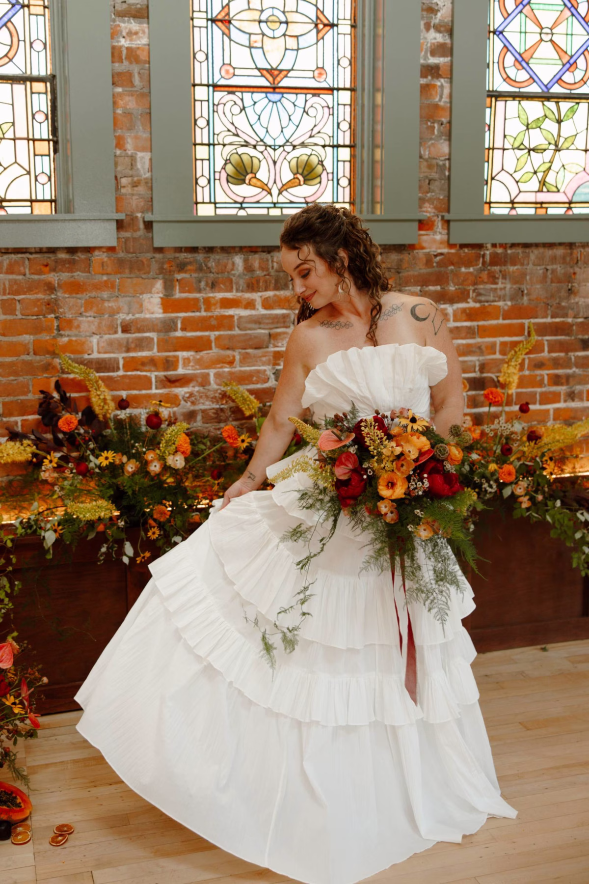 Serving as coordinator and designer, as well as a venue and providing rentals, Cappella Weddings & Events took the lead on this editorial masterpiece. Their original architecture dates back to 1886, when the building first served as the First Methodist Episcopal Church of La Crosse. Through many years and recent renovations, the venue has preserved its historic charm, vaulted ceilings, brick walls, and stained glass windows.