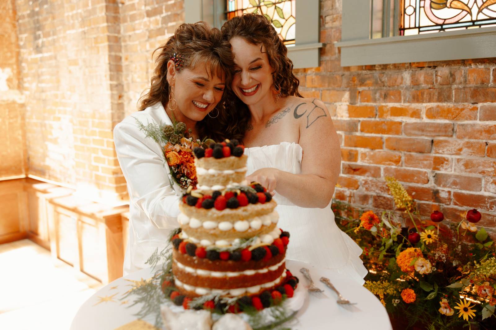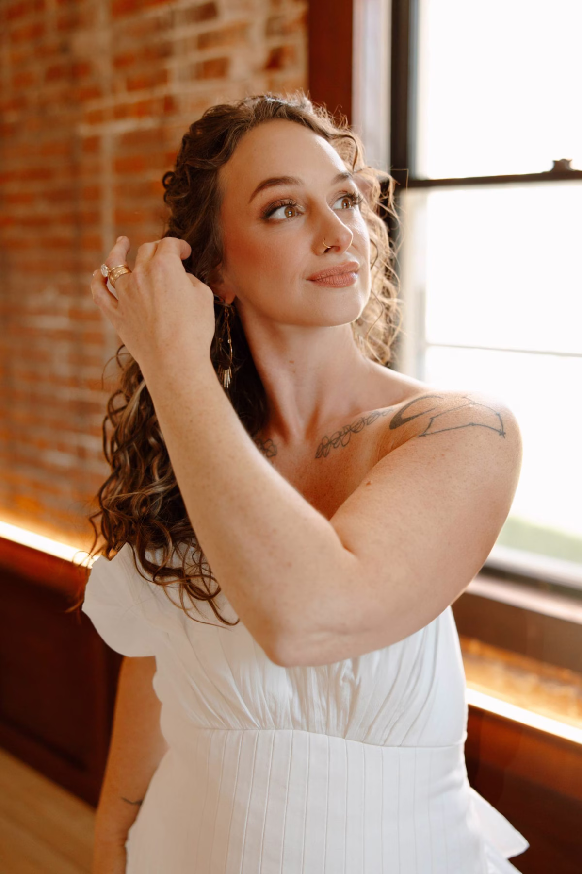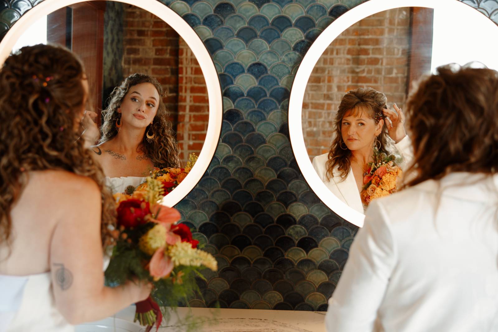 Hair Dressed by Kristyn focused on natural waves and volume for the brides–and a hint of whimsy. Jenna’s hair was curled and styled away from her face, except for her bangs. For a little edge, hair rhinestones were arranged above her ear. Hair dressed by Kristyn accentuated Cailee’s natural curls, adding shine and custom extensions, securing her hair back in a half-updo.