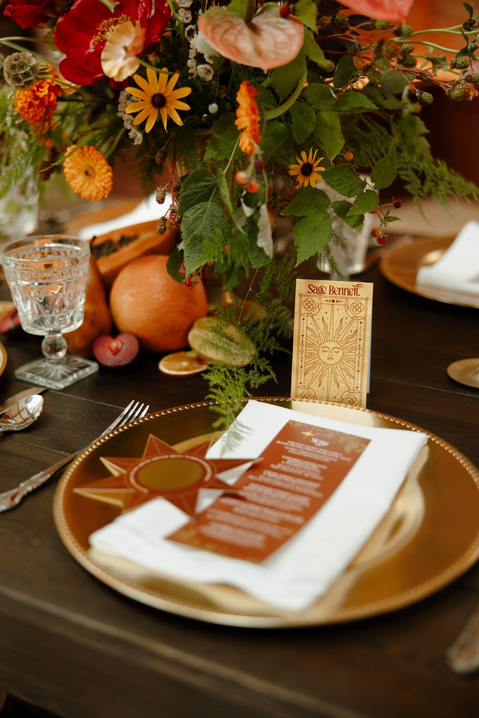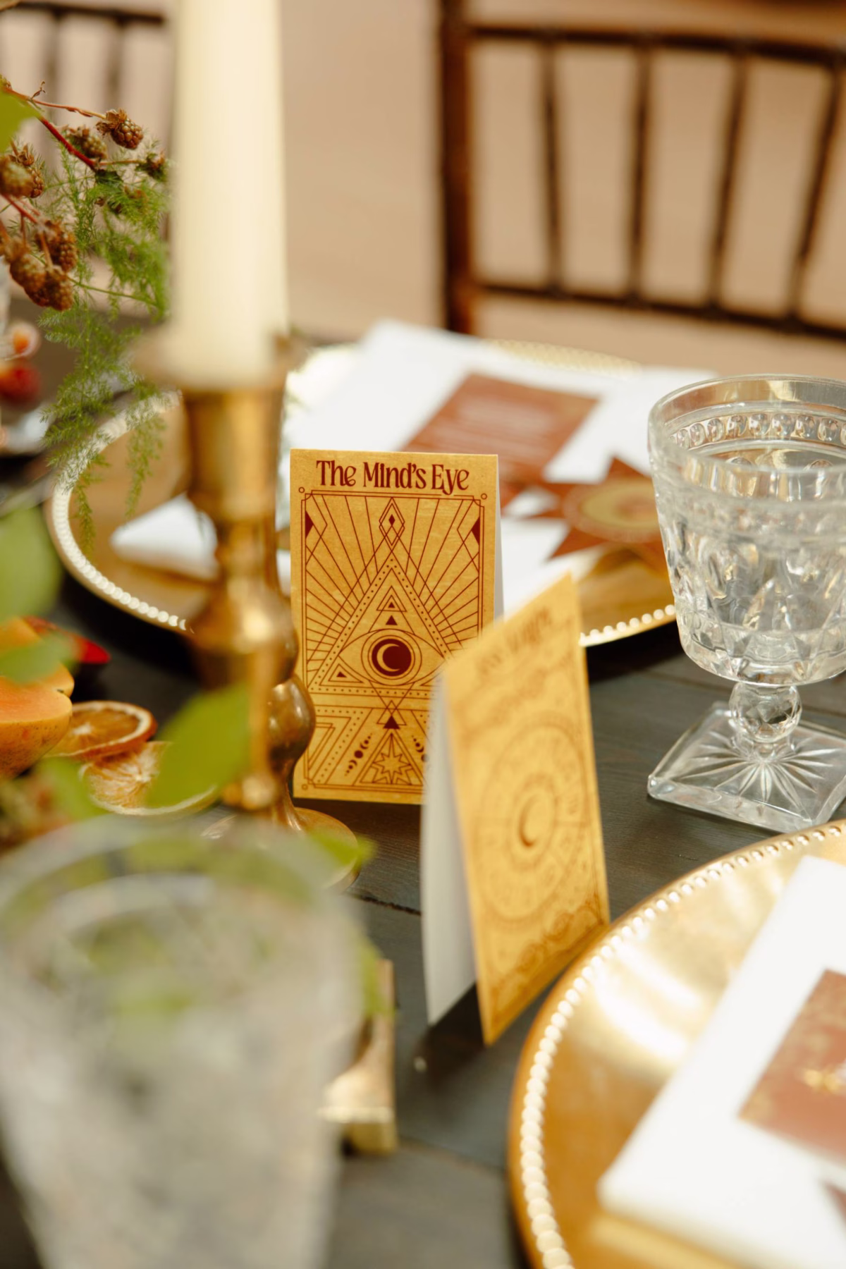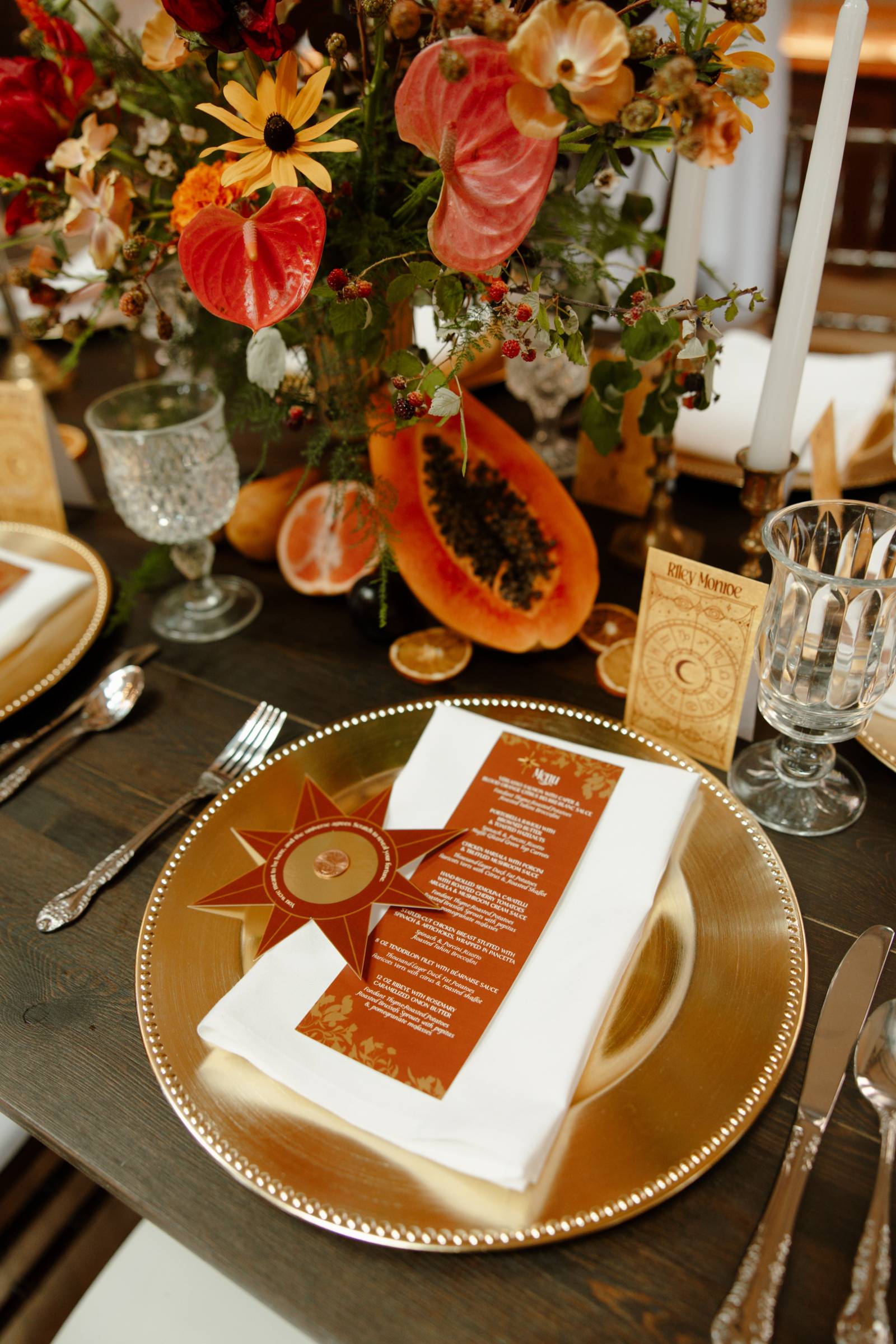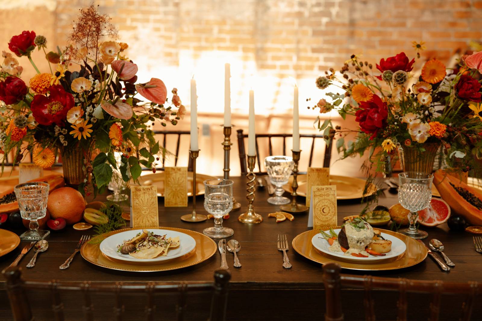 The theme continued at the tablescape, with Bloom & Knot crafting floral centerpieces that also included freshly cut fruit. Other decor elements included candles, gold plates, tarot card name cards, silverware, and crystal glassware.