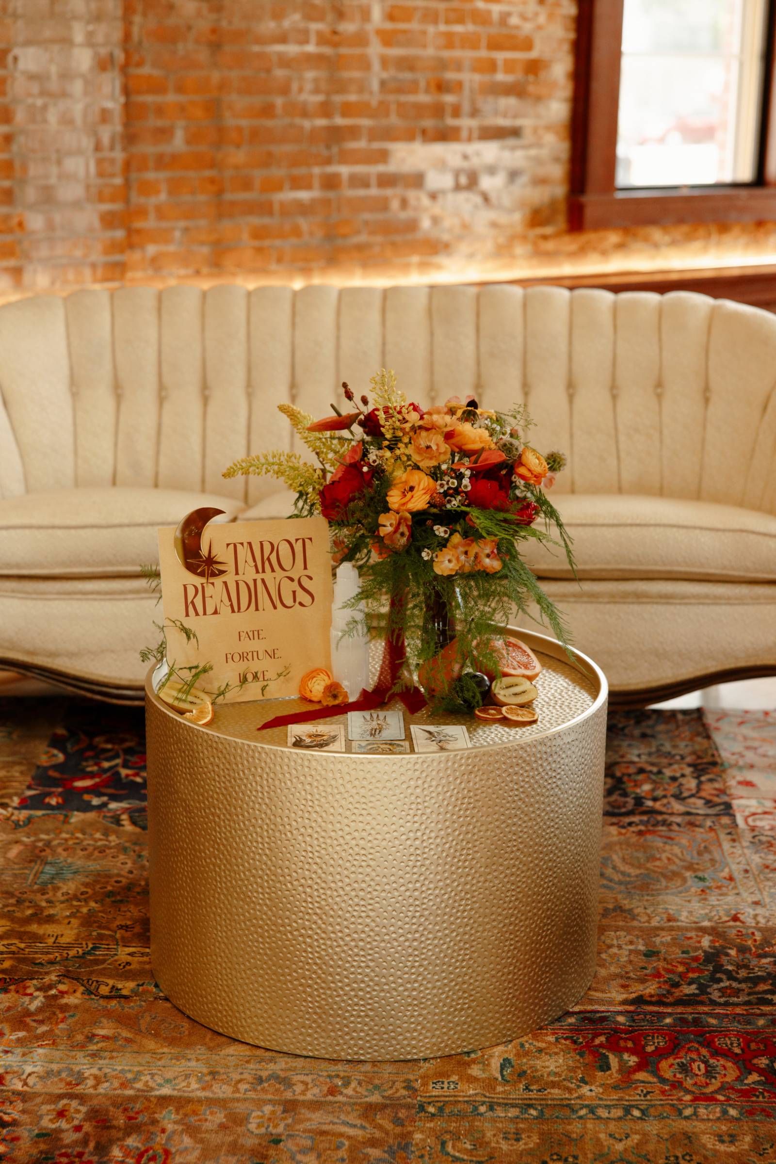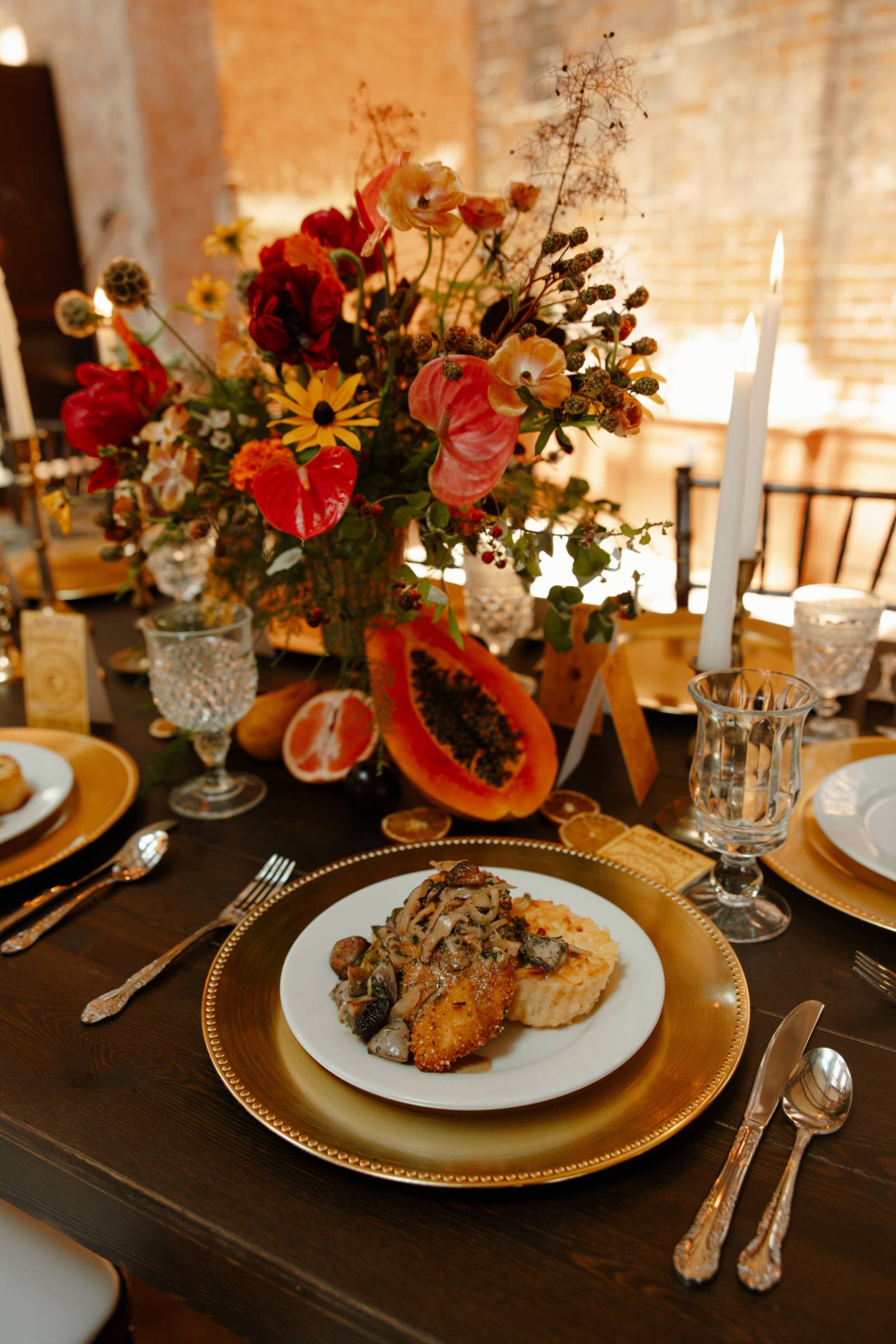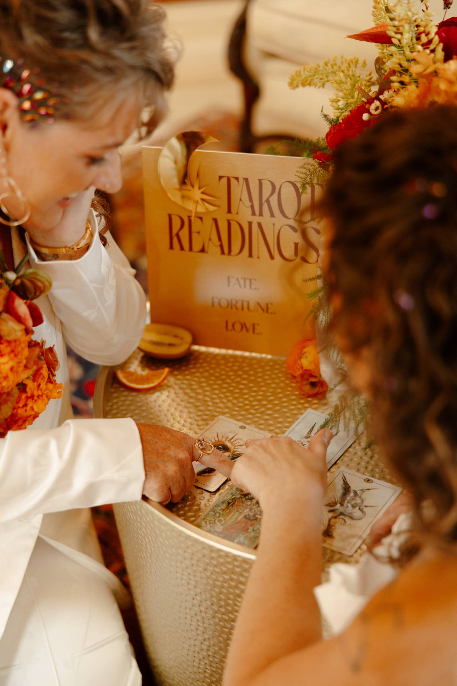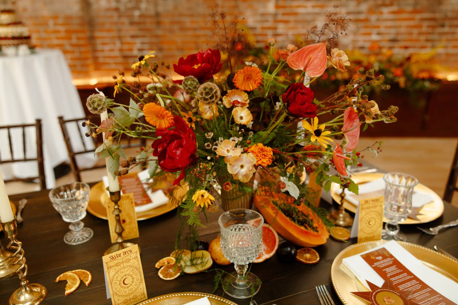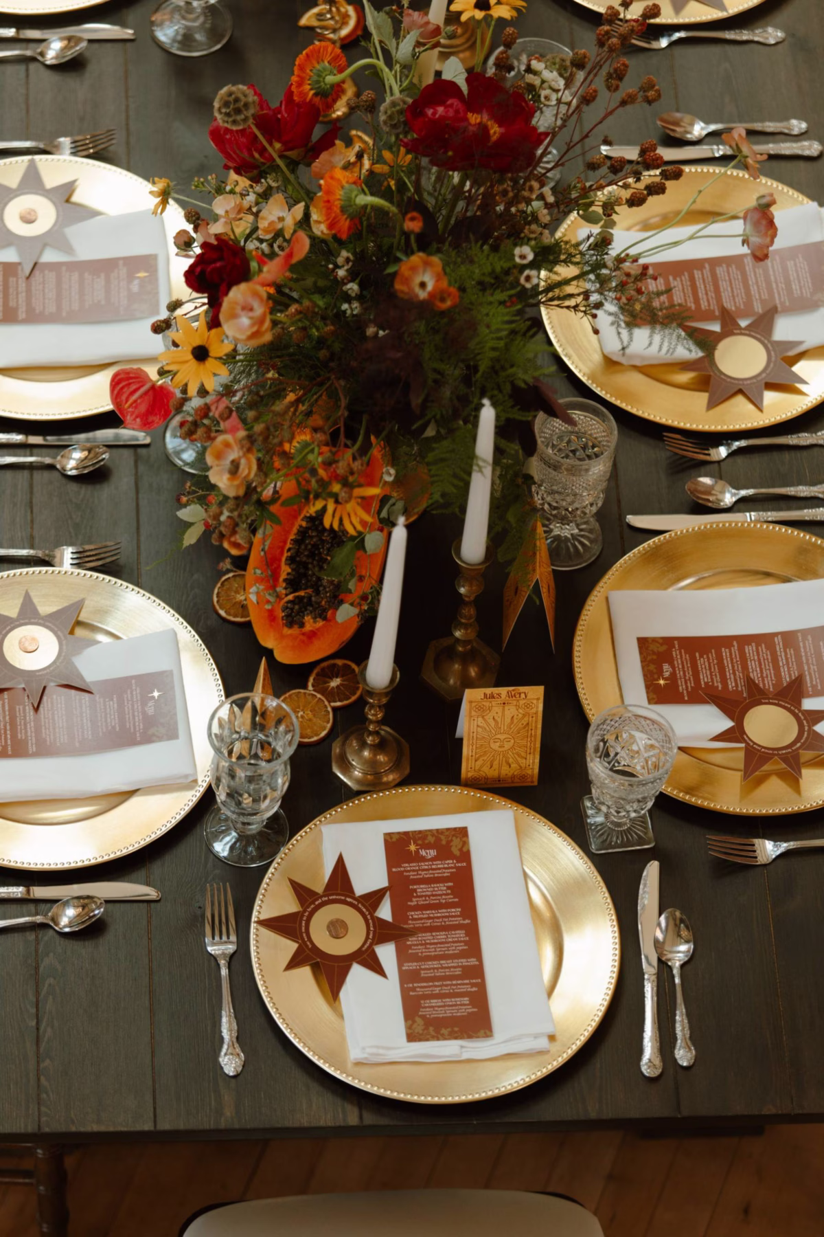 The theme continued at the tablescape, with Bloom & Knot crafting floral centerpieces that also included freshly cut fruit. Other decor elements included candles, gold plates, tarot card name cards, silverware, and crystal glassware.