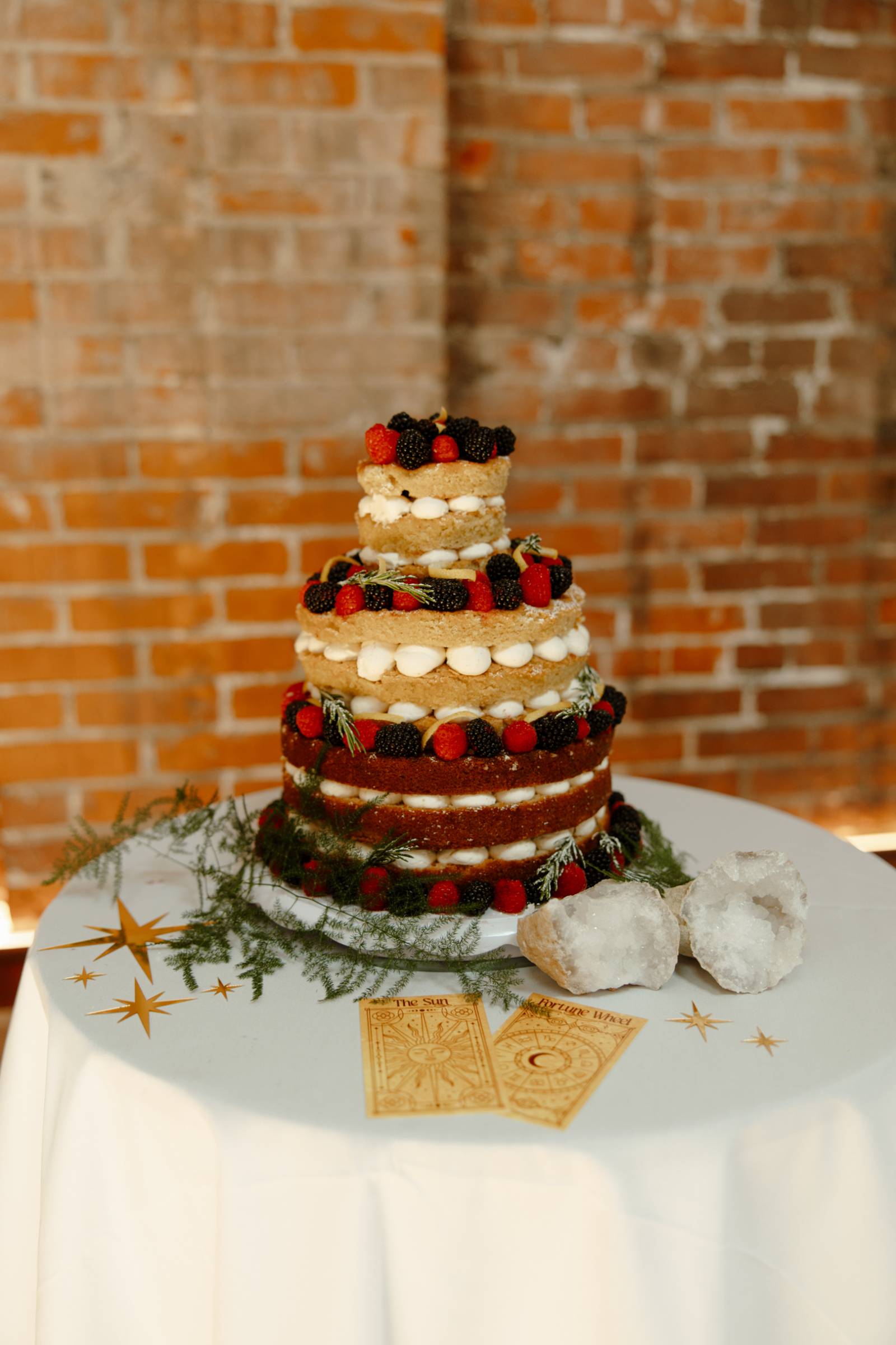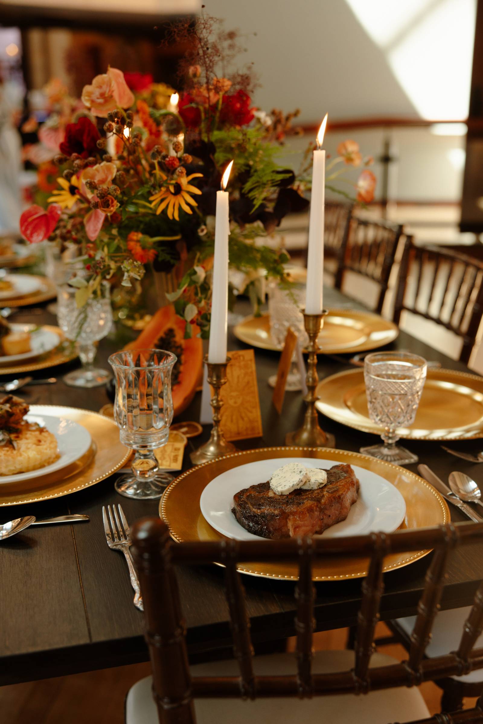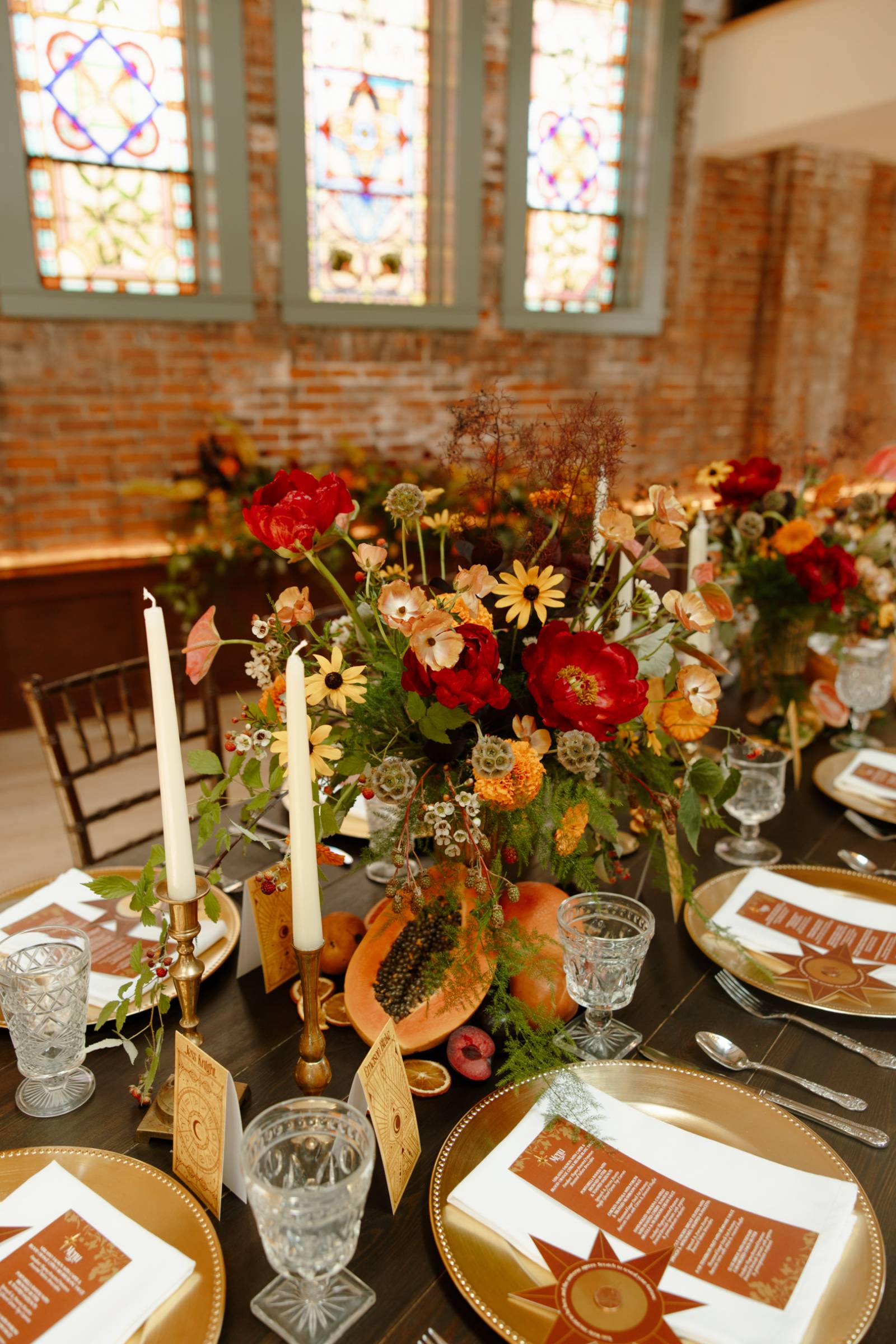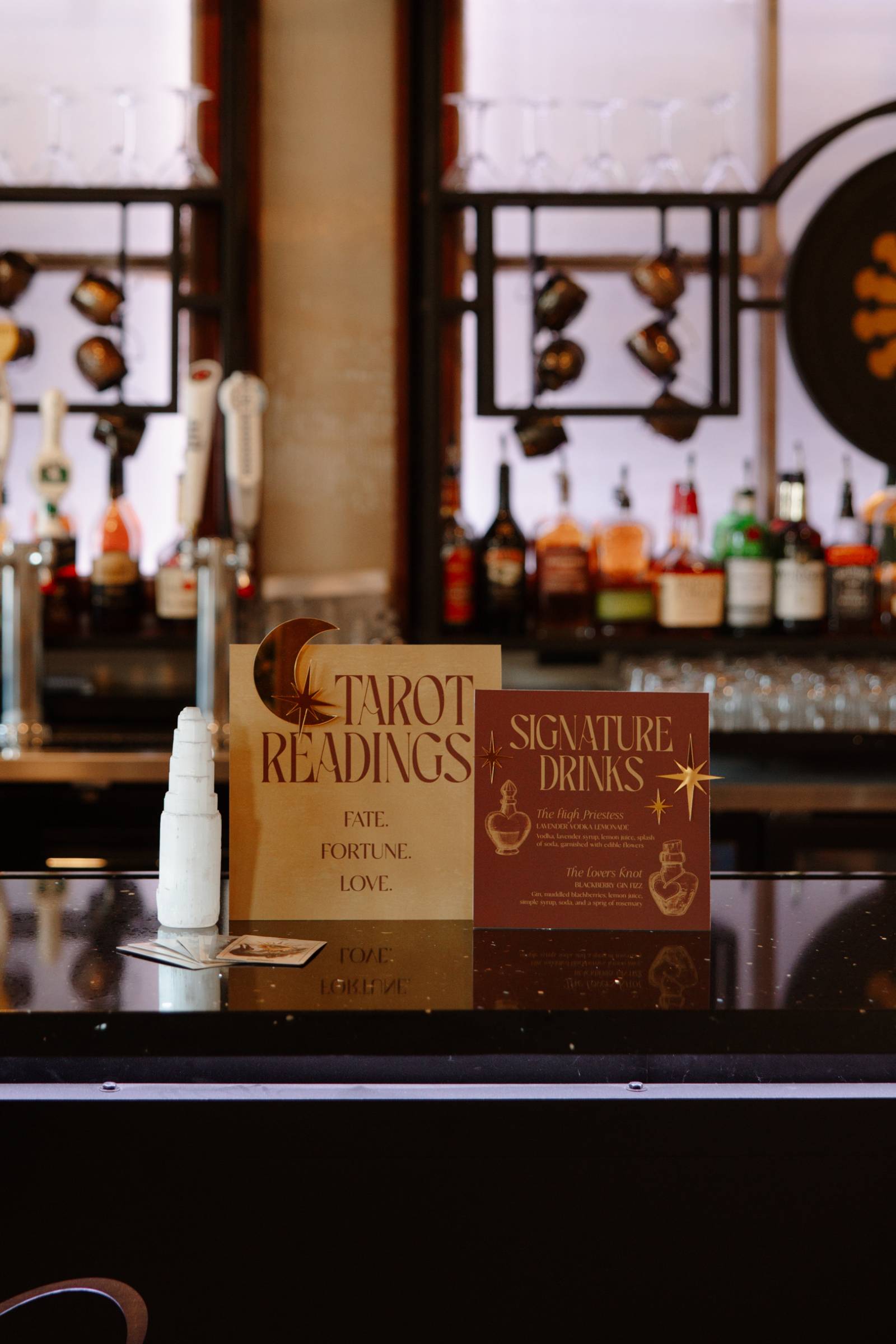 The theme continued at the tablescape, with Bloom & Knot crafting floral centerpieces that also included freshly cut fruit. Other decor elements included candles, gold plates, tarot card name cards, silverware, and crystal glassware.