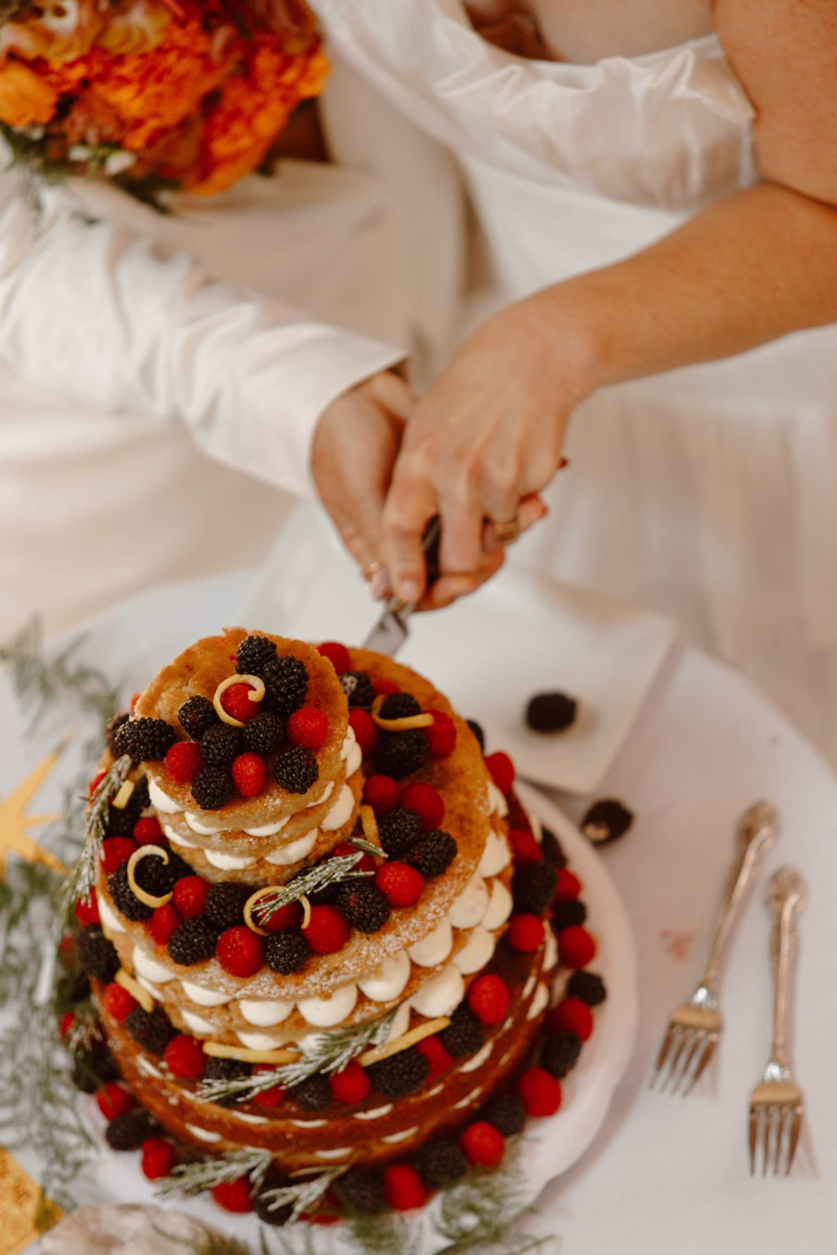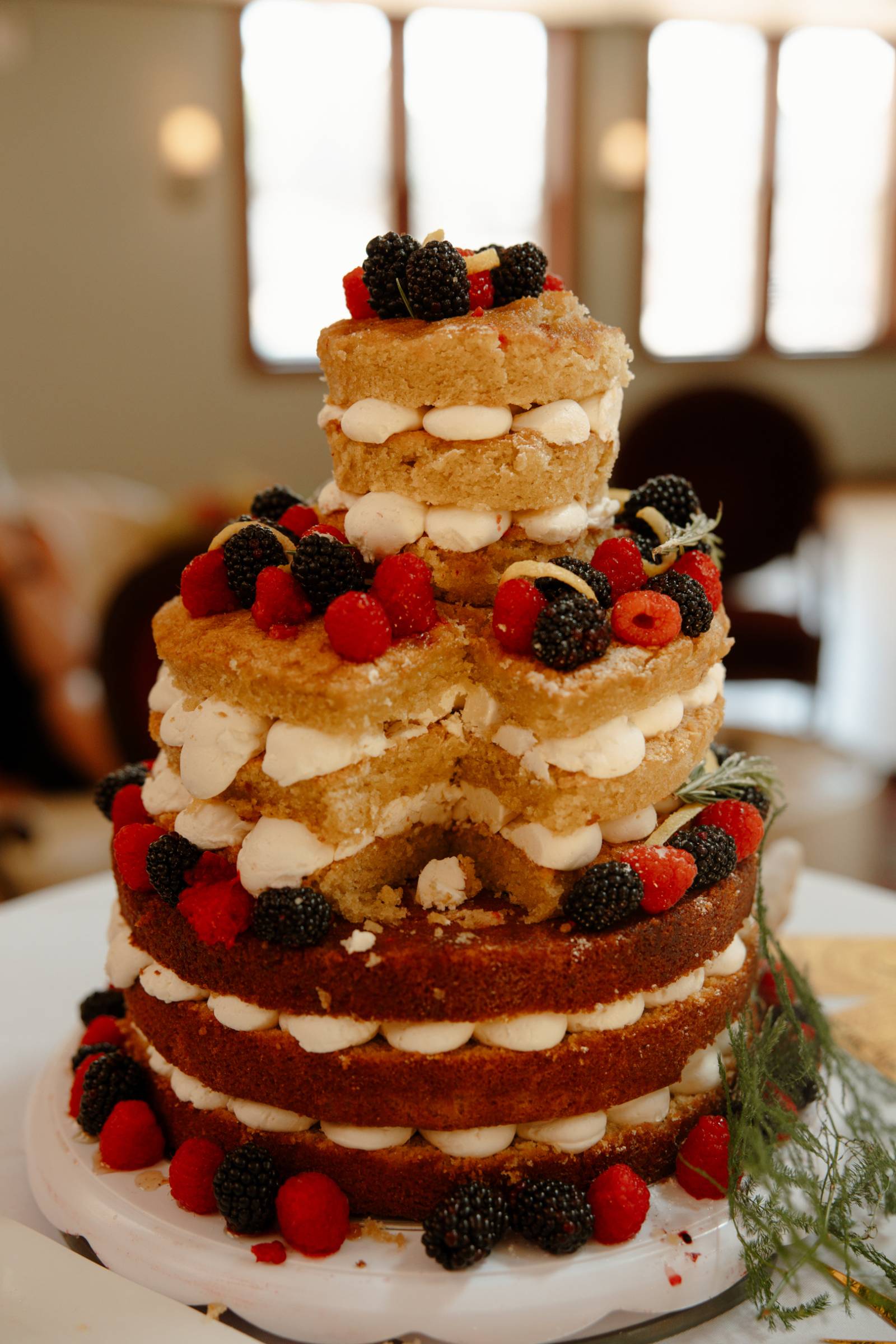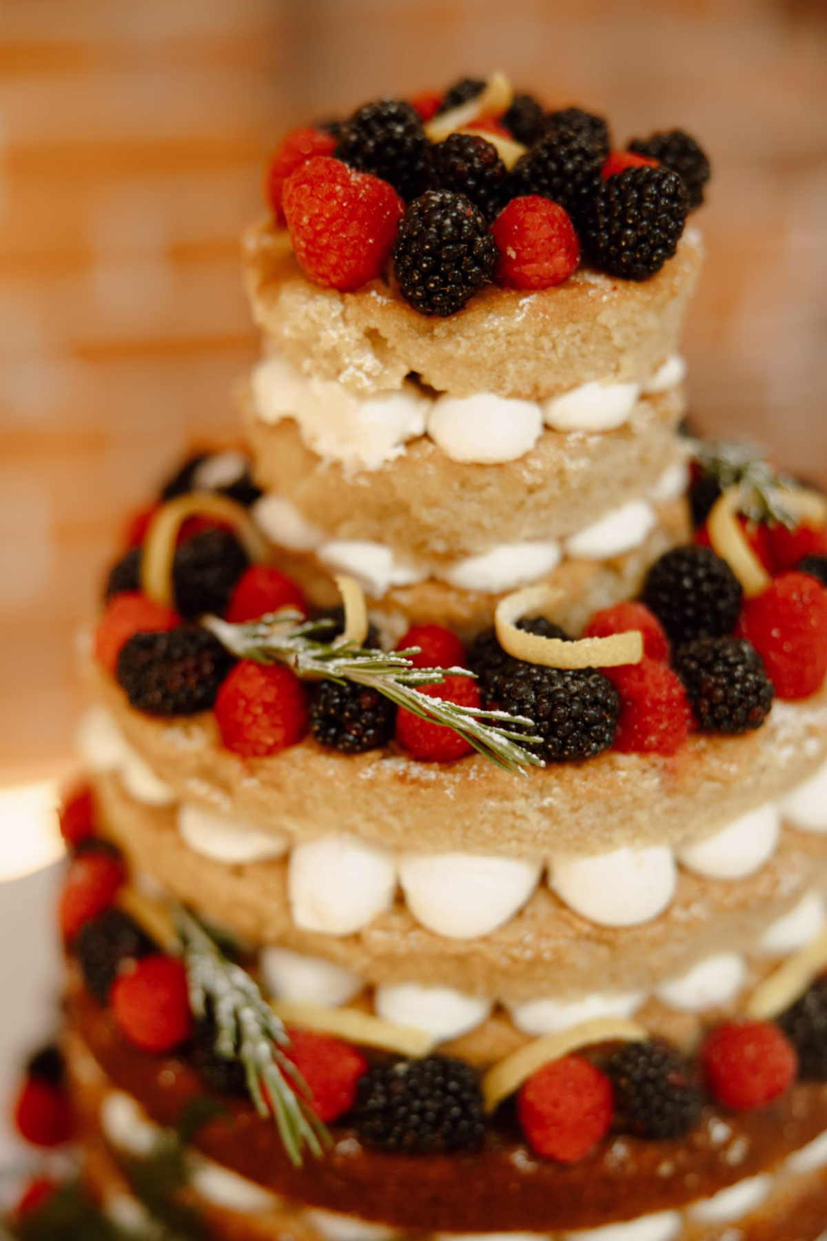 At the dessert table, Apothik Catering provided a gorgeous, non-traditional, layered cake with generous frosting between thin layers of chocolate and vanilla. Raspberries and blackberries adorned each tier of the dessert.