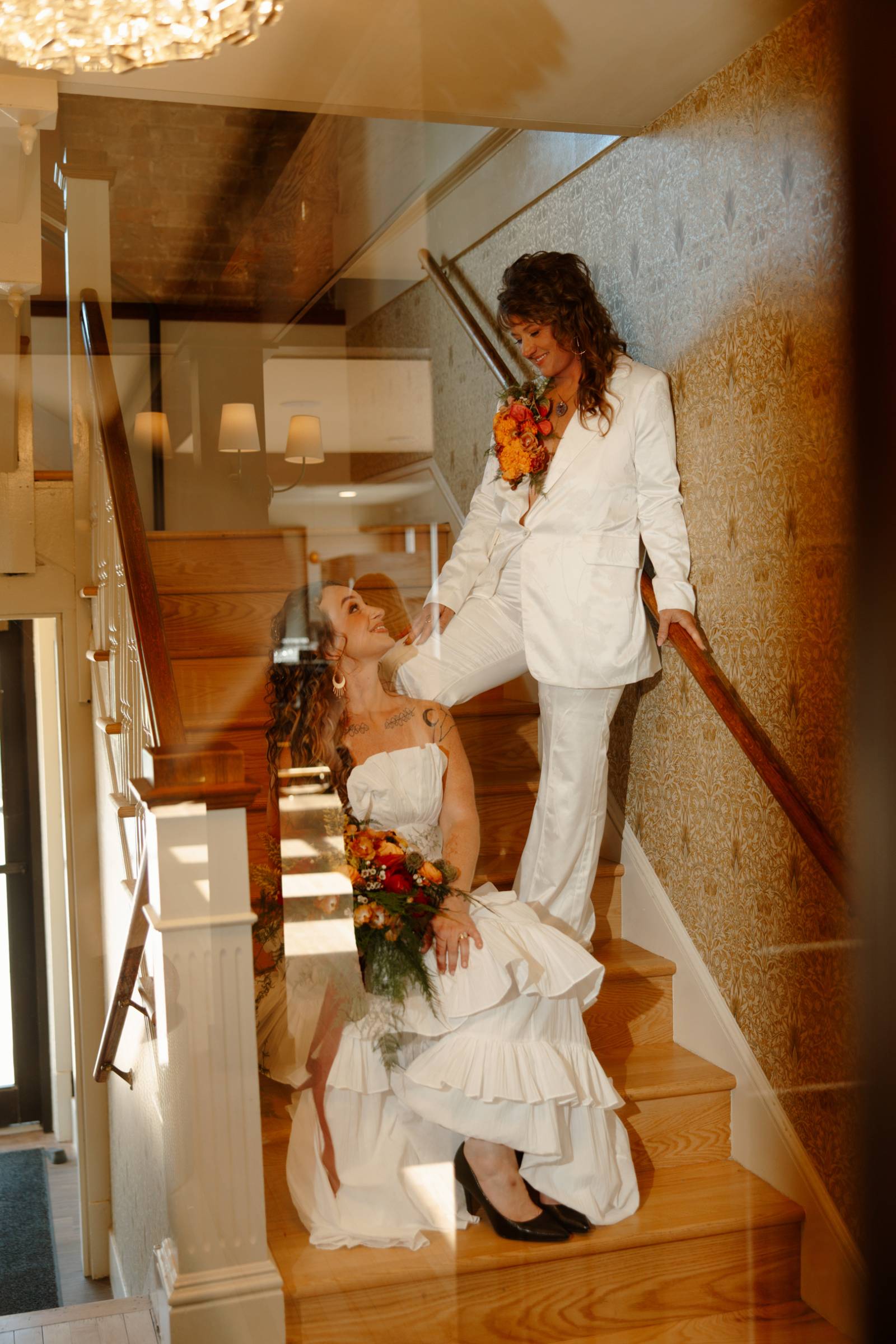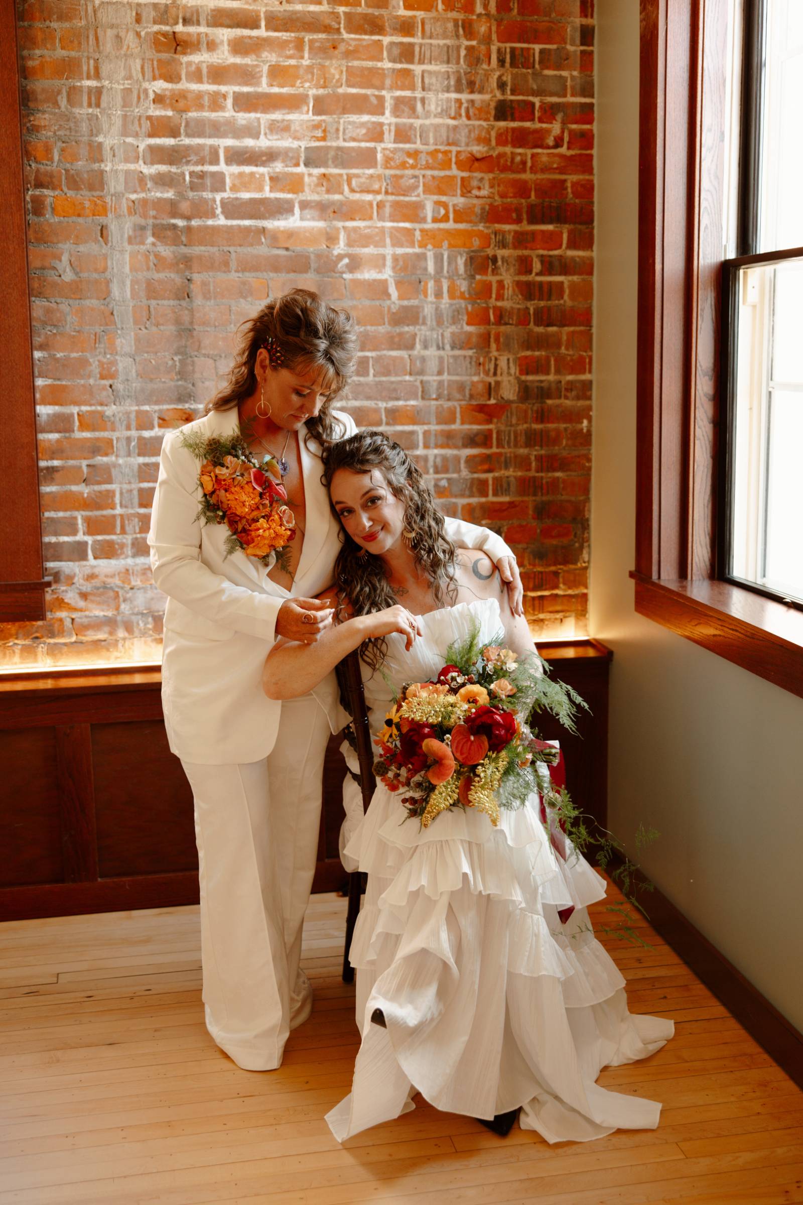 Sincerely Yours Studios selected distinct fashions for the brides, starting with a fashionable, white suit for model Jenna. Shirtless blazers are trending, worn either buttoned or unbuttoned. A single button secured Jenna’s suit, which also featured an oversized floral lapel on her right side. The overall fit of the suit was casual yet formal, oversized, with wide-leg pants accented by nude, heeled sandals.