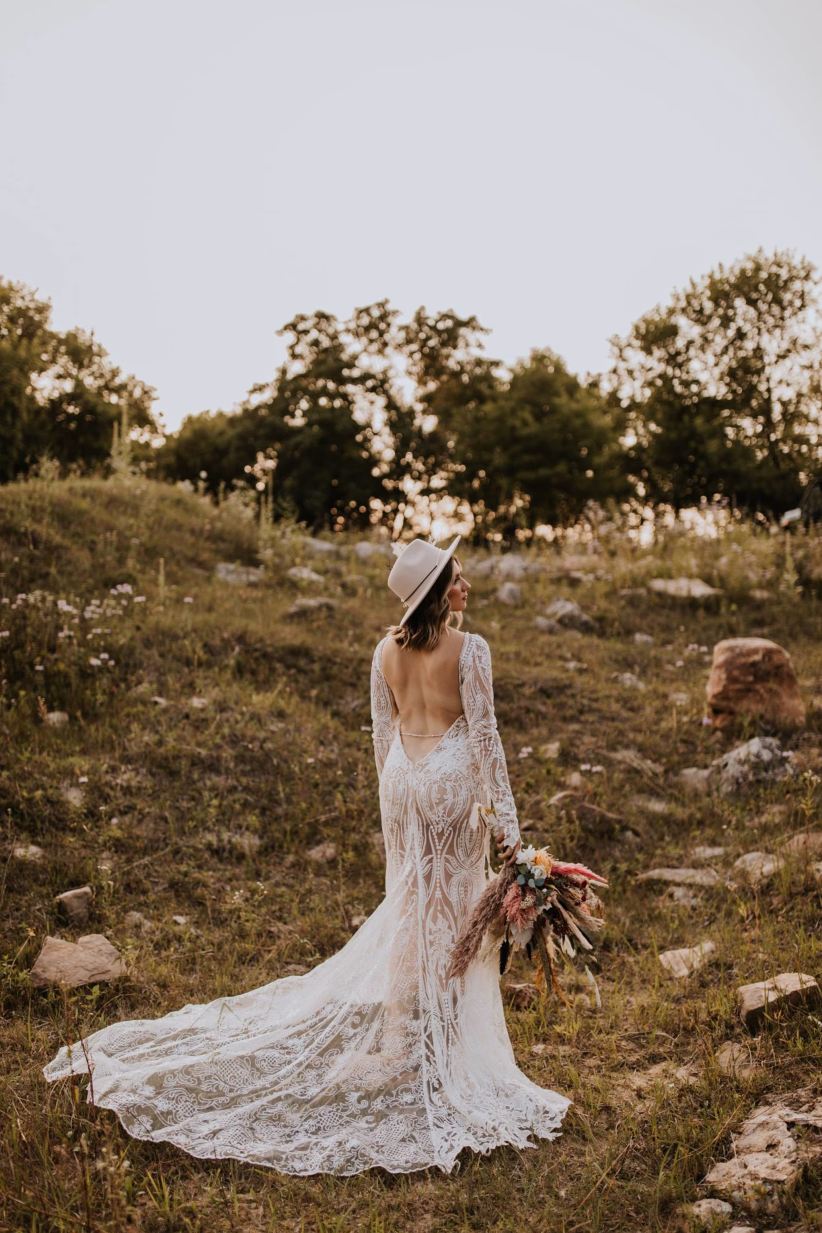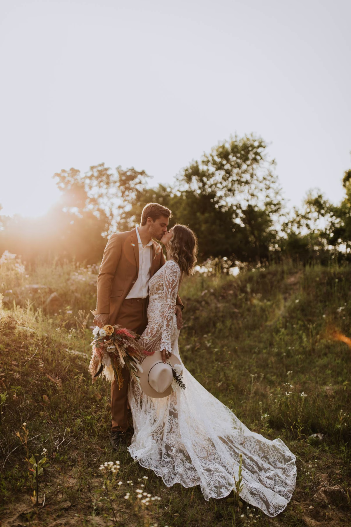 Our bride was a vision in her long-sleeved, open-backed gown from Charlotte’s Bridal & Formal Wear. Accessorized with a felt hat adorned with a wispy floral accent, and the entire look was fit for a boho queen on her big day. Our groom, also outfitted by Charlotte’s Bridal & Formal Wear, embraced a warm, rust-toned suit for the celebration.