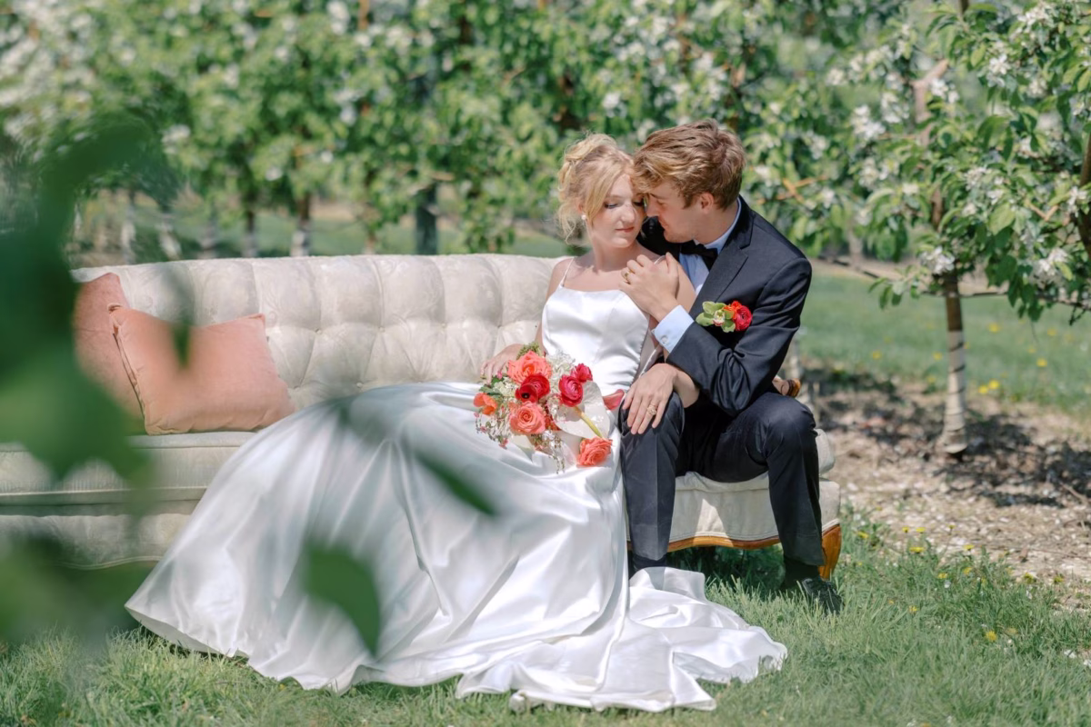 e beautiful, sunny day. Resource Vintage Rental “Bliss” sofa stood out among the orchard trees, and pink throw pillows matched the bride’s bouquet.
