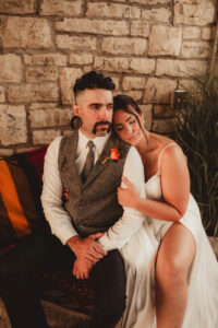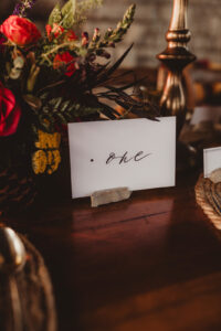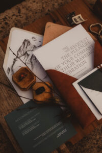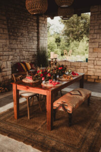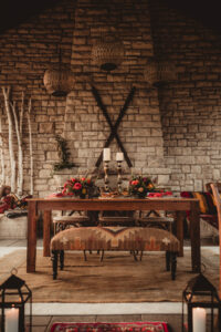 Resource Vintage Rentals brought their expertise, creativity, and impeccable taste to the design and coordination of this mountain luxe wedding inspiration. Their thoughtfully curated selection of unique rentals elevated every corner of the space. Every detail – from rustic harvest tables to stunning rugs and textiles, velvet chairs, leather sofas, and artful decorative accents – created a warm, inviting atmosphere rooted in the great outdoors.