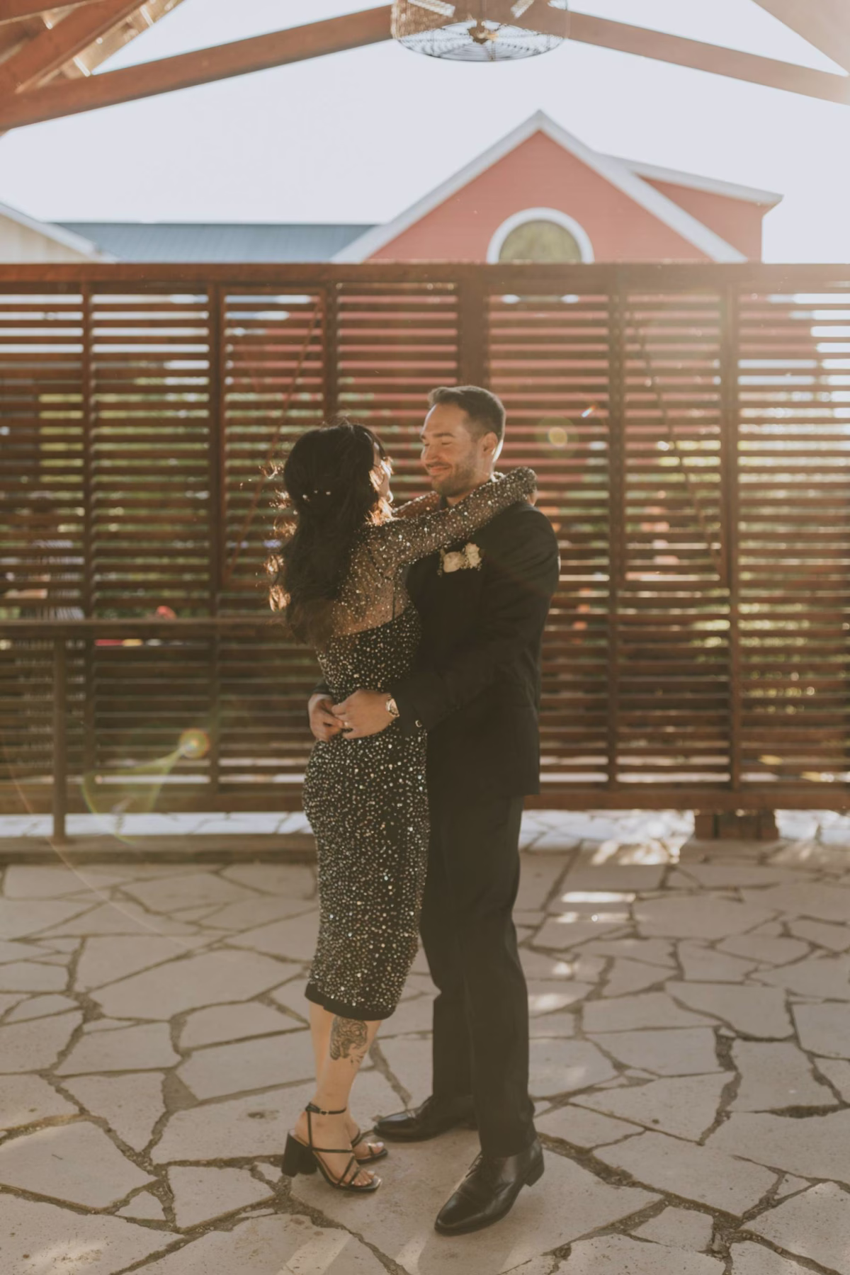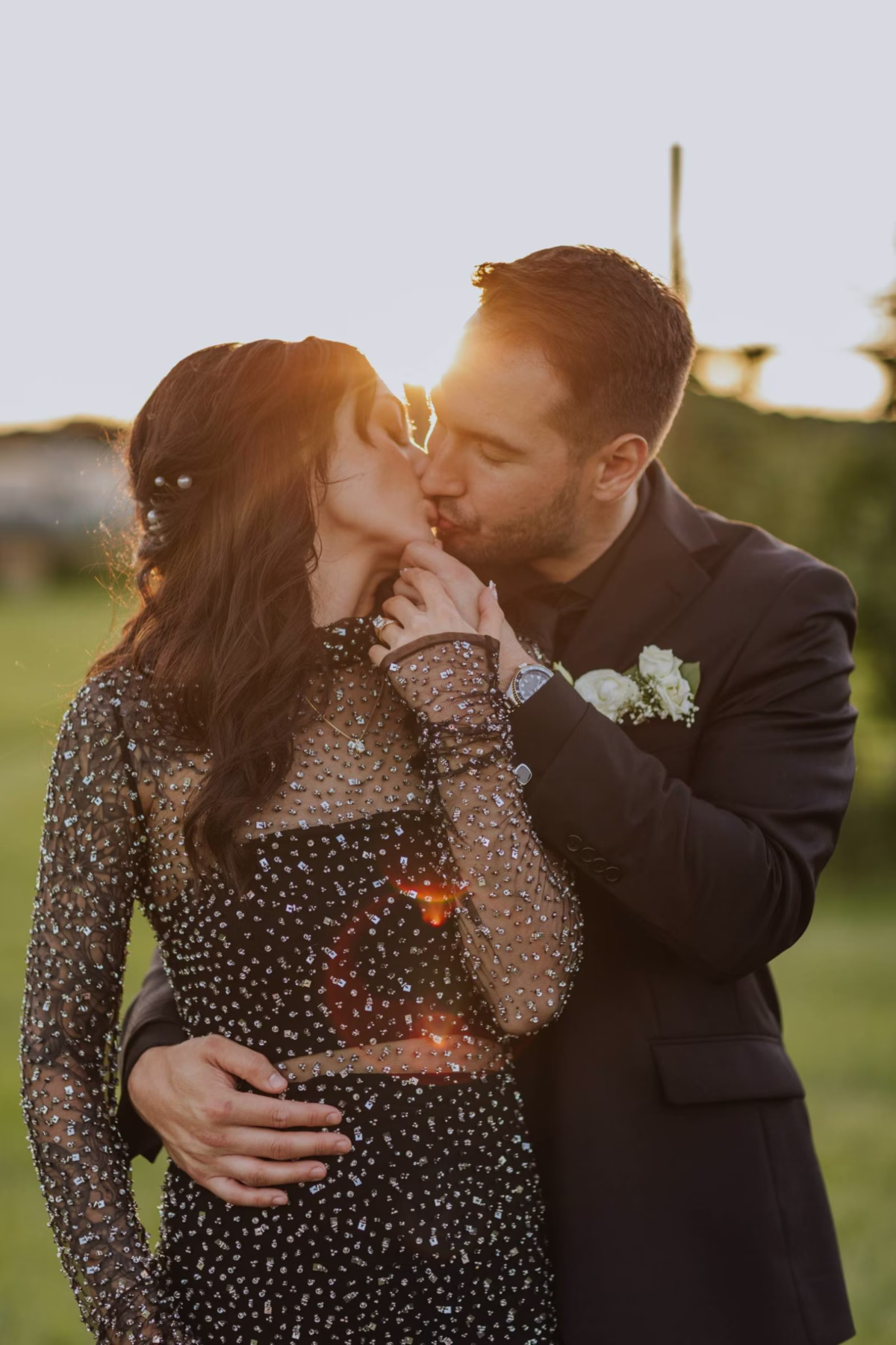 Pamperin Salon & Spa styled hair and makeup looks that transitioned effortlessly from the ceremony to Abbey’s second look, a high-neck, mesh, black dress with a crystal overlay. Abbeys wore a half-updo, with volume and soft waves, secured by dainty pearl clips. Her makeup was subtle and smoky, with soft brown eyeshadow, thick lashes, and a dark, natural lip.