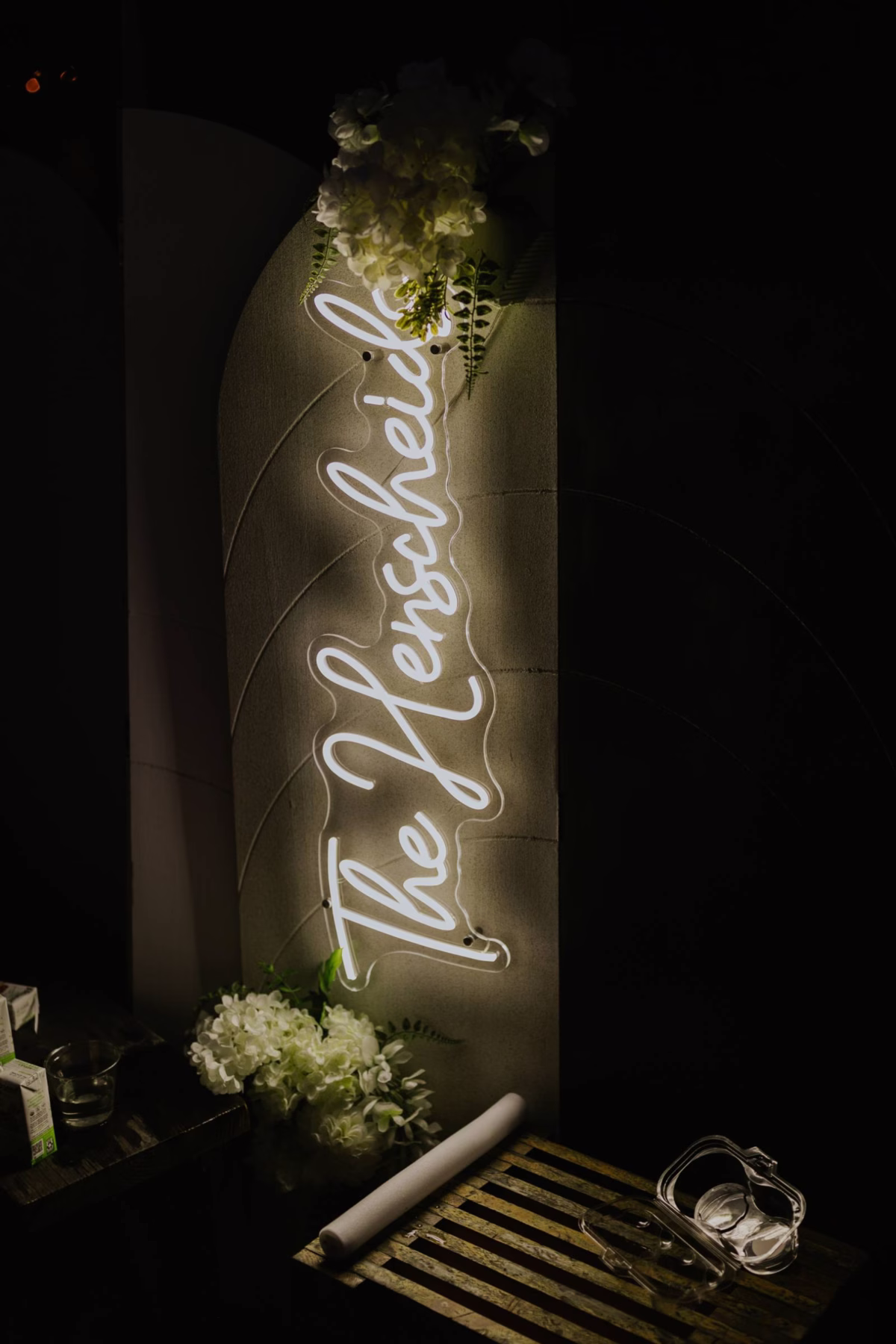 Details at the tented reception included plenty of florals, neon signage, rustic chandeliers, teacups, crystal glassware, and candles. The couple also included a memorial table as a special way to include departed friends and family in the celebration.