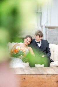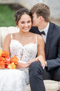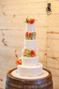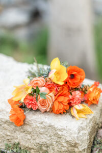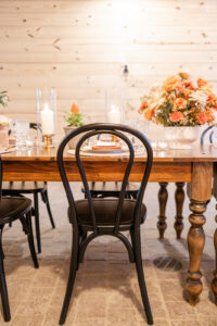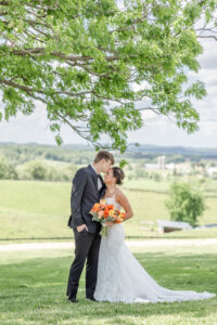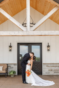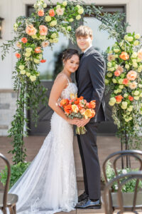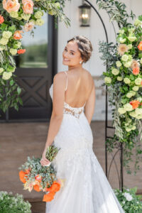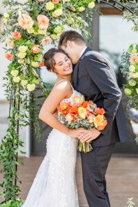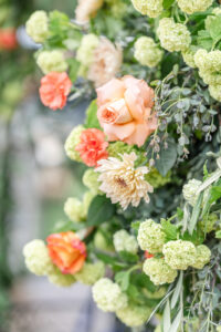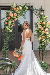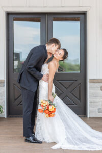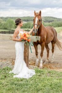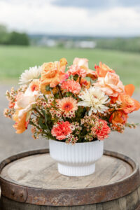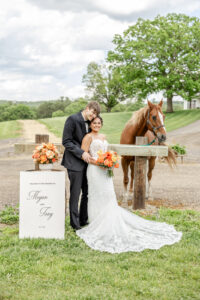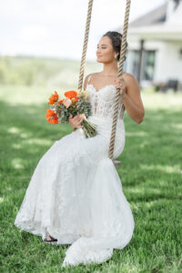 From their design and coordination efforts to their breathtaking floral arrangements, Skies the Limit Events brought the countryside wedding vision to life. Drawing inspiration from the wood tones of the venue’s barn, they curated a color palette of warm orange and peach tones that cohesively carried through the floral designs. The ceremony arch was draped with lush greenery and colorful blooms, creating a romantic and natural backdrop for the couple to say “I do.”