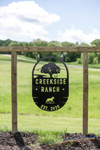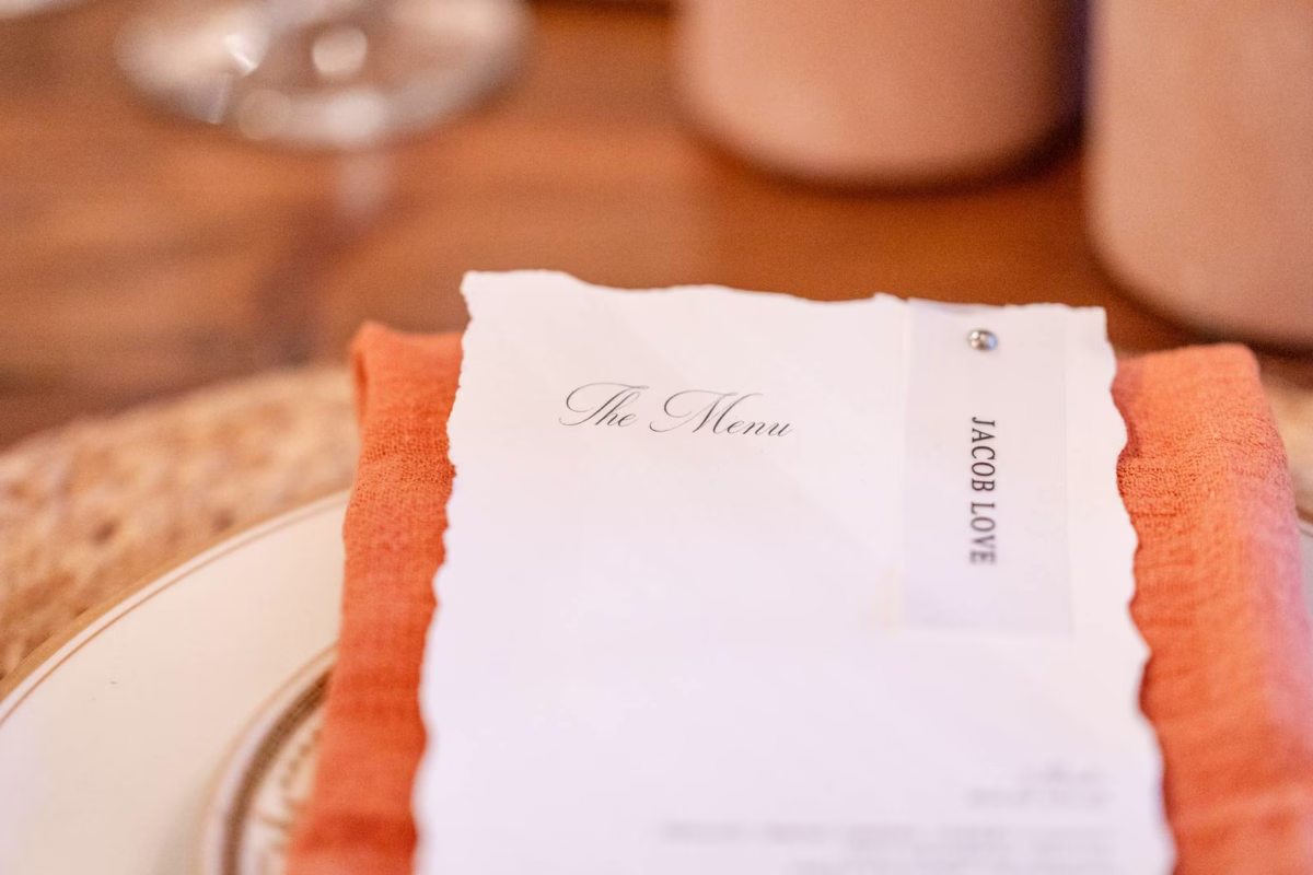 BP Creationery elevated the celebration with thoughtfully designed stationery and signage. The invitations set the tone with a breathtaking watercolor portrait of Creekside Ranch. Printed on textured cardstock with artfully torn edges, they added an organic, natural look that carried over to the menu cards. Crafted on the same textured cardstock with matching torn edges, the menu cards were paired with a vellum paper attachment showcasing each guest’s name for a personal touch.