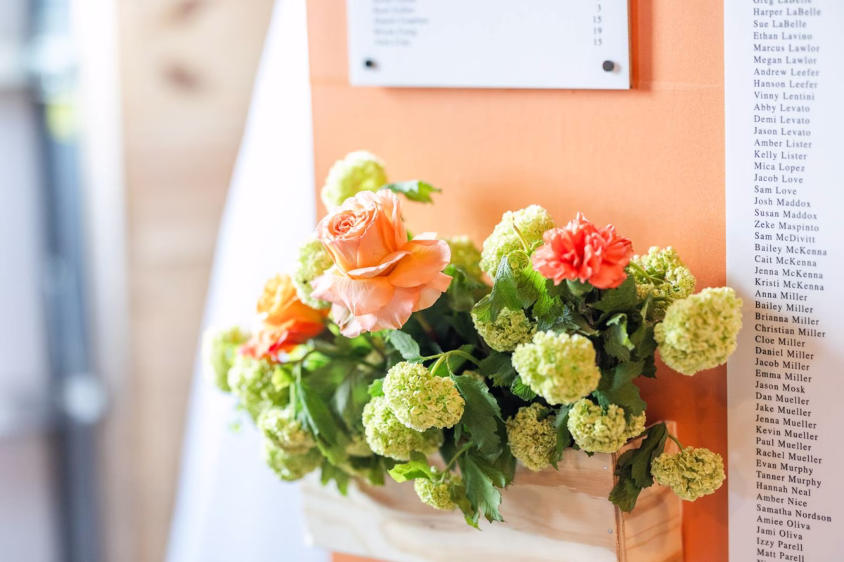 The stunning seating chart, printed on foamboard, was displayed on one of BP Creationery’s rentable backdrops and was customized in a warm, vibrant orange that seamlessly tied into the day’s palette. Additionally, the table numbers and welcome sign, designed with plaster and acrylic lettering, brought further dimension, texture, and artistry to the decor.