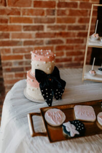 What would a party be without coordinating treats to sweeten up the celebration even further? LC Custom Treats, LLC artfully crafted an adorable array of custom cookies, cake pops, and a two-tier cake that perfectly complemented the shower’s bows and pearls theme, layering in dreamy pops of blush pink!