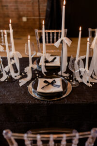 Mirrored chargers, matte black ceramic plates, and black candlesticks from Orange Door Event Rentals contributed to the polished design, while personalized black satin bow place cards from BP Creationery were set to welcome each guest.