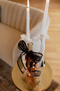 Skies the Limit Events styled a stunning tablescape for the bride and her babes to savor this sweet time together. A dramatic black crinkle tablecloth from 4 Sisters Events set the foundation for a statement centerpiece of glowing white taper candles tied with bows and scattered pearls.