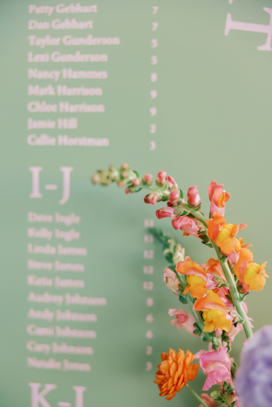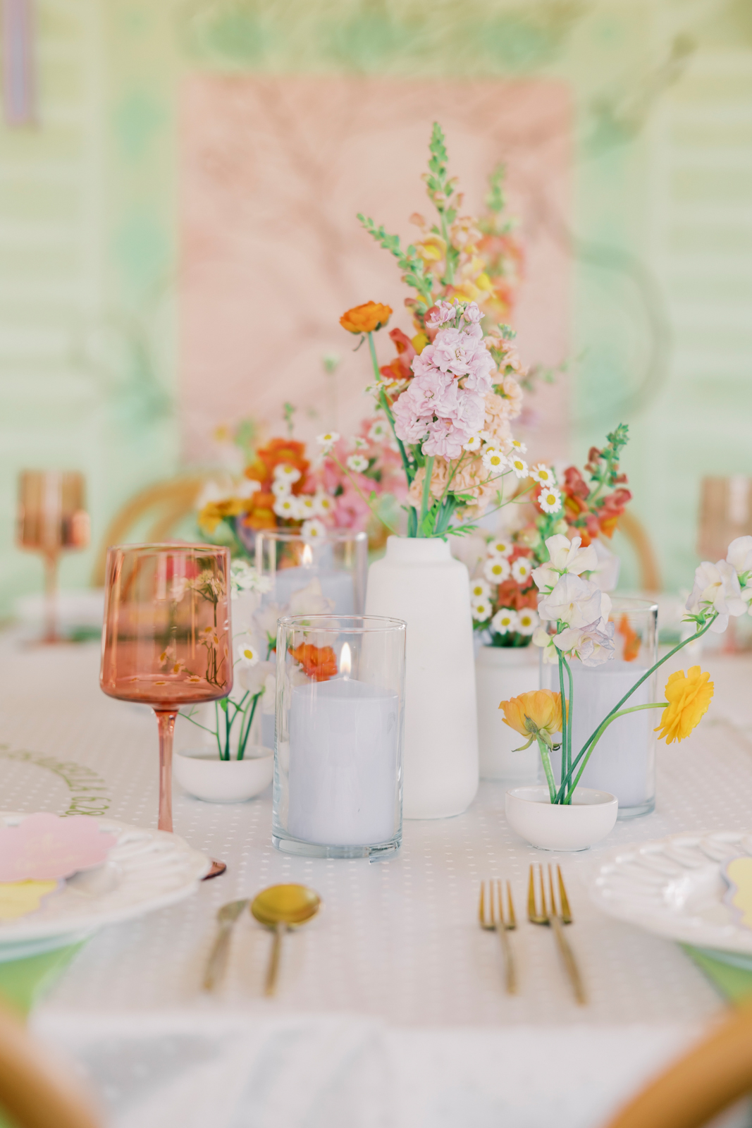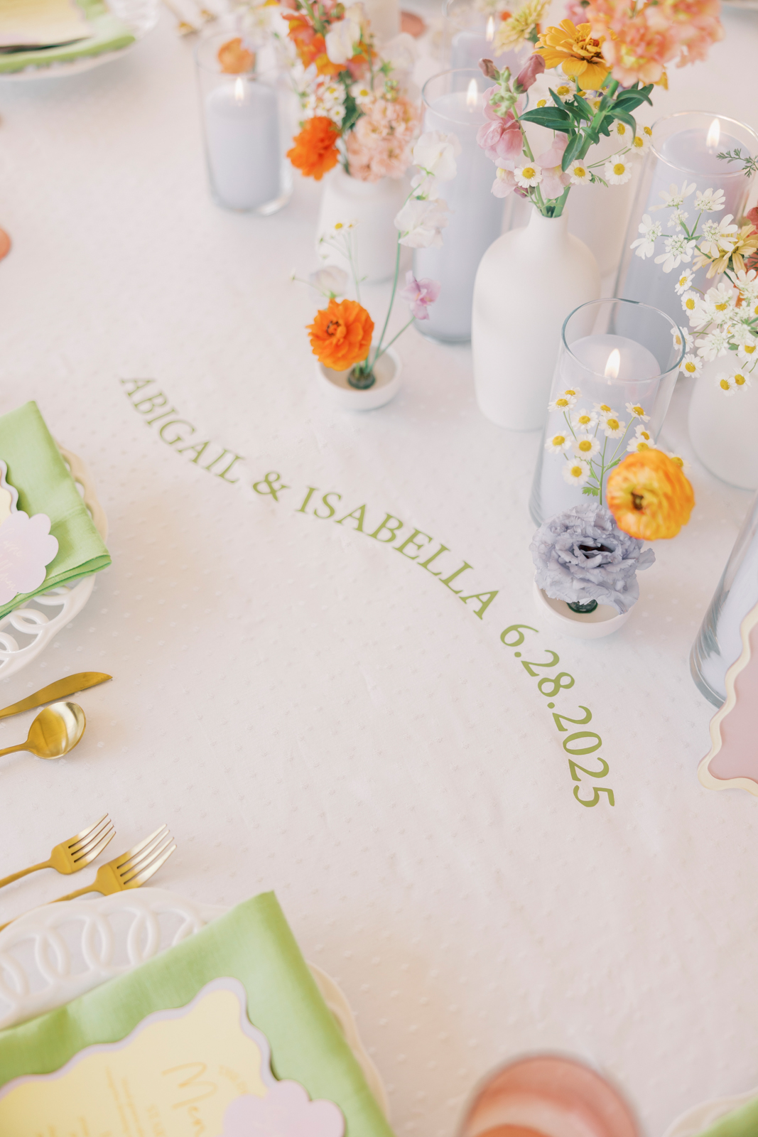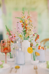 Expertly coordinated by Orange Door Weddings, thoughtful design and unique rentals set the stage for a cheerful and memorable celebration. Trendy matcha green and lavender tones were beautifully complemented by vibrant pops of oranges, yellows, and blush pinks, creating a dynamic and eye-catching palette that contrasted with the crisp white dotted table linens.