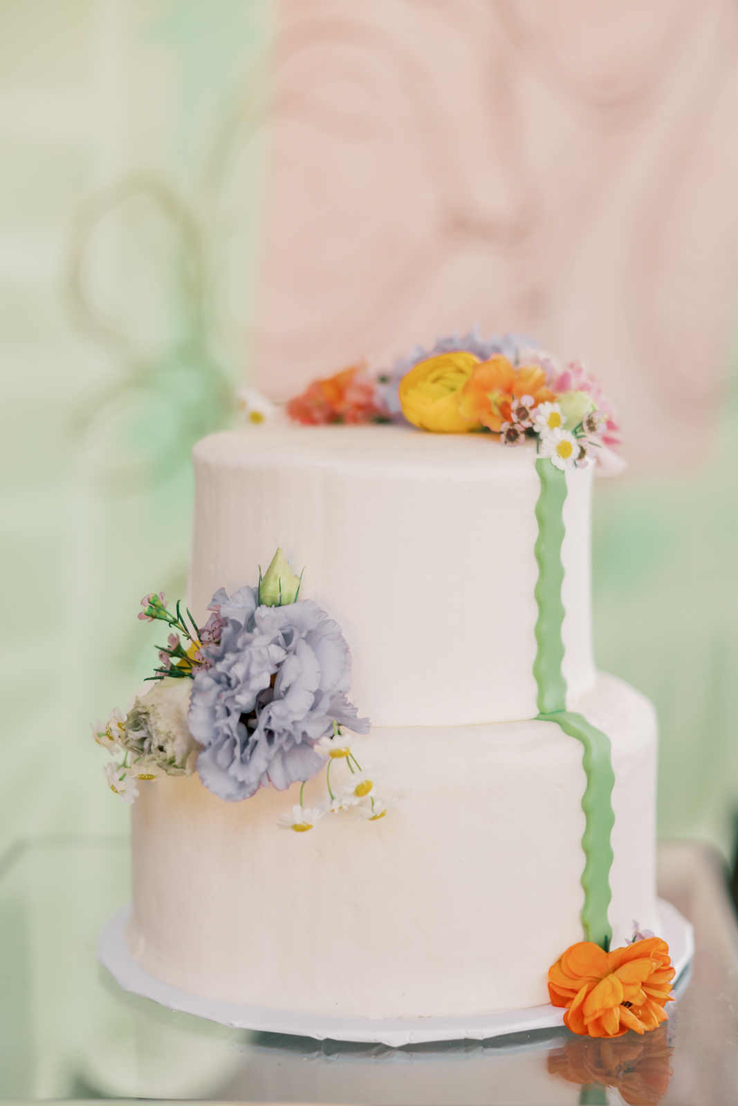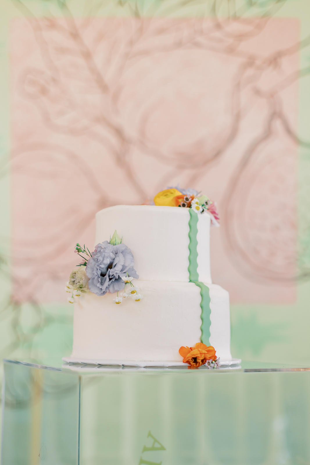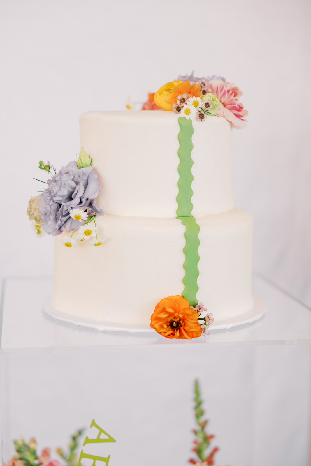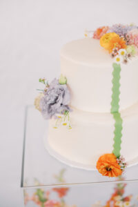 Crumbtastic Cakery showcased their creativity with a striking two-tiered, clean white cake, highlighted by a playful green squiggly detail cascading down the side. Displayed on a clear acrylic column from 4 Sisters Events, the cake was further enhanced by vibrant blooms rising up through the column’s interior and chic, wavy vinyl lettering running vertically on the outside. This fusion of minimalist elegance with bold, modern design created a captivating centerpiece that seamlessly integrated the stunning and delicious treat into the event’s vibrant and contemporary theme.