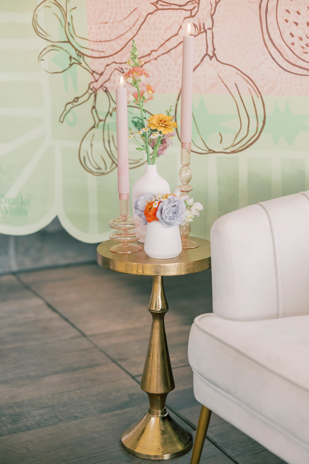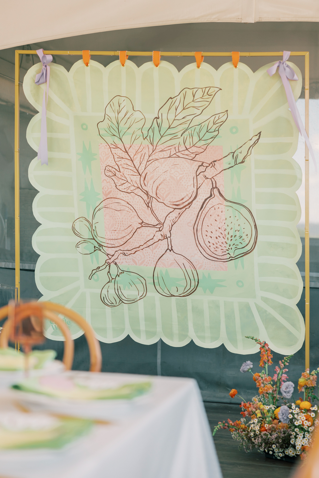 Castle Walls Weddings’ “Wavy Figs” mural served as a showstopping backdrop to this funky and fresh celebration! Their hand-painted creation added an artistic and whimsical focal point that perfectly tied into the vibrant and playful atmosphere.