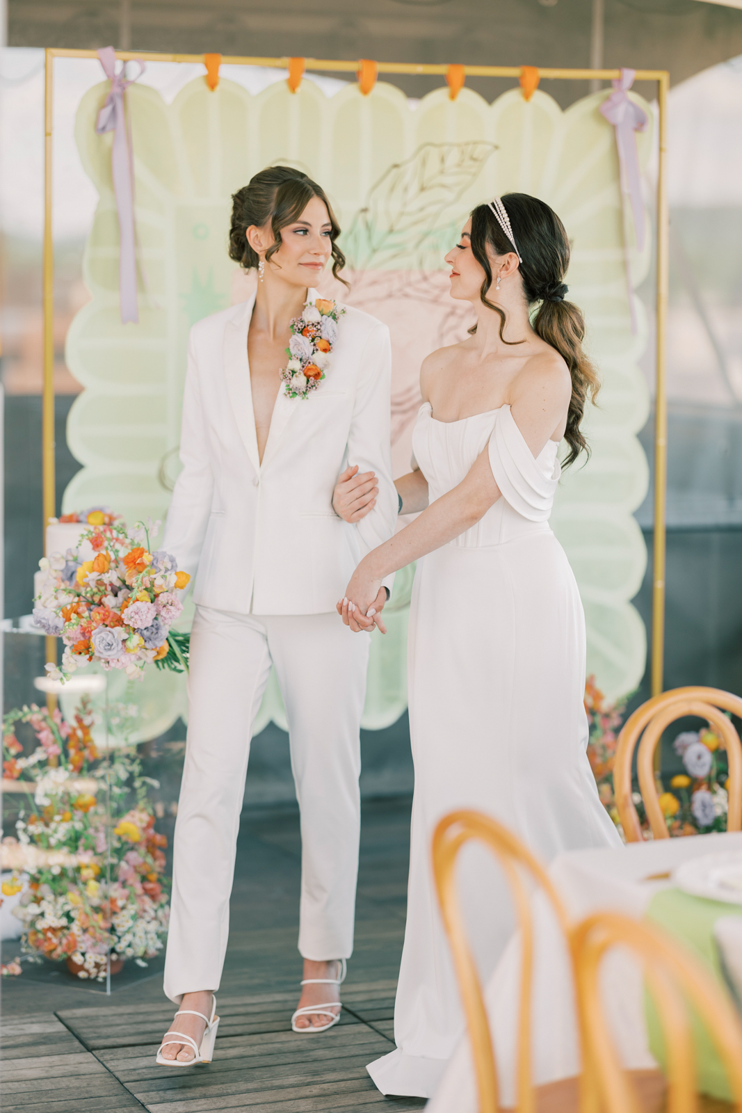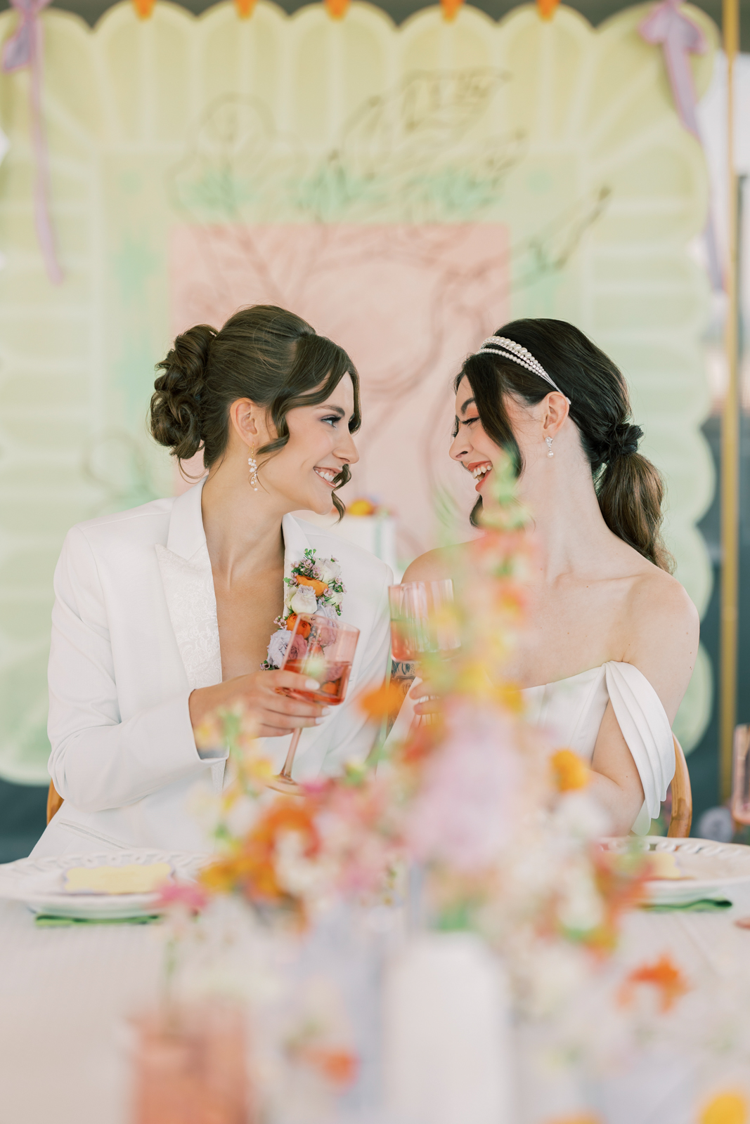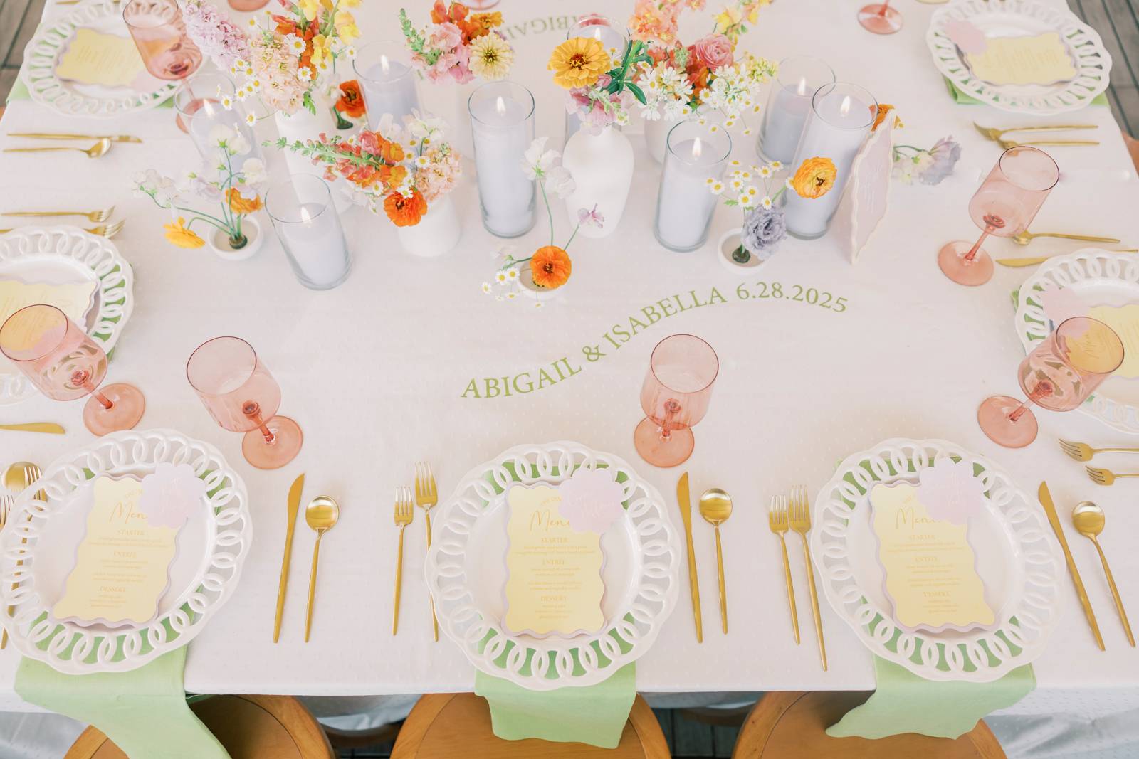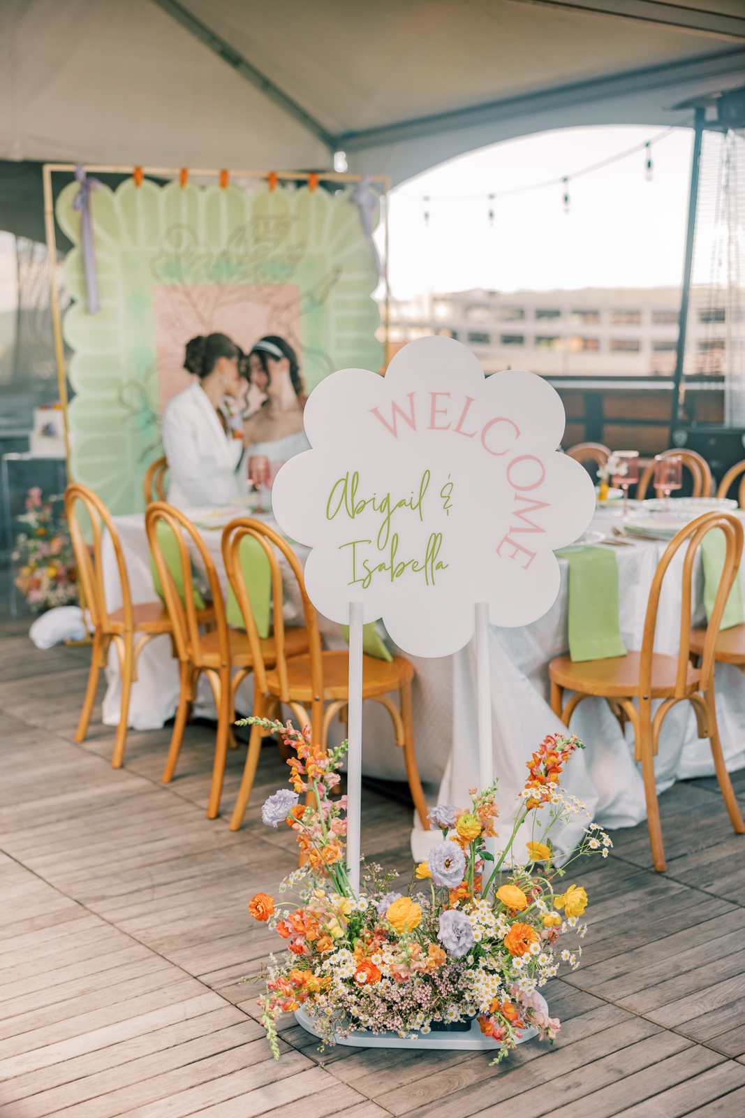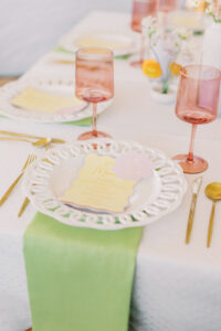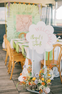 Whimsical Design & Decor meticulously crafted every stationery and signage element, from the invitation suite to the welcome sign, name cards, dinner menus, table numbers, seating chart, bar menu, and more, all reflecting the day’s fun, colorful, and squiggly theme. They added an extra layer of playful personalization by customizing the tablecloth and acrylic cake display with the brides’ names in a wavy vinyl pattern, seamlessly tying together the vibrant and contemporary aesthetic.