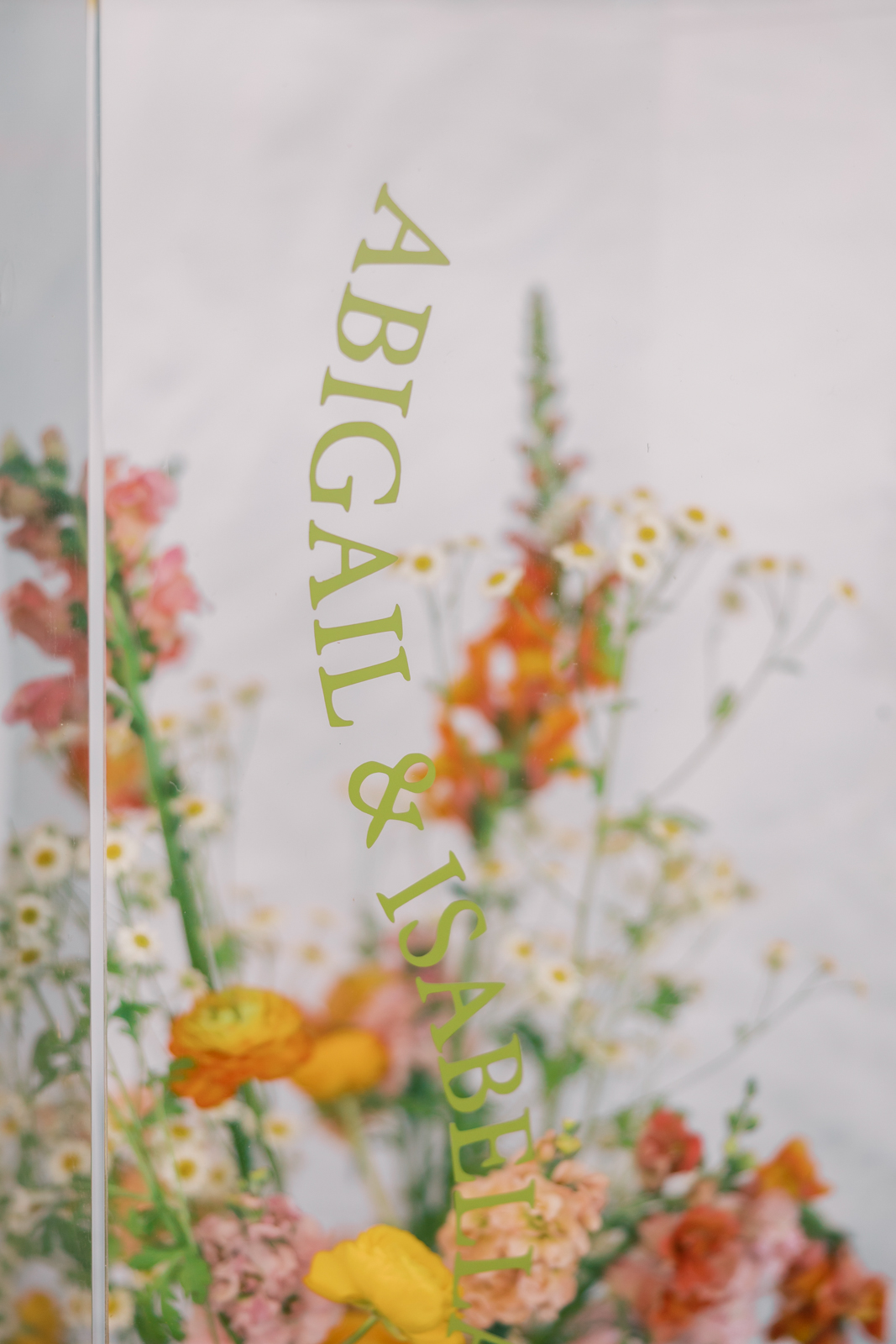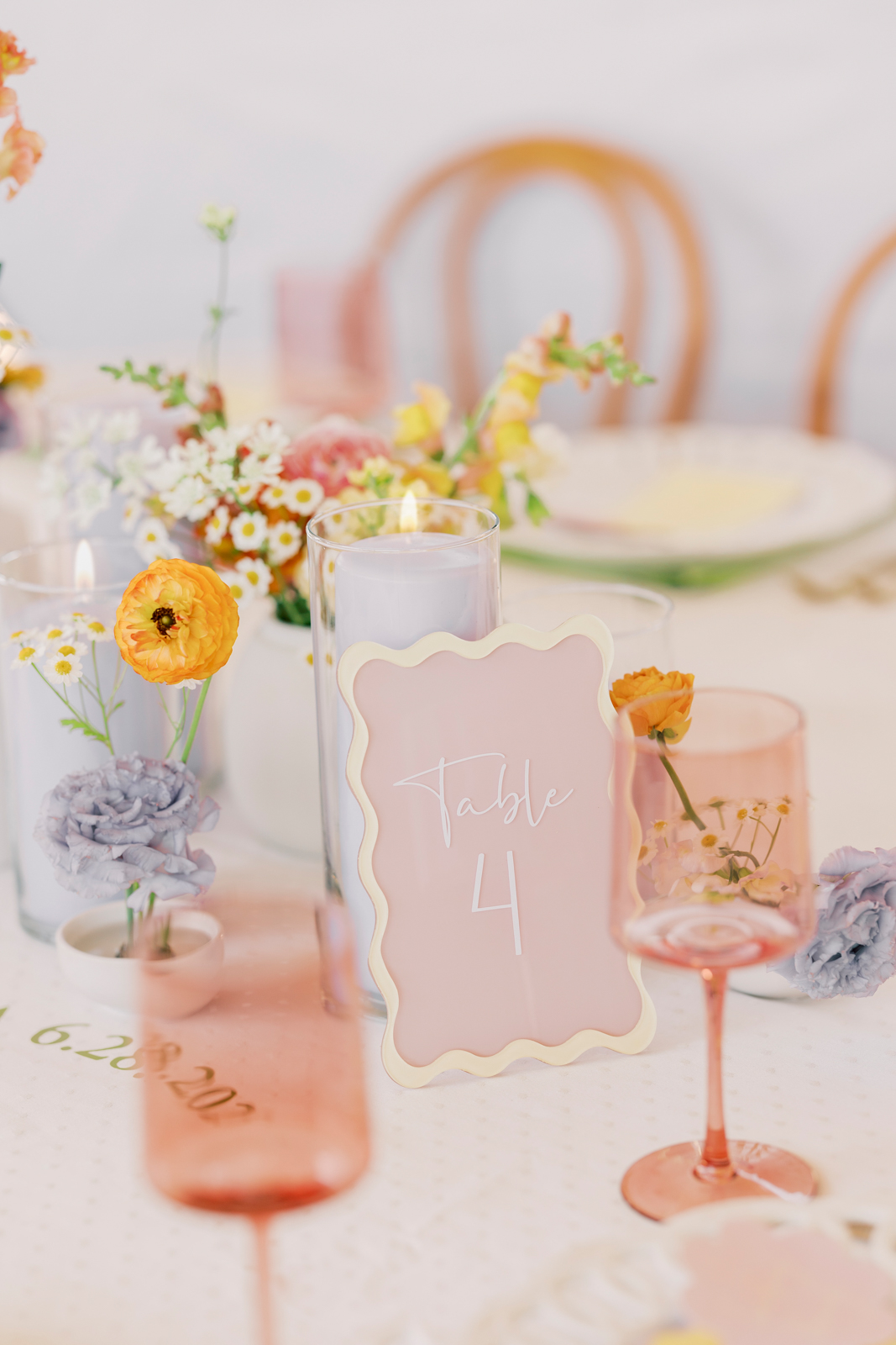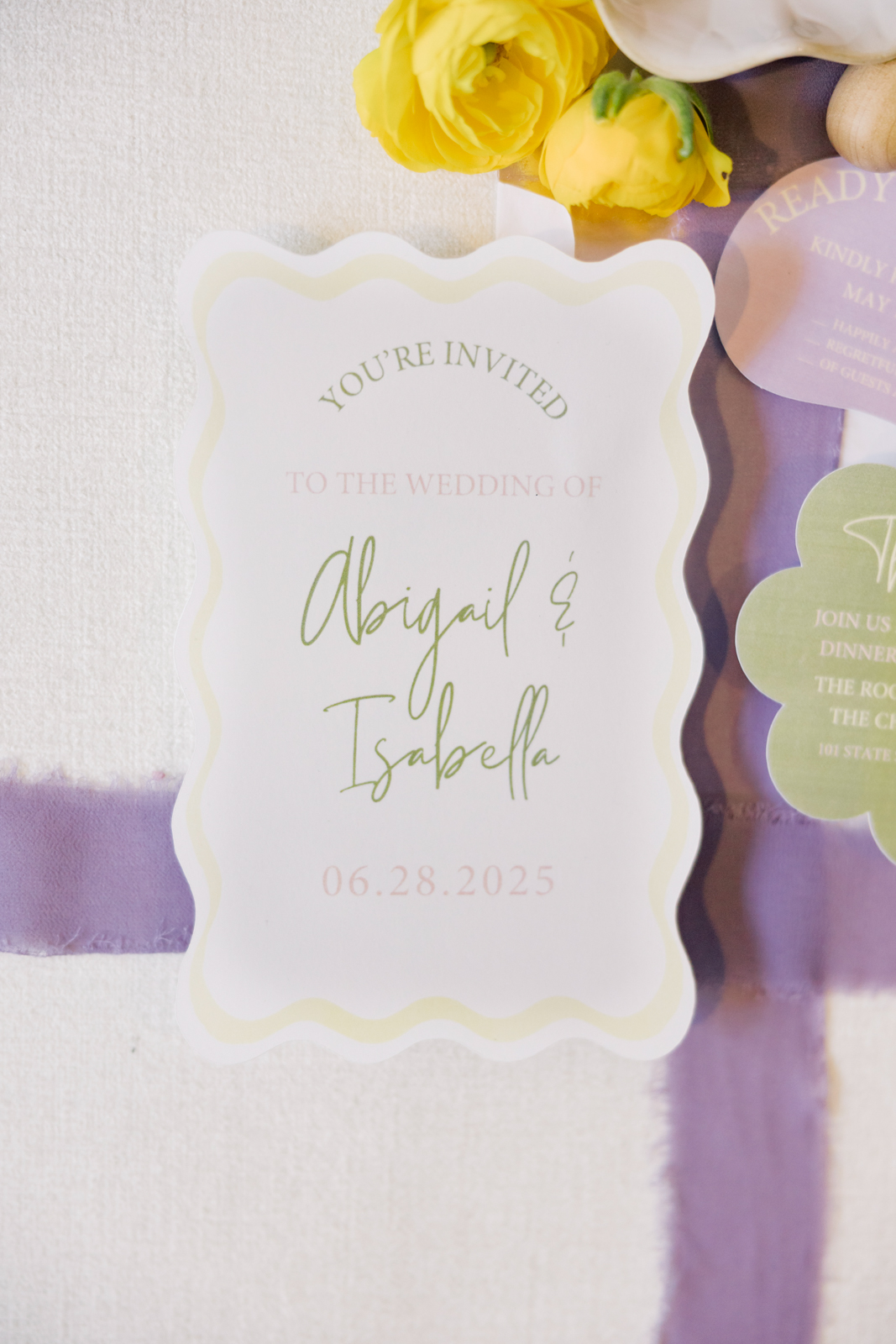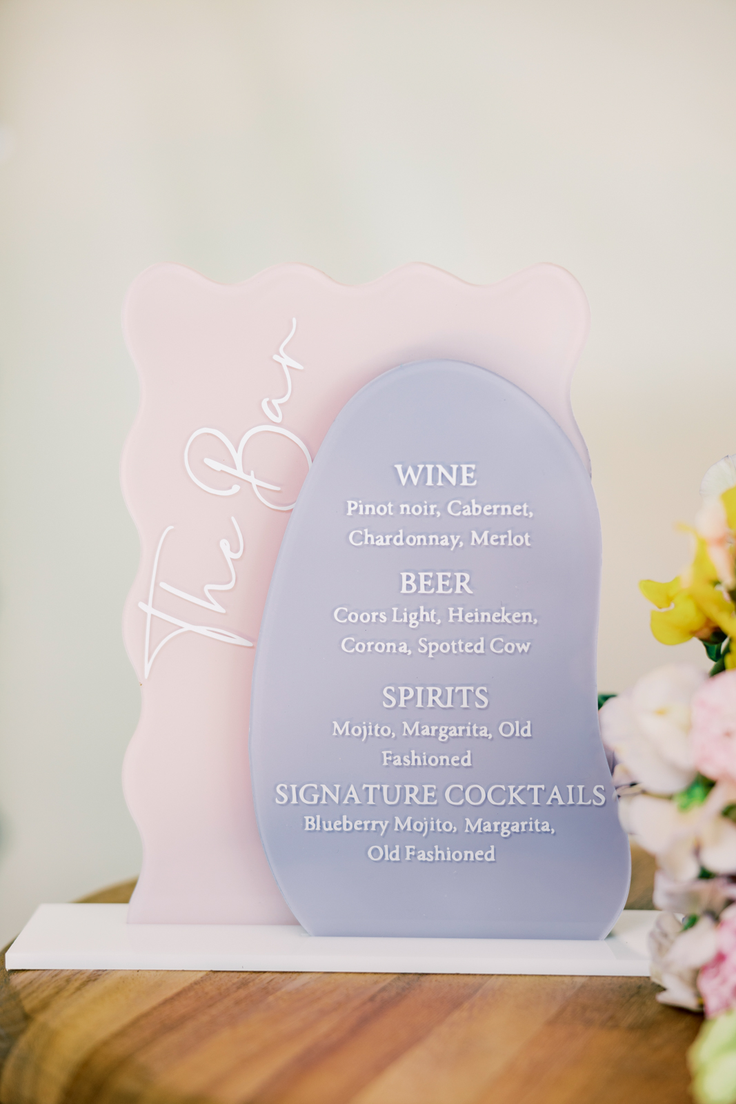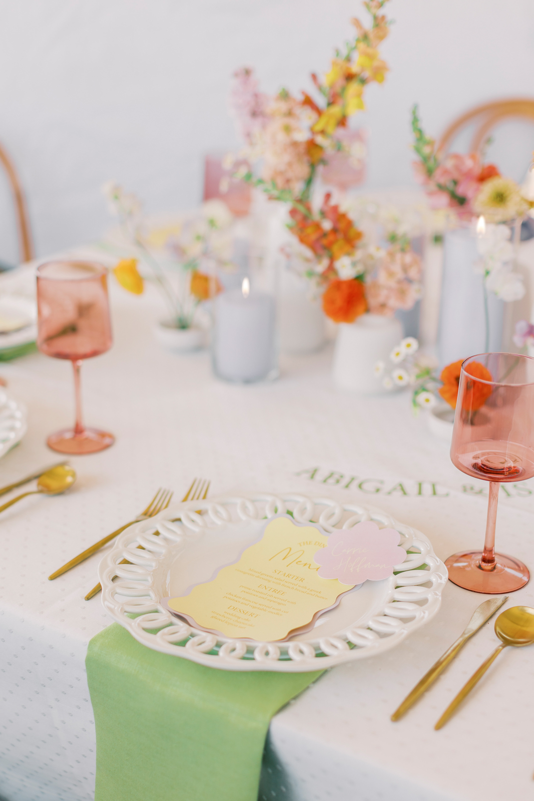 Whimsical Design & Decor meticulously crafted every stationery and signage element, from the invitation suite to the welcome sign, name cards, dinner menus, table numbers, seating chart, bar menu, and more, all reflecting the day’s fun, colorful, and squiggly theme. They added an extra layer of playful personalization by customizing the tablecloth and acrylic cake display with the brides’ names in a wavy vinyl pattern, seamlessly tying together the vibrant and contemporary aesthetic.