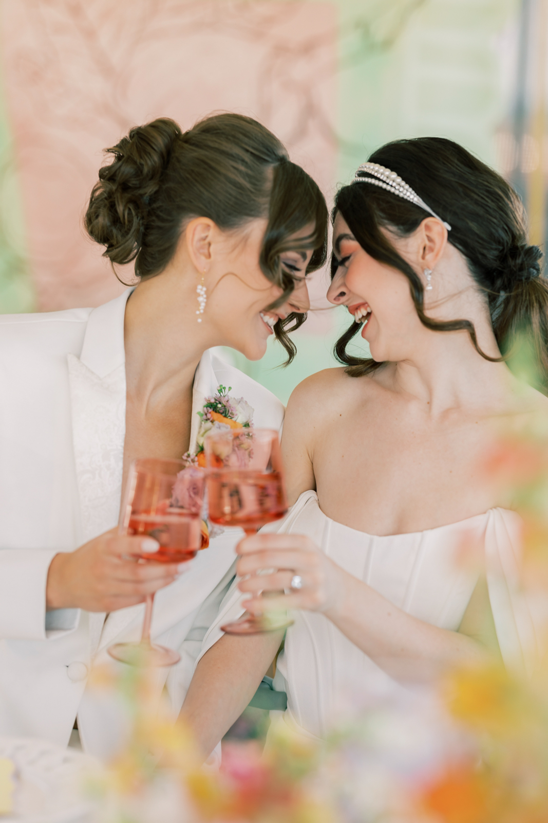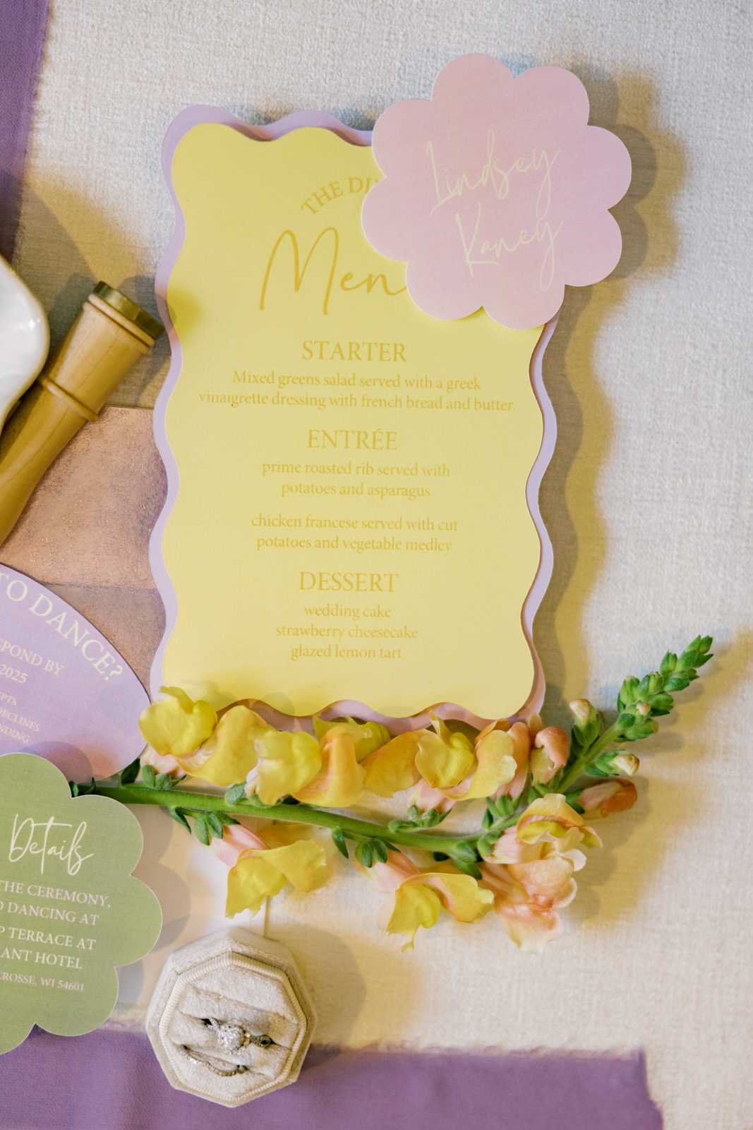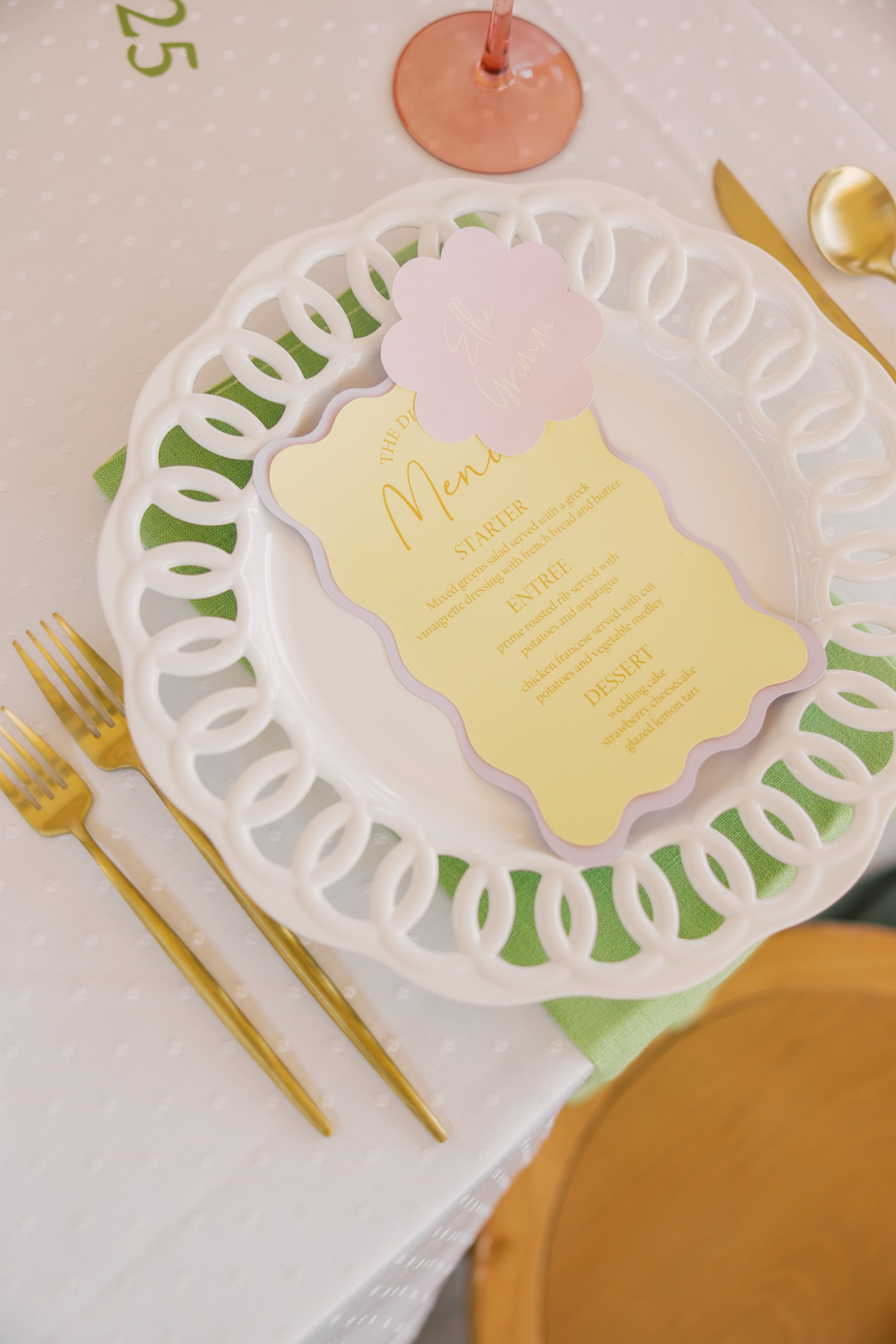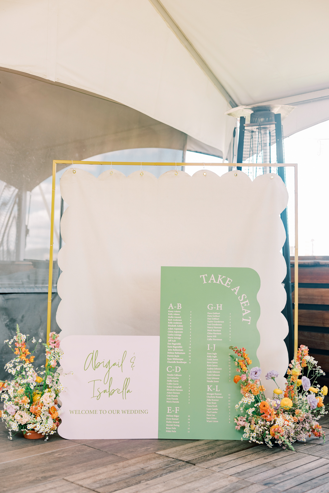 Whimsical Design & Decor meticulously crafted every stationery and signage element, from the invitation suite to the welcome sign, name cards, dinner menus, table numbers, seating chart, bar menu, and more, all reflecting the day’s fun, colorful, and squiggly theme. They added an extra layer of playful personalization by customizing the tablecloth and acrylic cake display with the brides’ names in a wavy vinyl pattern, seamlessly tying together the vibrant and contemporary aesthetic.