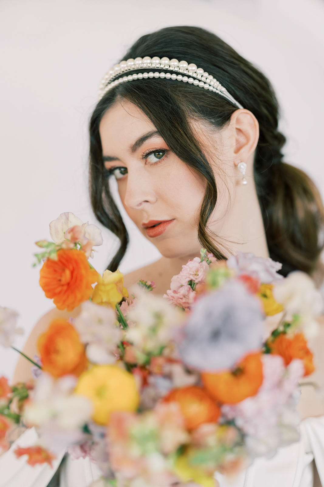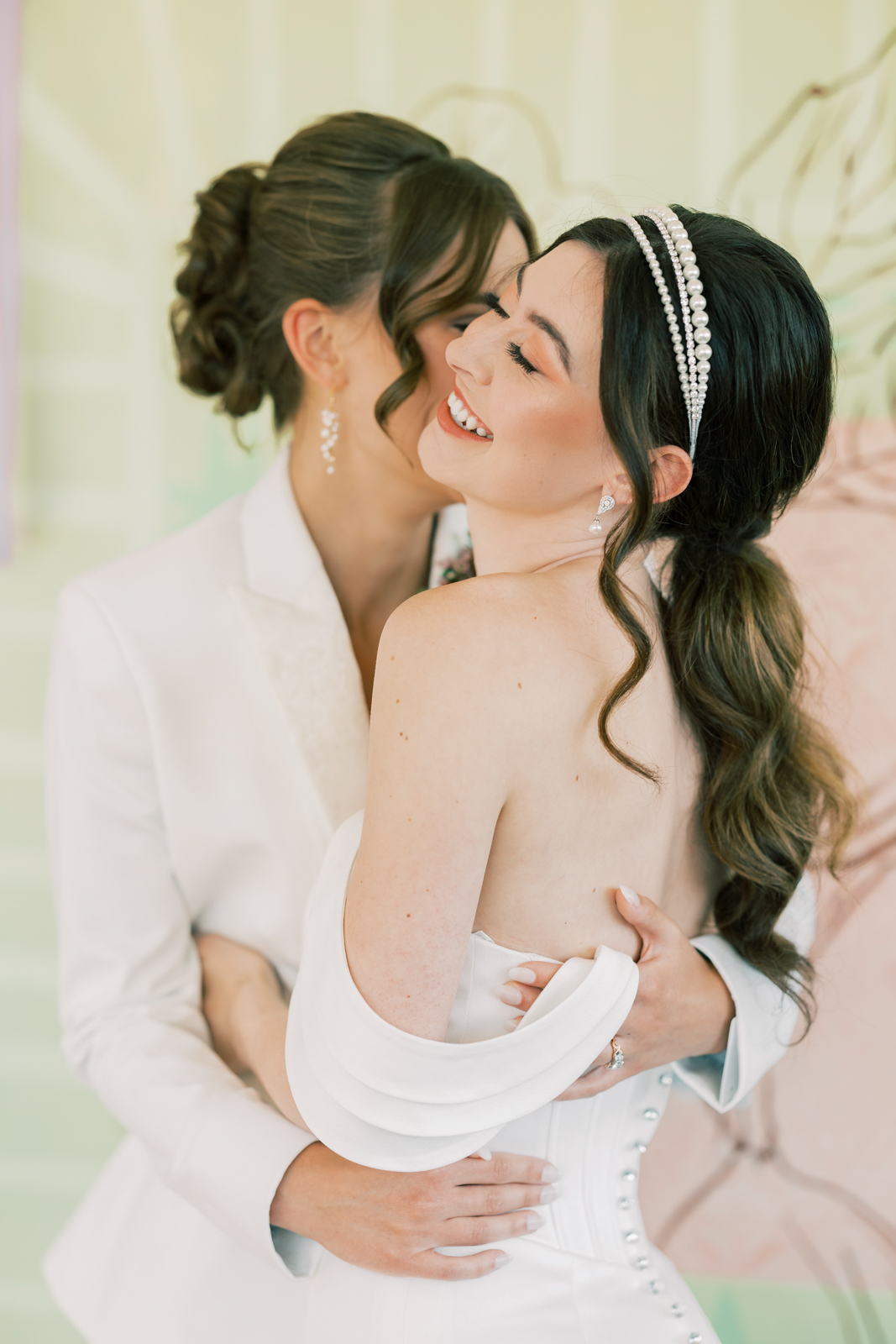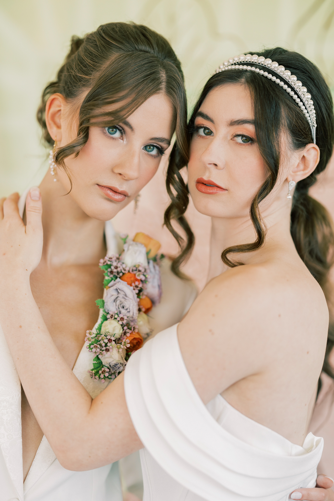 Pamperin Bridal Lounge elevated each bride’s look with elegant hair and makeup that perfectly complemented their modern styles. One bride wore a chic updo with soft, face-framing tendrils, paired with subtle, glamorous makeup featuring defined eyes and peachy pink lips. The second bride showcased a sleek low ponytail with loose, face-framing curls and a statement pearl headband for a contemporary touch. Her makeup was polished and refined, with bold brows, warm eyeshadow, coral pink cheeks, and complementary lip color, completing her fresh, stylish look.