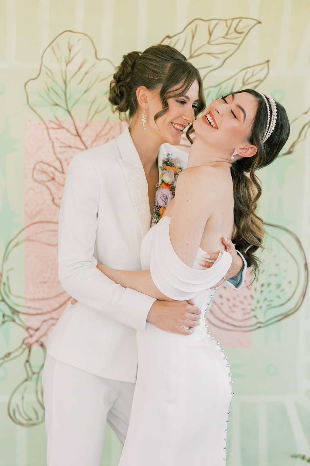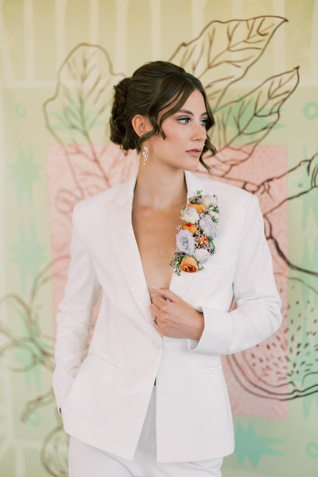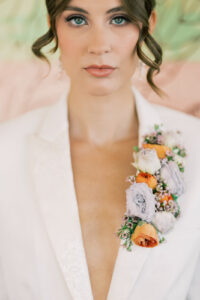 The second bride made a bold statement in a contemporary white suit, perfect for brides seeking a stylish alternative to a traditional gown. The sleek, deep V silhouette added a touch of daring sophistication, while the subtly patterned lapels in a white-on-white design offered a unique textural element. A vibrant lapel floral boutonniere provided the perfect pop of color, completing her modern, chic ensemble.