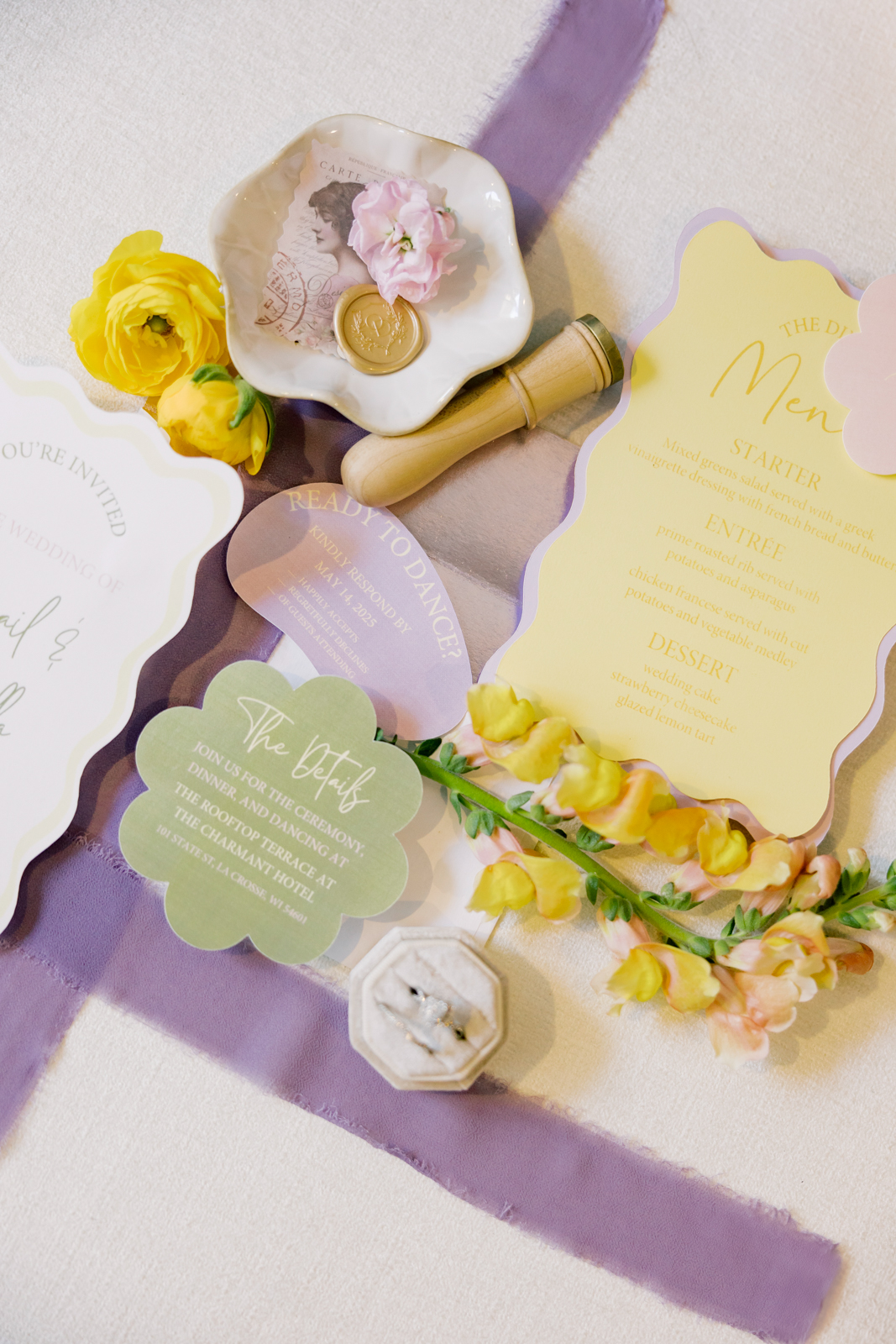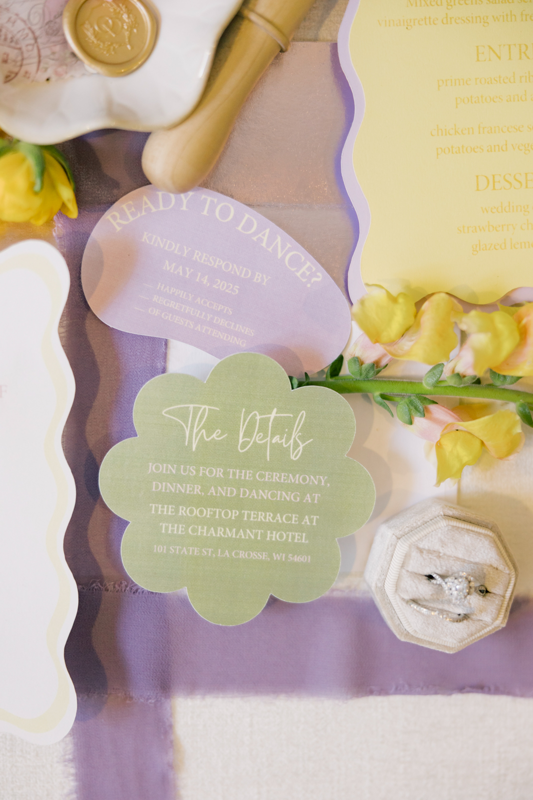 The Rooftop Terrace at the Charmant Hotel provided a scenic and stylish setting for this colorful, contemporary wedding design. With sweeping panoramic views of downtown La Crosse, the venue’s blend of historic charm and modern luxury made it the perfect location for an outdoor soirée!