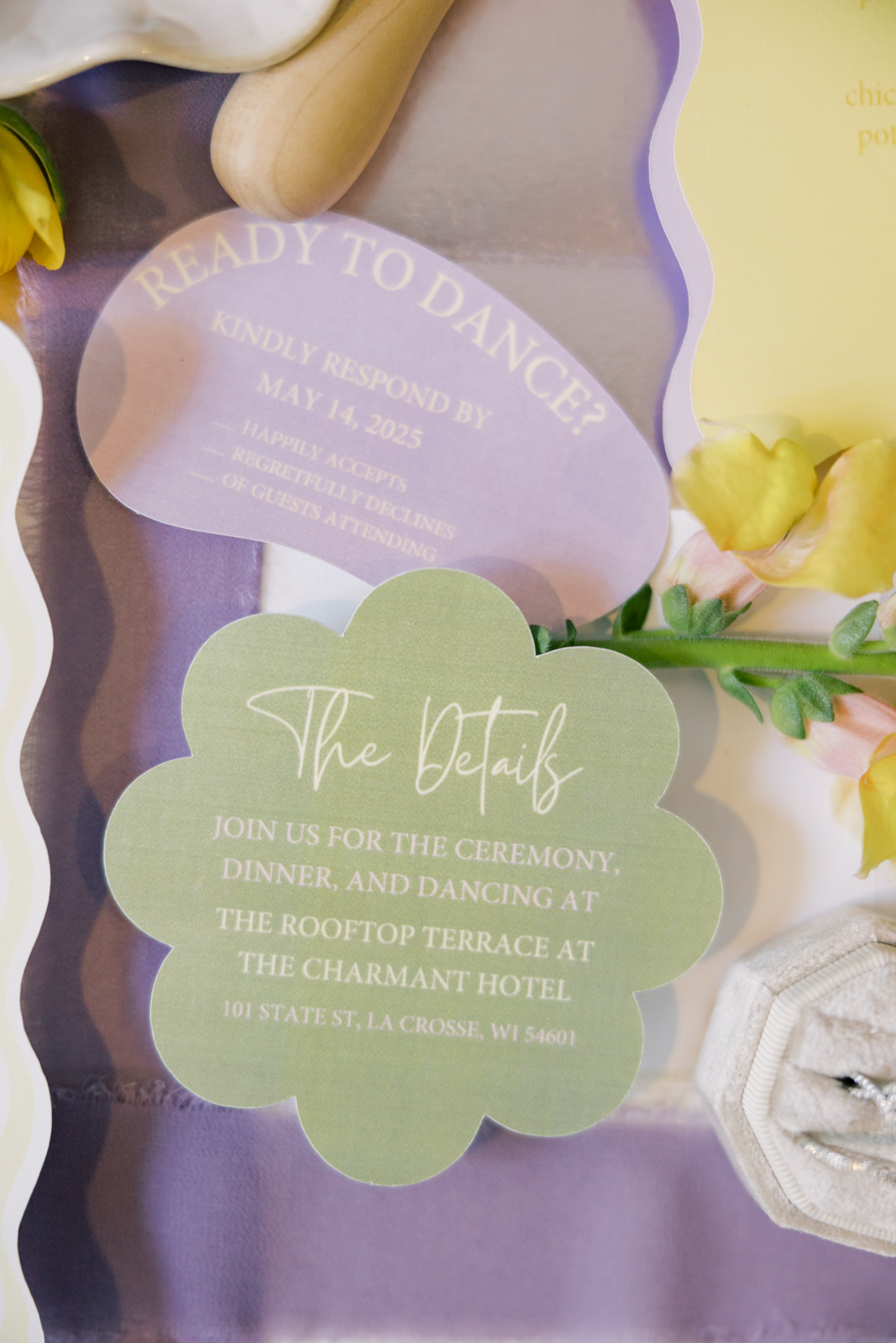 Playful, squiggly details and a cheerful color palette set the tone for this clean, contemporary, and refreshingly colorful wedding design against the stunning backdrop of the Rooftop Terrace at The Charmant Hotel in La Crosse, Wisconsin.