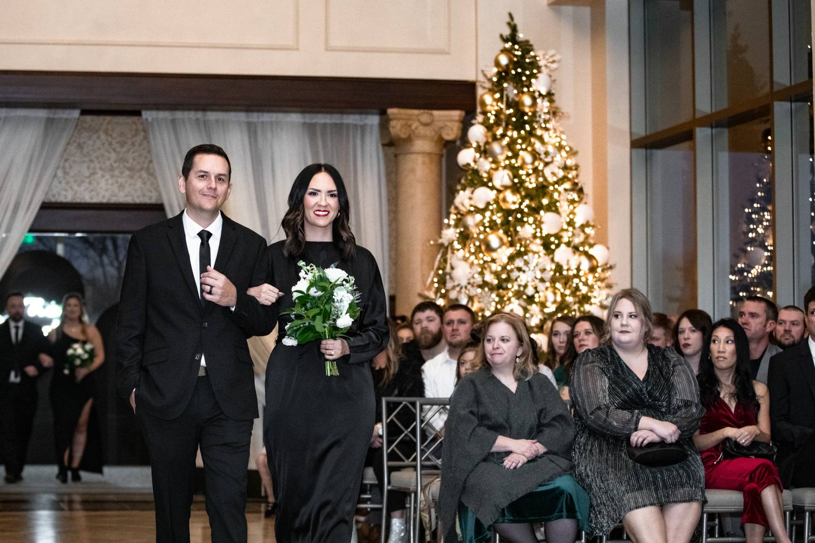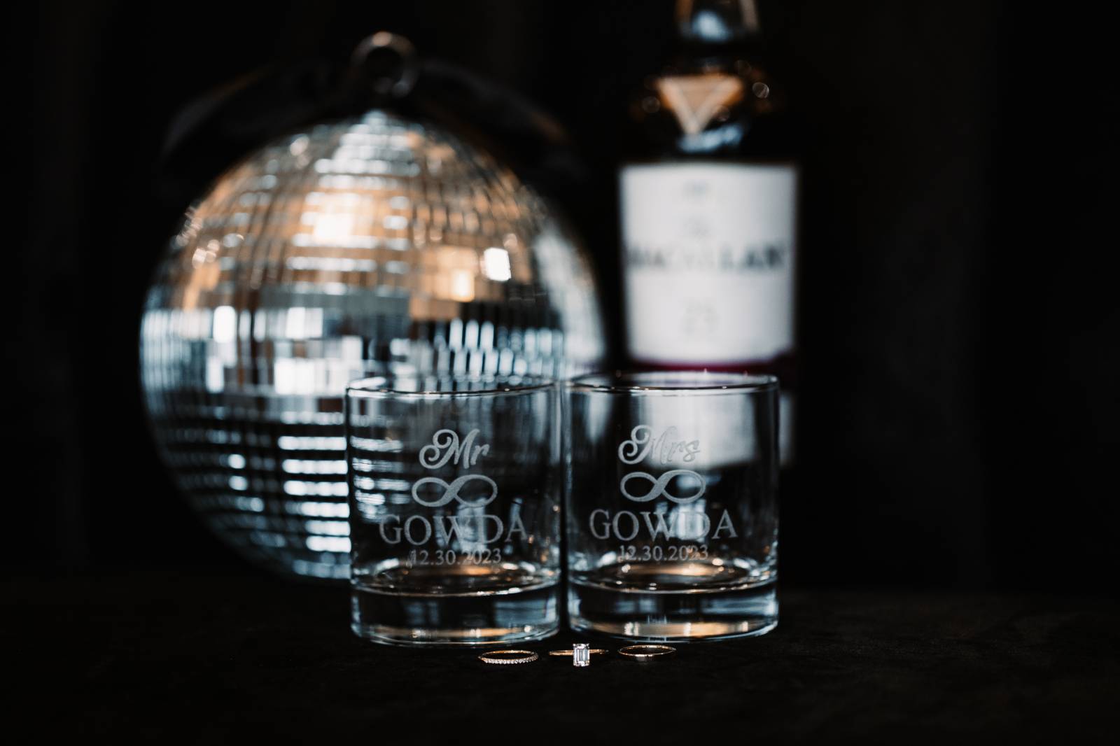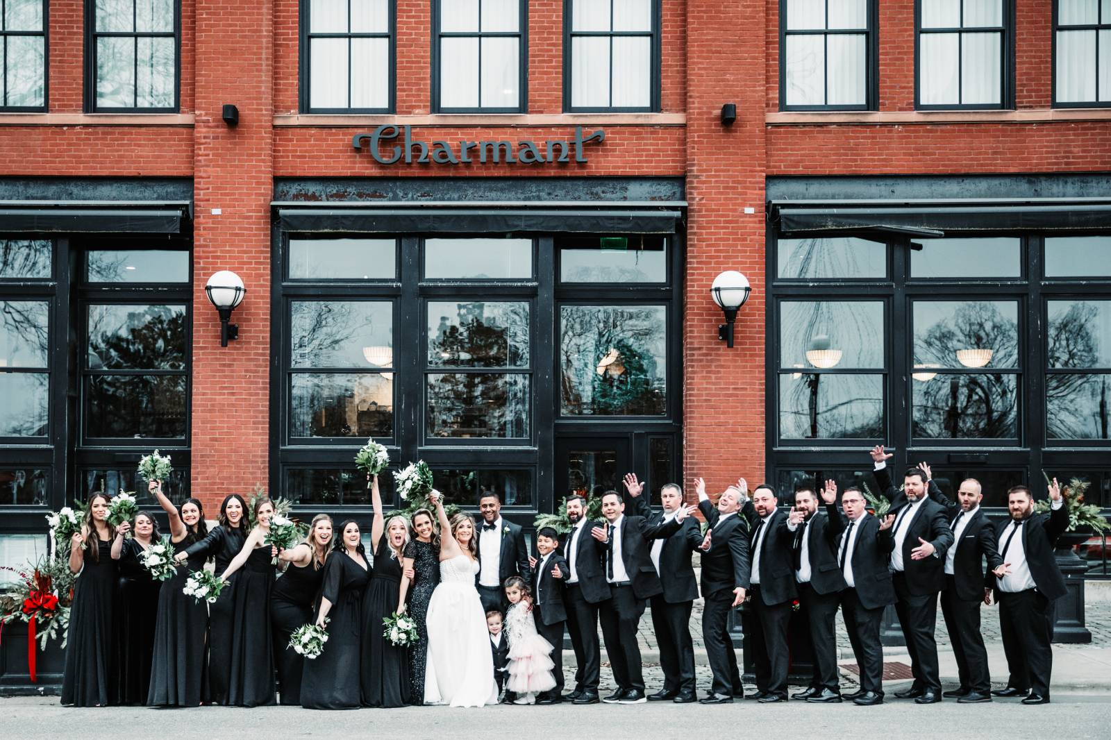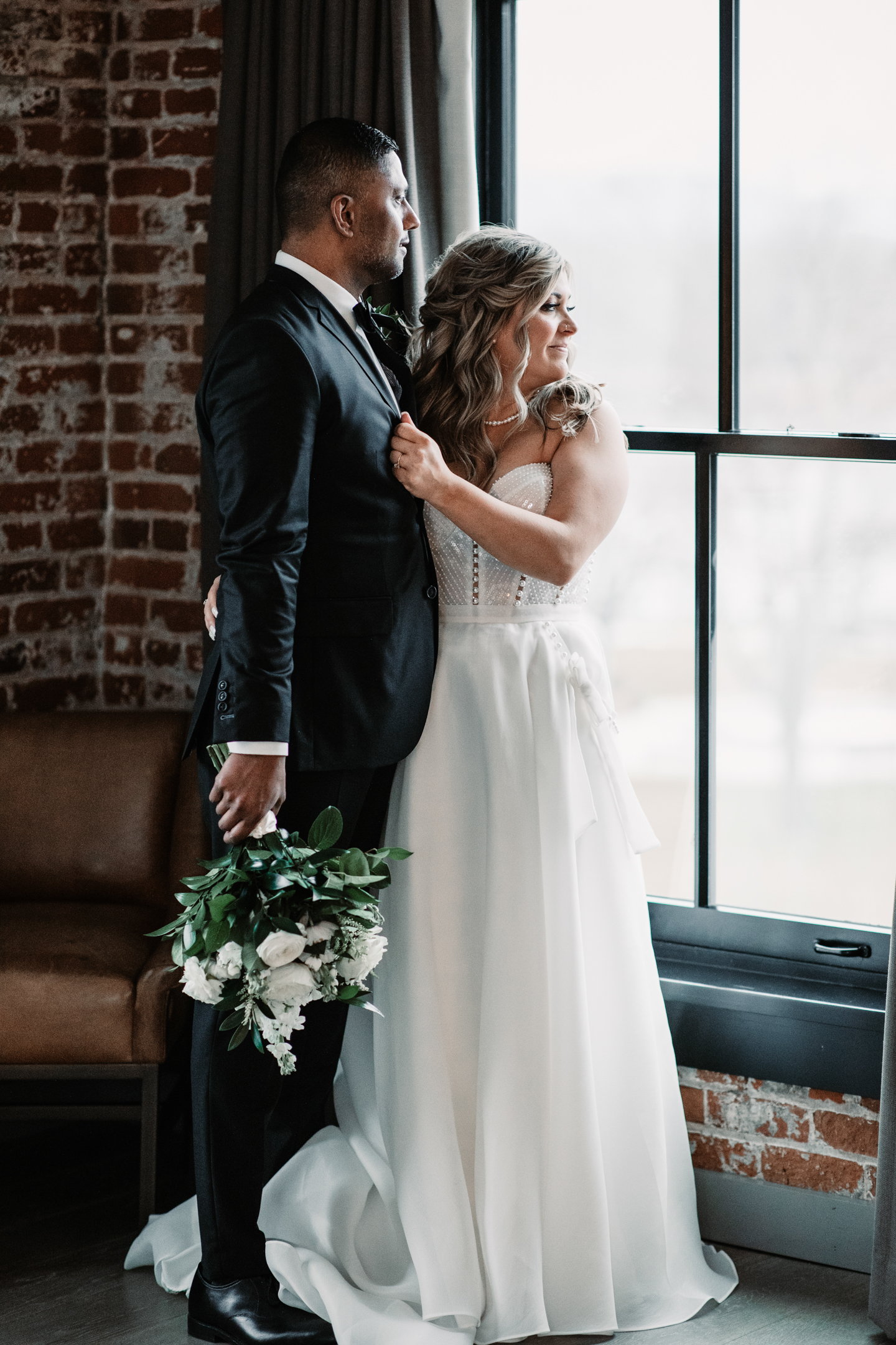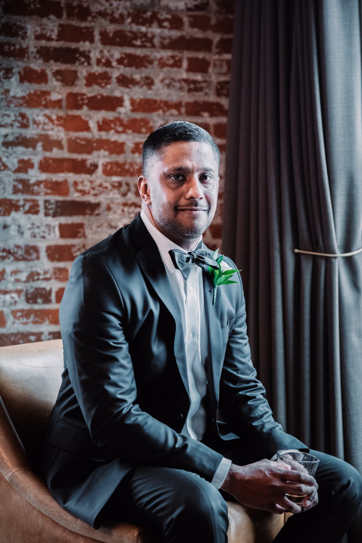 Given Britany and Vinay planned their wedding from North Carolina, Orange Door Weddings played a crucial role in the process of creating a winter celebration that was dark, intimate, cozy, and romantic. With modern architecture, red brick backdrops, and plenty of room to dance, the Cargill Room at The Waterfront Cargill was the perfect location to host a twist on a traditional black-and-white celebration. Glittering details sprinkled throughout the fashions and the decor, including plenty of disco balls and sparkles on Britany’s ceremony dress and her reception look.