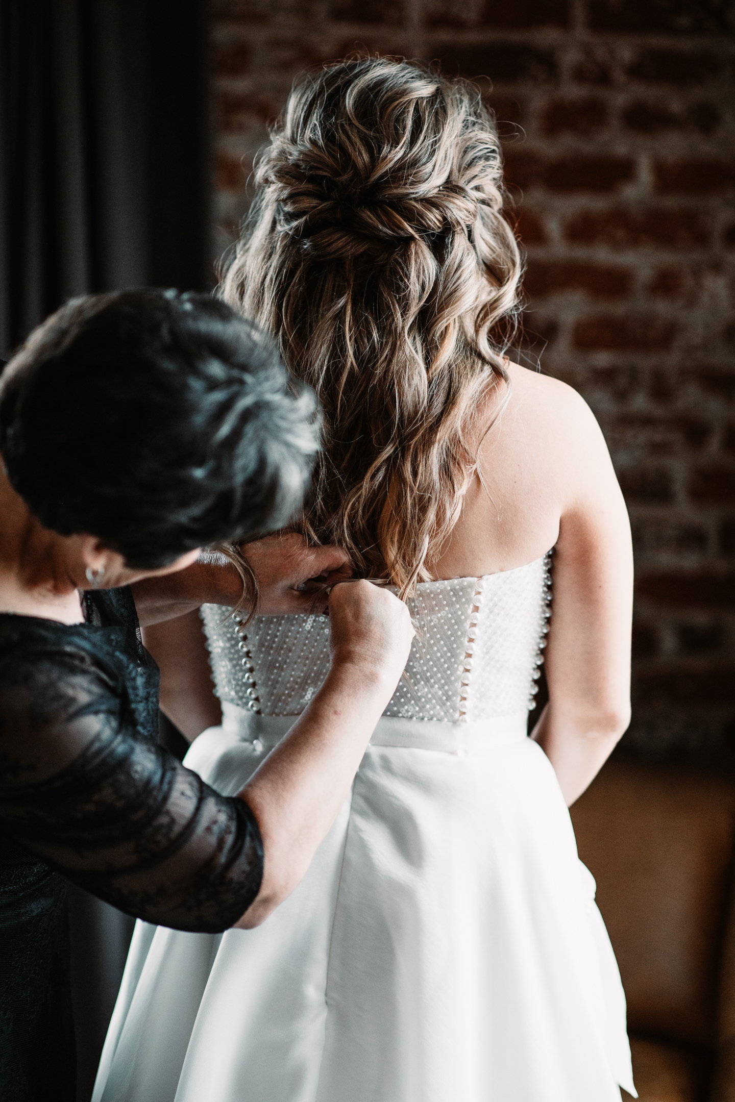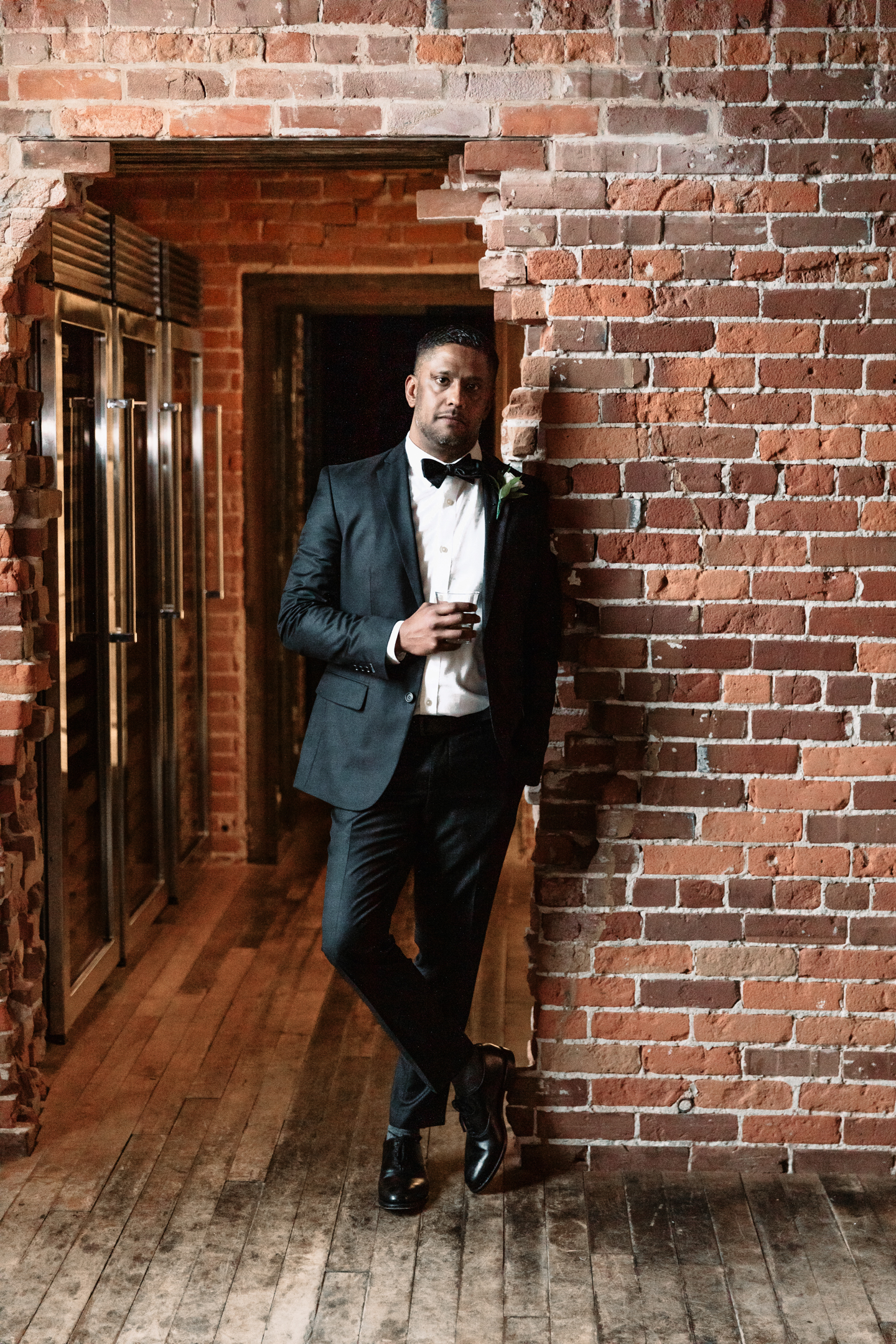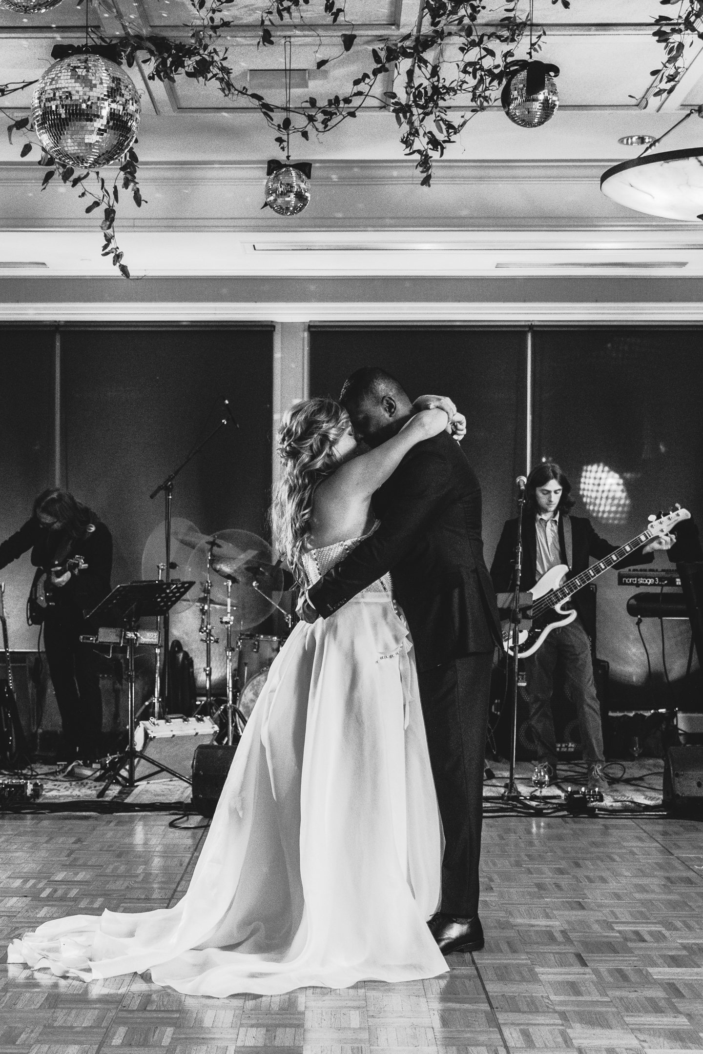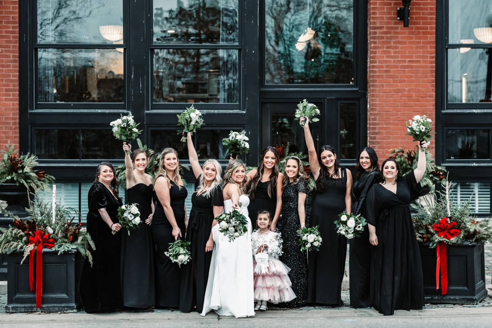 Given Britany and Vinay planned their wedding from North Carolina, Orange Door Weddings played a crucial role in the process of creating a winter celebration that was dark, intimate, cozy, and romantic. With modern architecture, red brick backdrops, and plenty of room to dance, the Cargill Room at The Waterfront Cargill was the perfect location to host a twist on a traditional black-and-white celebration. Glittering details sprinkled throughout the fashions and the decor, including plenty of disco balls and sparkles on Britany’s ceremony dress and her reception look.