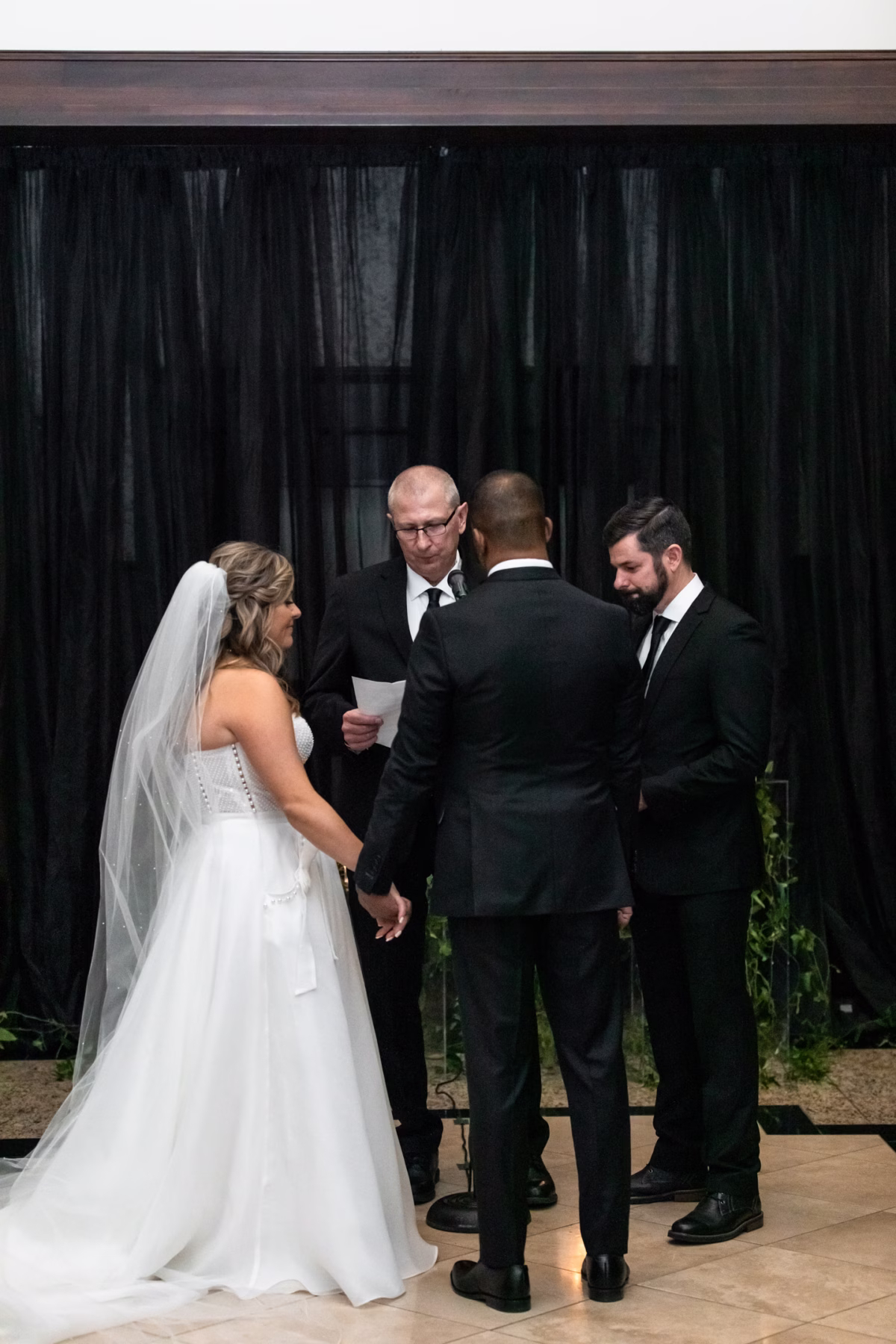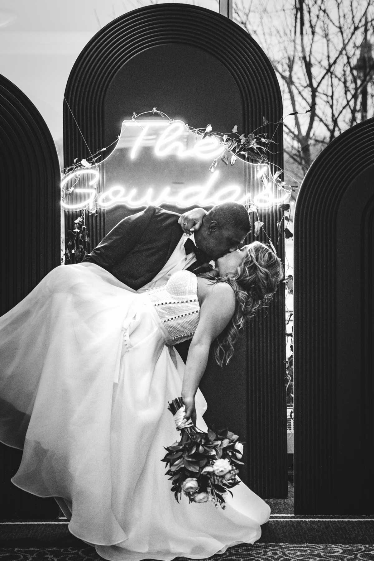 Given Britany and Vinay planned their wedding from North Carolina, Orange Door Weddings played a crucial role in the process of creating a winter celebration that was dark, intimate, cozy, and romantic. With modern architecture, red brick backdrops, and plenty of room to dance, the Cargill Room at The Waterfront Cargill was the perfect location to host a twist on a traditional black-and-white celebration. Glittering details sprinkled throughout the fashions and the decor, including plenty of disco balls and sparkles on Britany’s ceremony dress and her reception look.