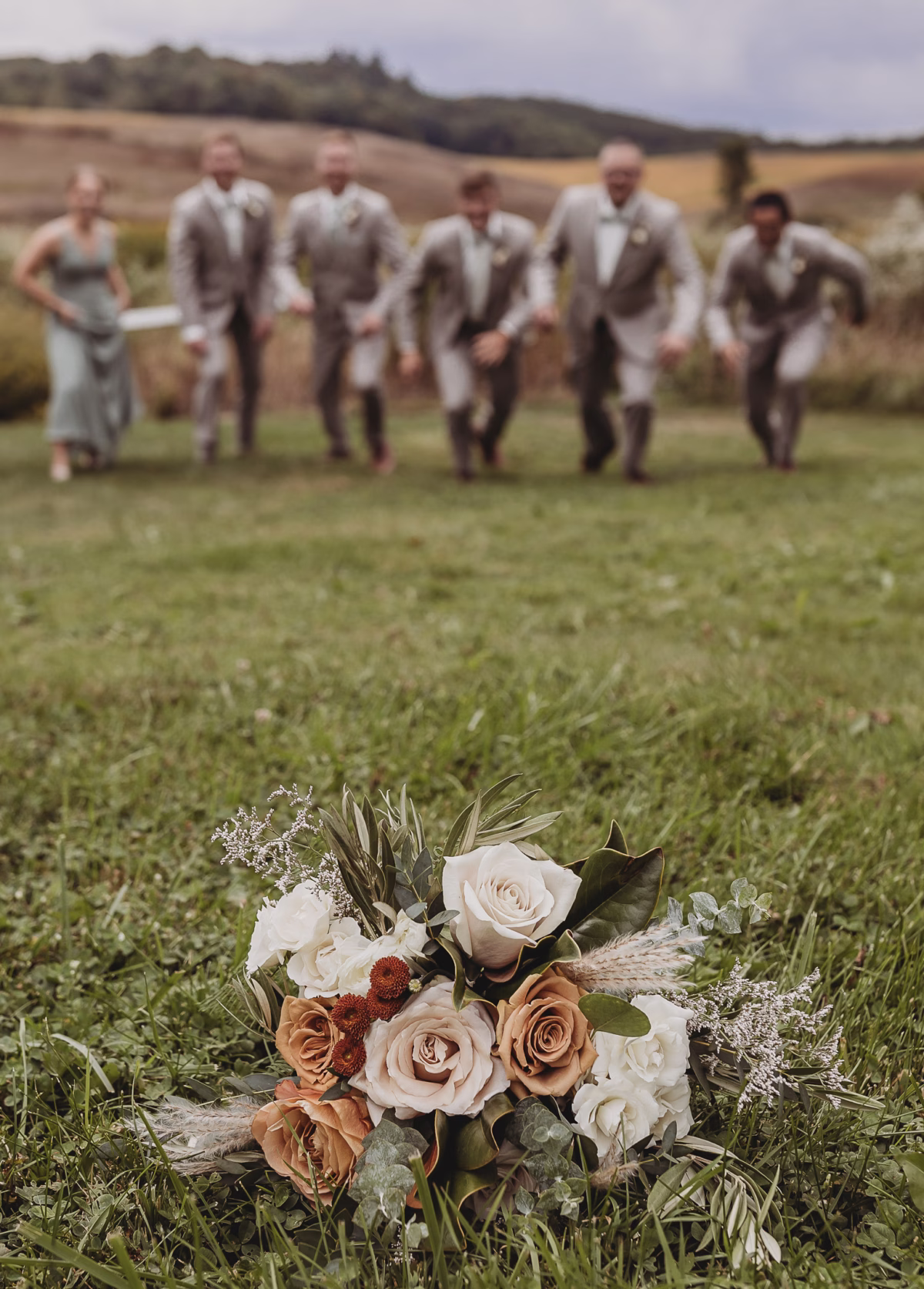 The bride wore a lacy, relaxed gown with crochet detailing that perfectly captured her free spirit. For her hair, Metropolitan Salon & Spa crafted a braided half-updo with loose curls that framed a floral hairpiece by Alesa De Jager. For makeup, Hannah opted for soft, natural look that enhanced her radiance and coordinated with the peach blooms of her bouquet and floral decor.