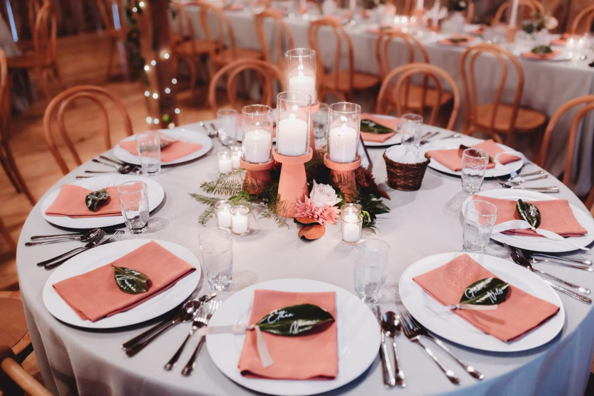 Personal details included ceremony musicians playing “Concerning Hobbits” from Lord of the Rings as the couple walked down the aisle and a song from The Legend of Zelda for the recessional. At the reception, their coordinator and florist also teamed up to create custom name cards with guests’ names handwritten on magnolia leaves–a keepsake many guests still have to this day!