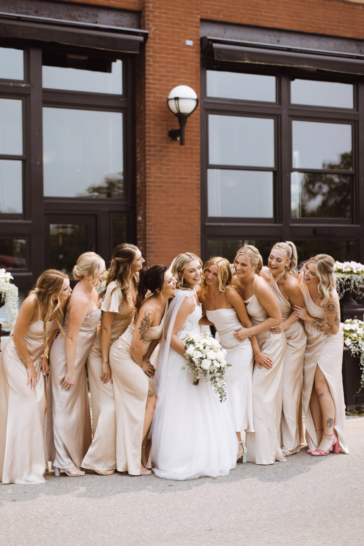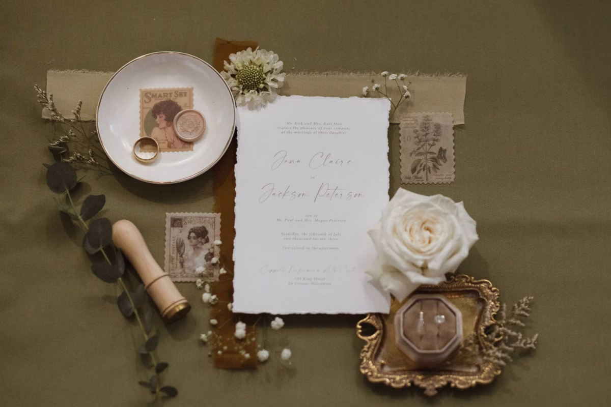 The couple's perfect day in La Crosse was classic, clean, and full of understated elegance. Orange Door Weddings helped set the tone with a neutral color palette of cream, beige, blush, sage, and navy that carried through the stationery to the decor, fashions, and lush white florals by Cottage Garden Floral.