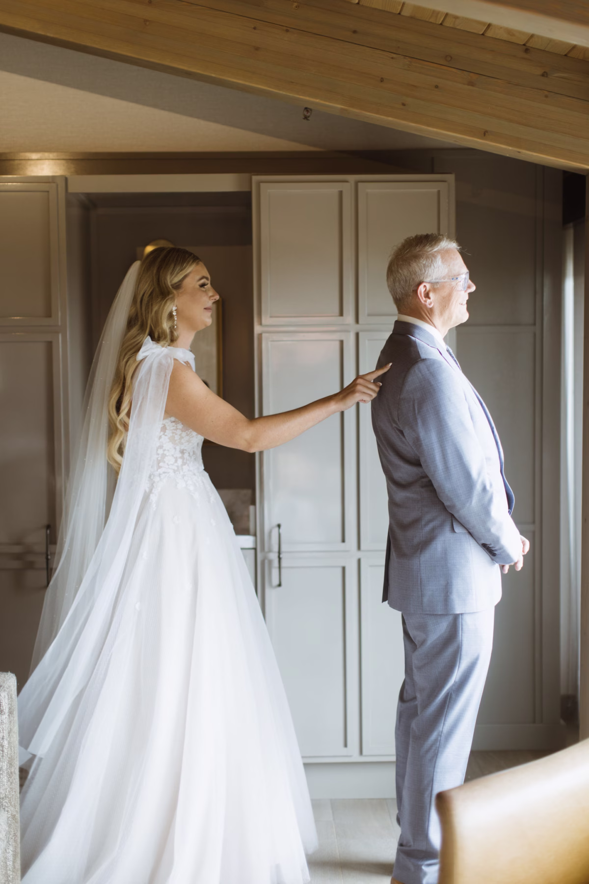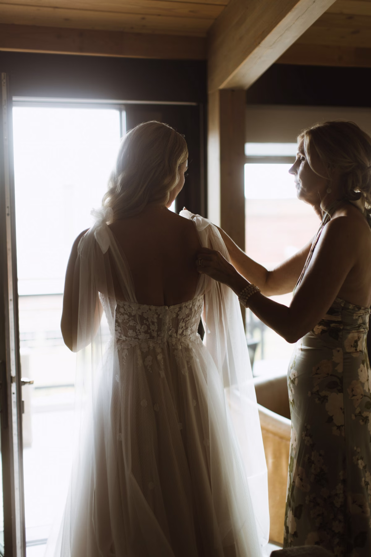 Jana wore an ethereal tulle gown from Charlotte's Bridal, complete with a structured, embroidered, floral illusion bodice, flowing tulle bow straps, and a subtly textured skirt. Jackson wore a sharp navy suit, white undershirt, vest, and patterned tie.