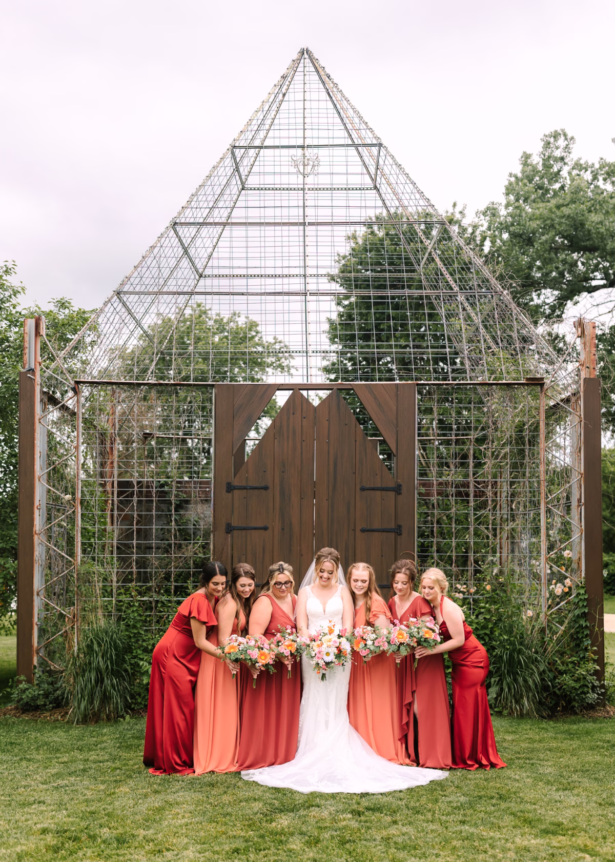 The day's palette included cheerful shades of peach, orange, red, coral, and navy. The bridesmaid's dresses included individual styles in one of three complementary shades, with each color represented evenly.