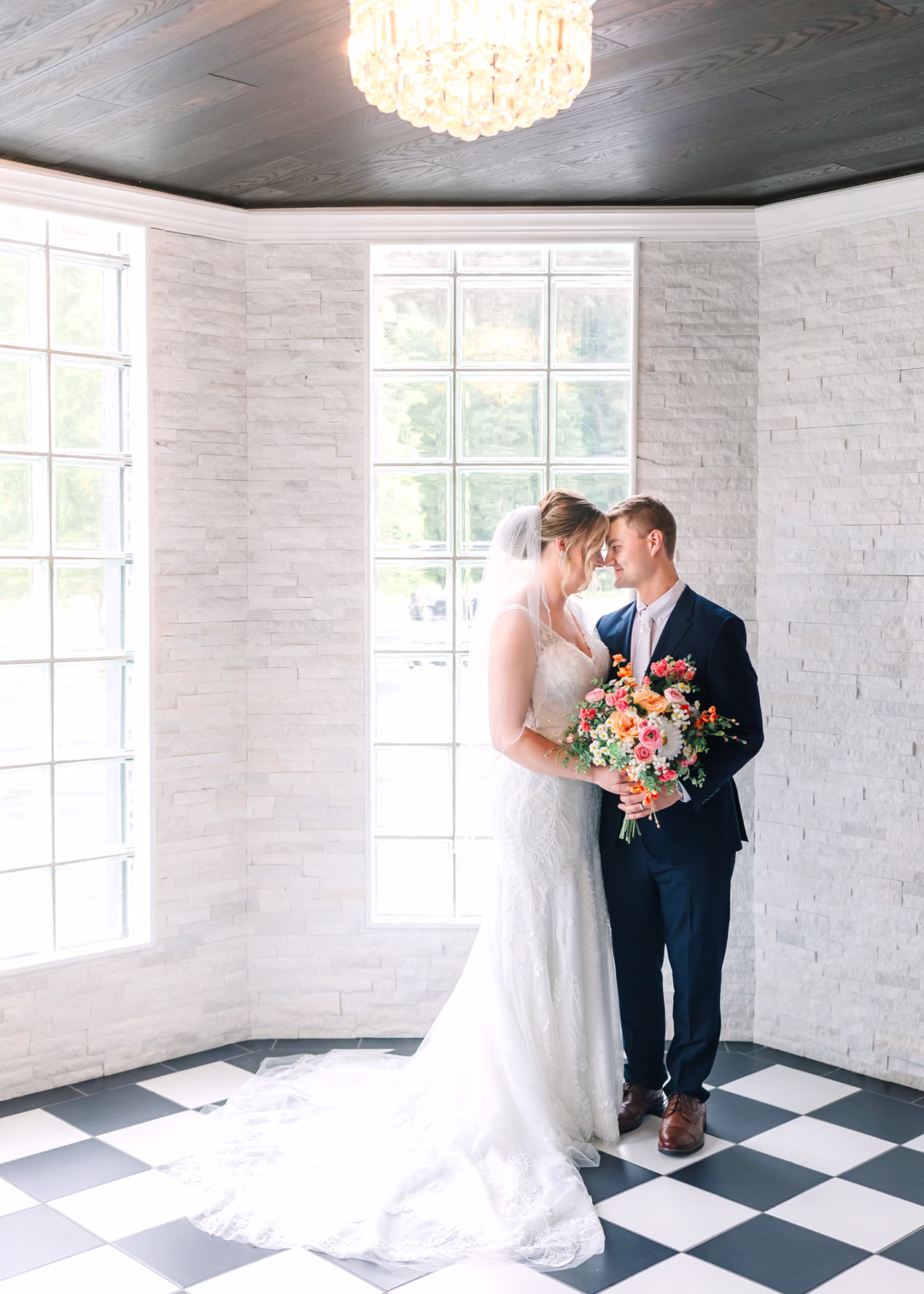 The groom and groomsmen wore navy suits with crisp white undershirts and pocket floral accents. The groomsmen also wore coral-colored ties, while the groom wore a white tie with a muted paisley print.