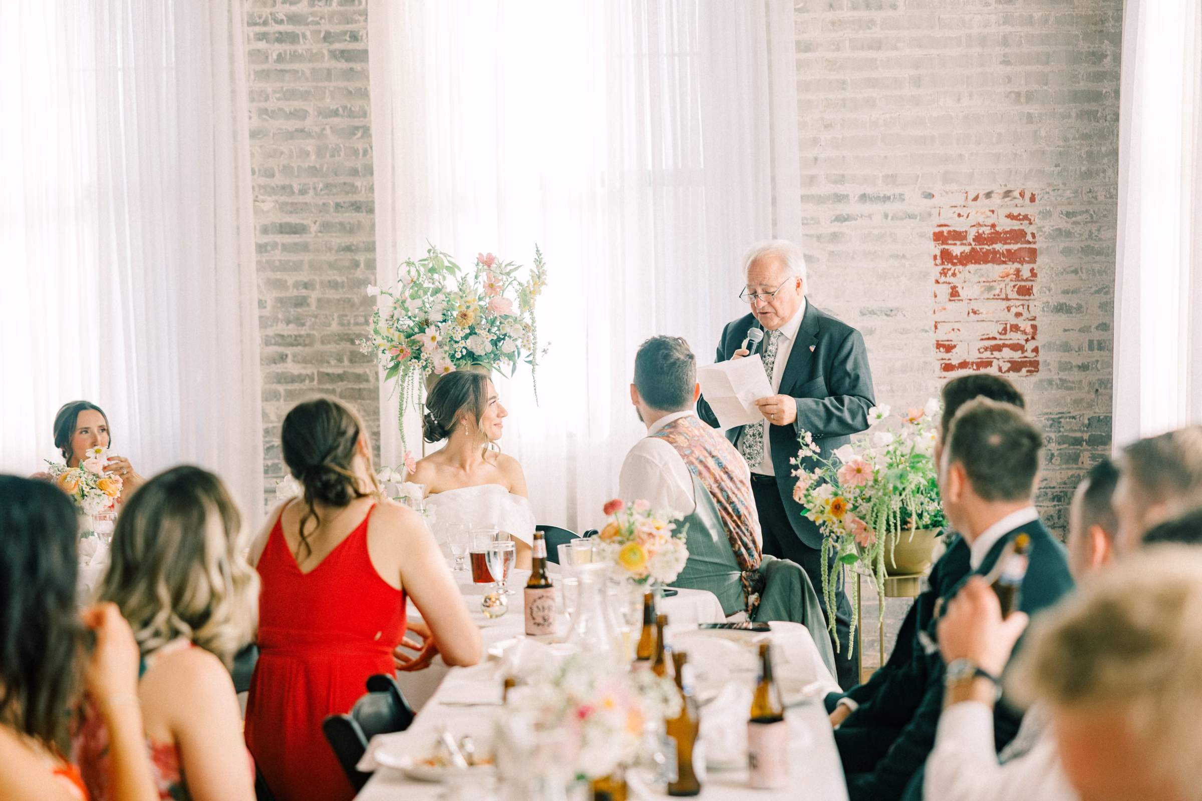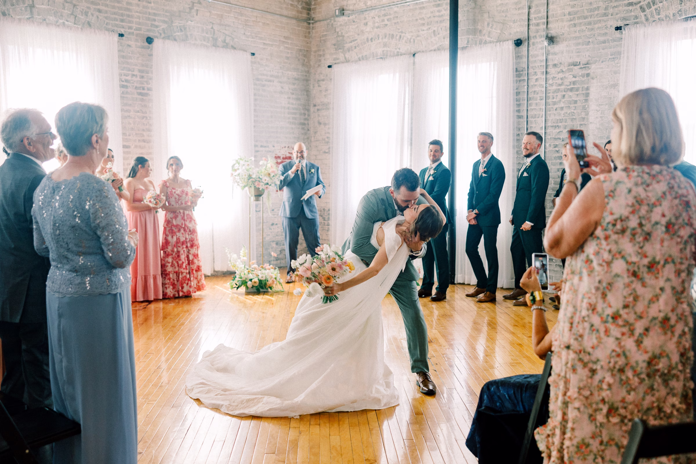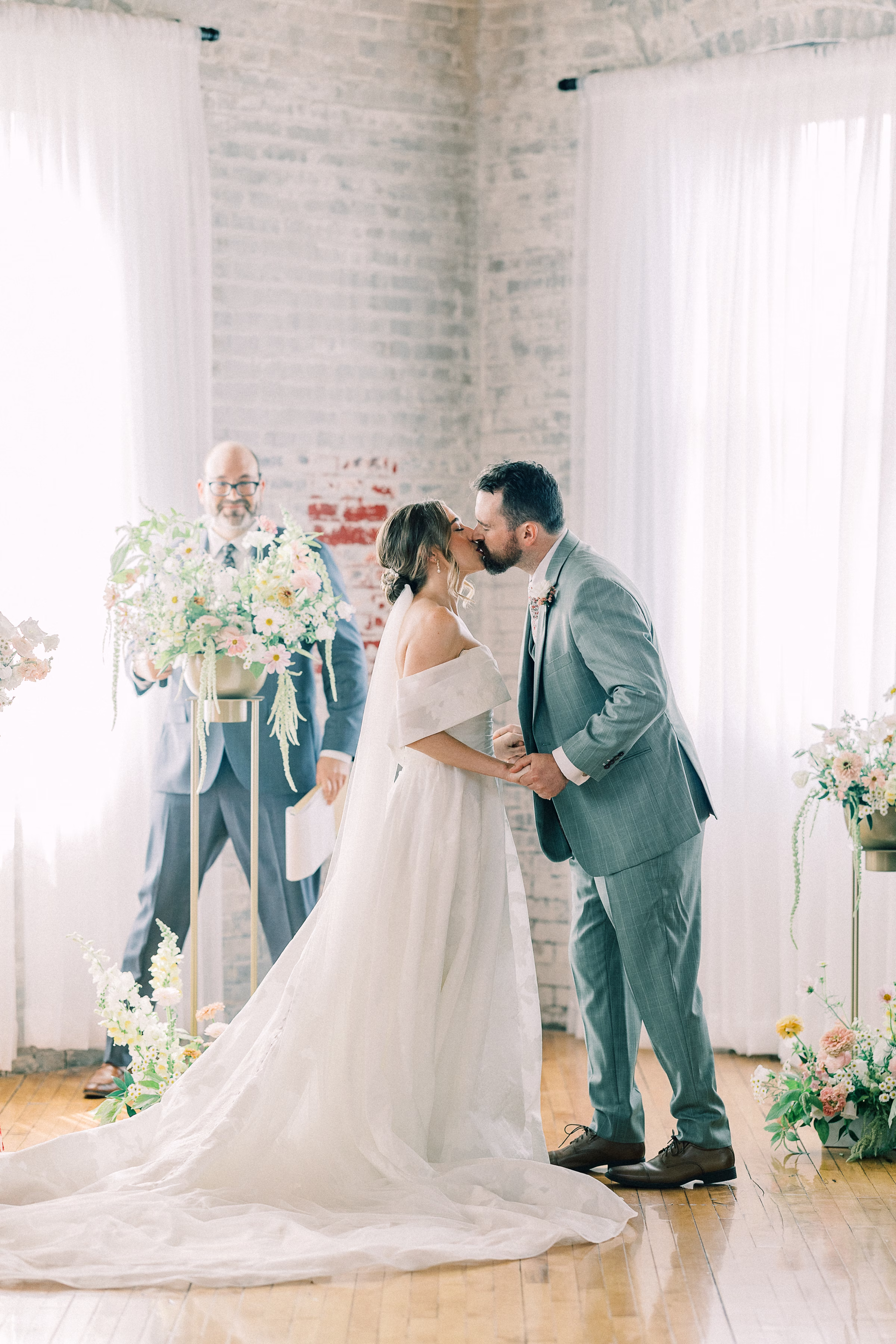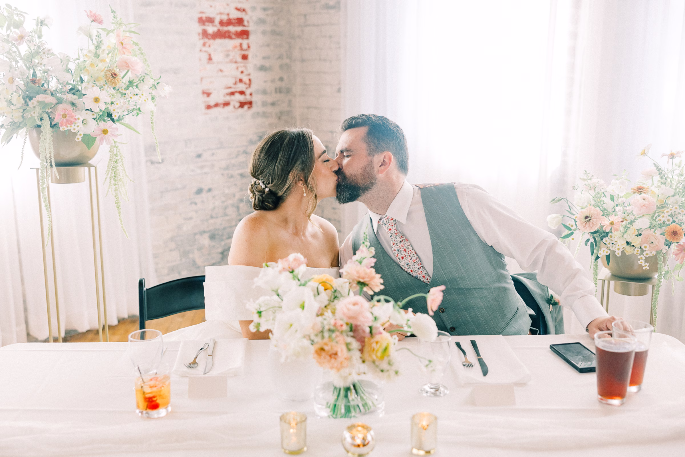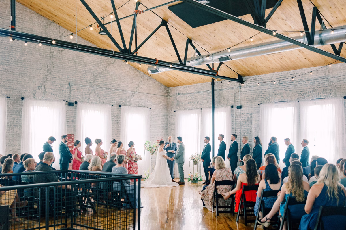 The couple wed in an indoor ceremony framed by florals, natural light, and a timeless brick backdrop. Right after the ceremony, Mallory and Ryan stepped away for a private moment. Mallory reflected, “It was a chance to soak in the moment and be fully present with each other. During that time, we shared our personal vows with just the two of us. It was intimate, emotional, and one of the most meaningful parts of our wedding.”