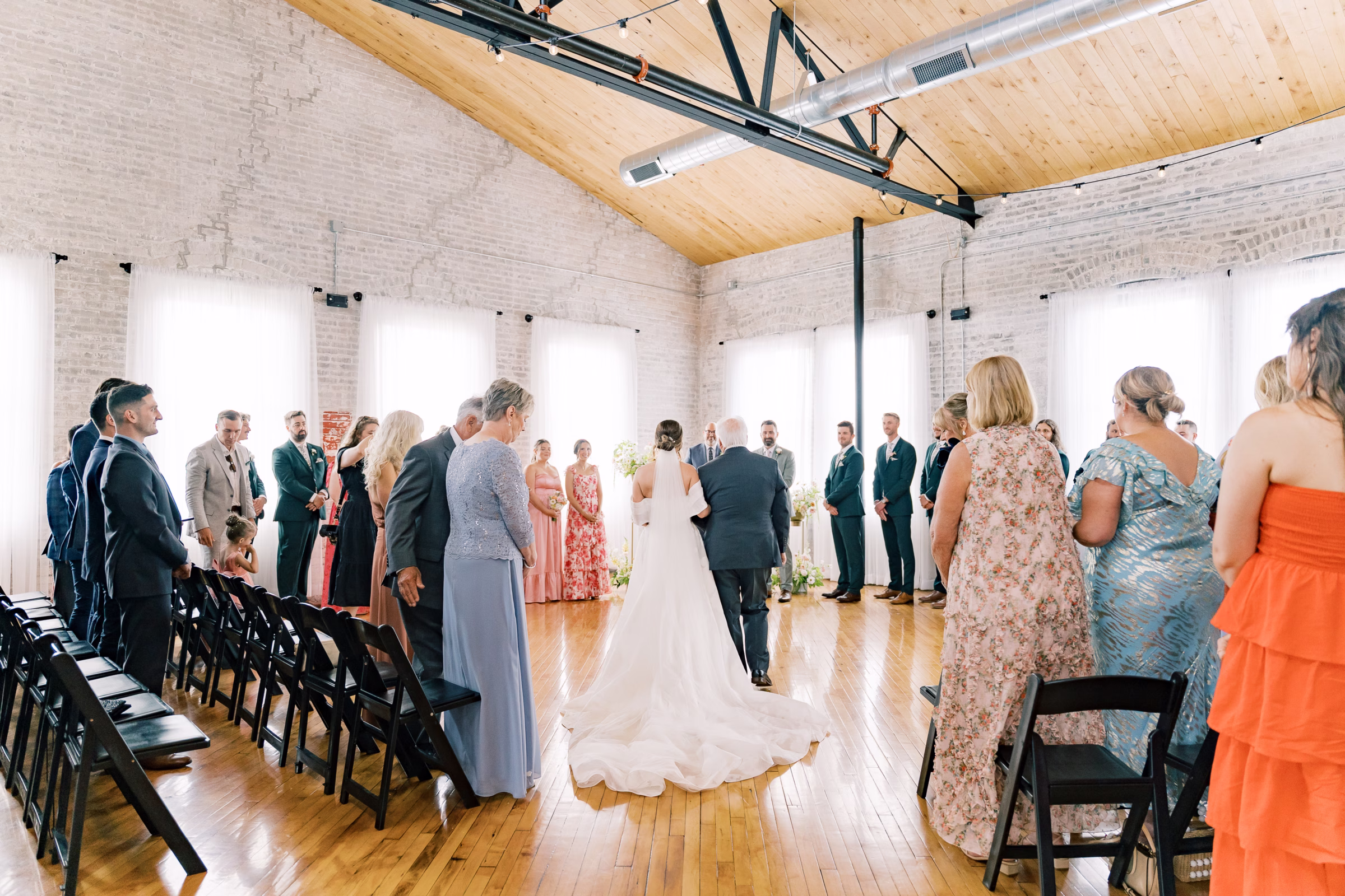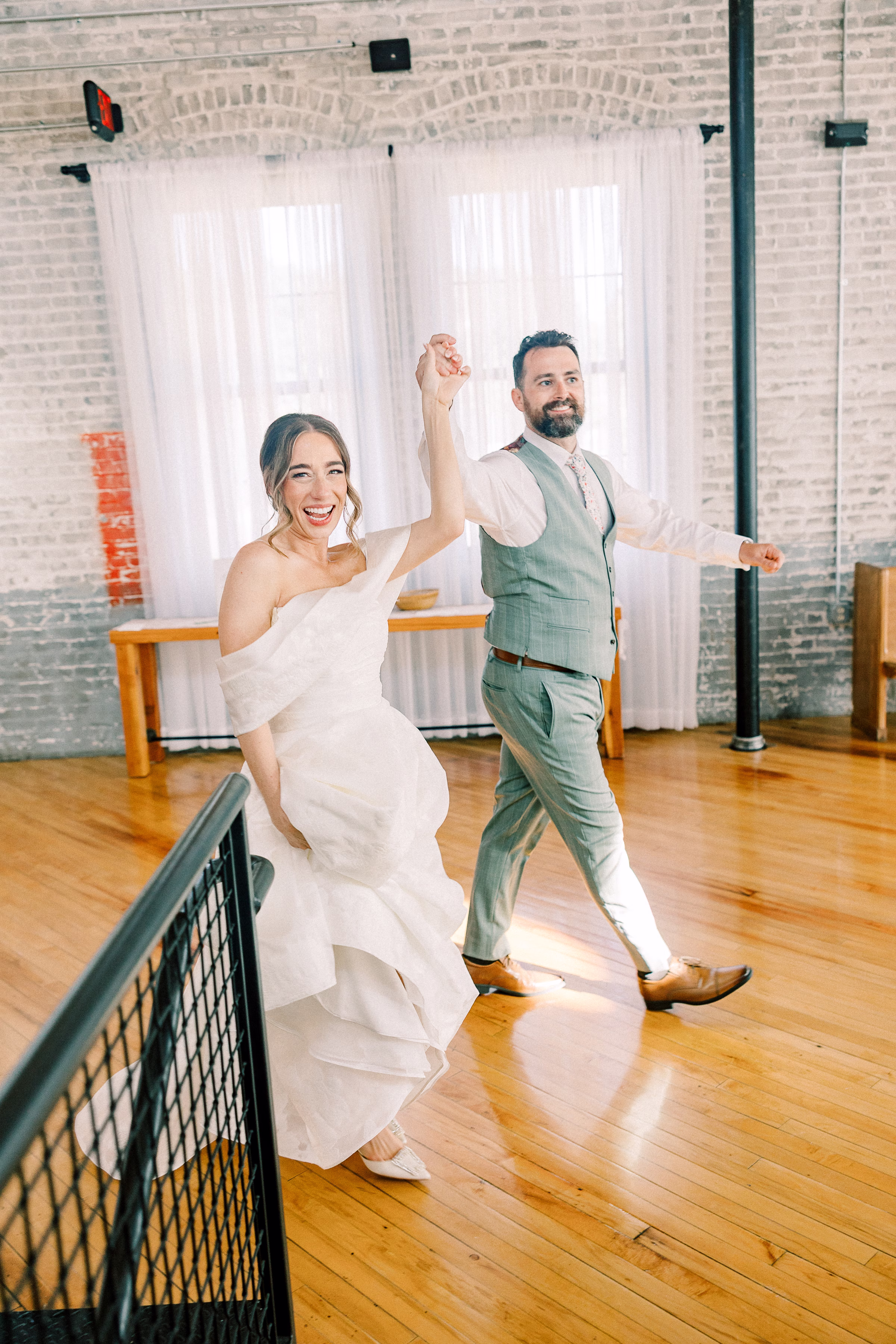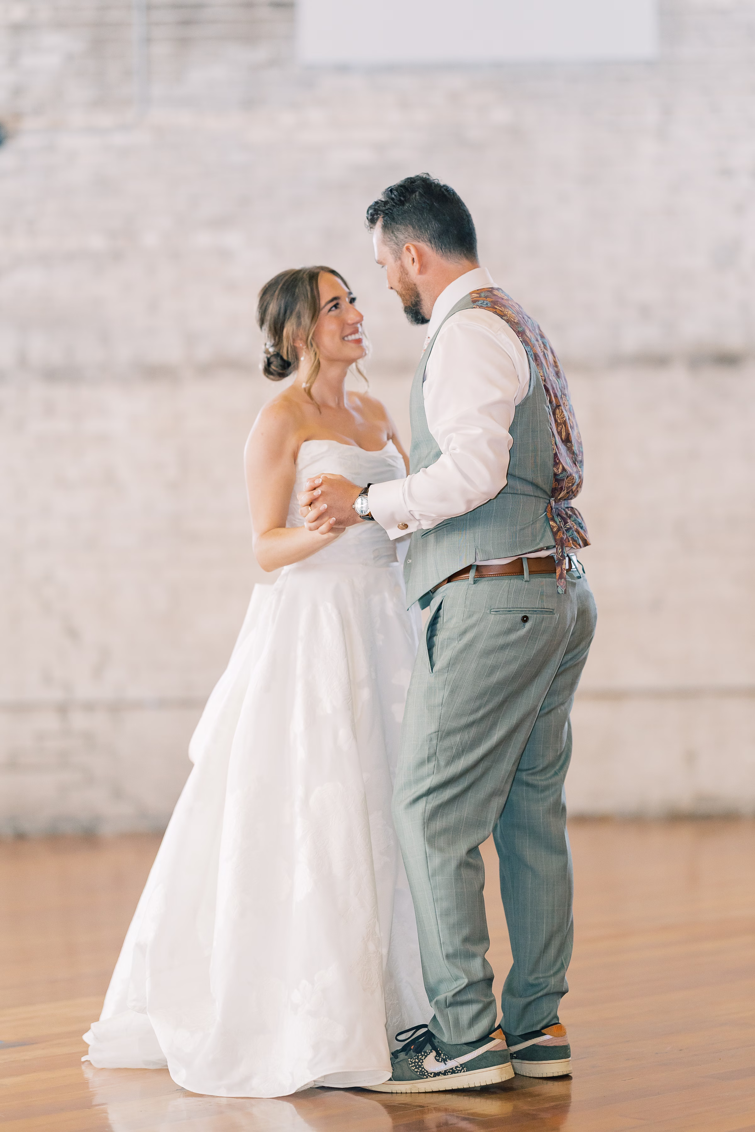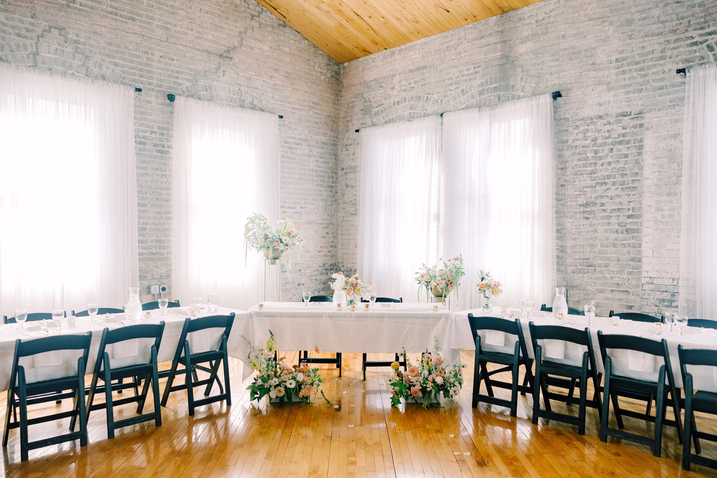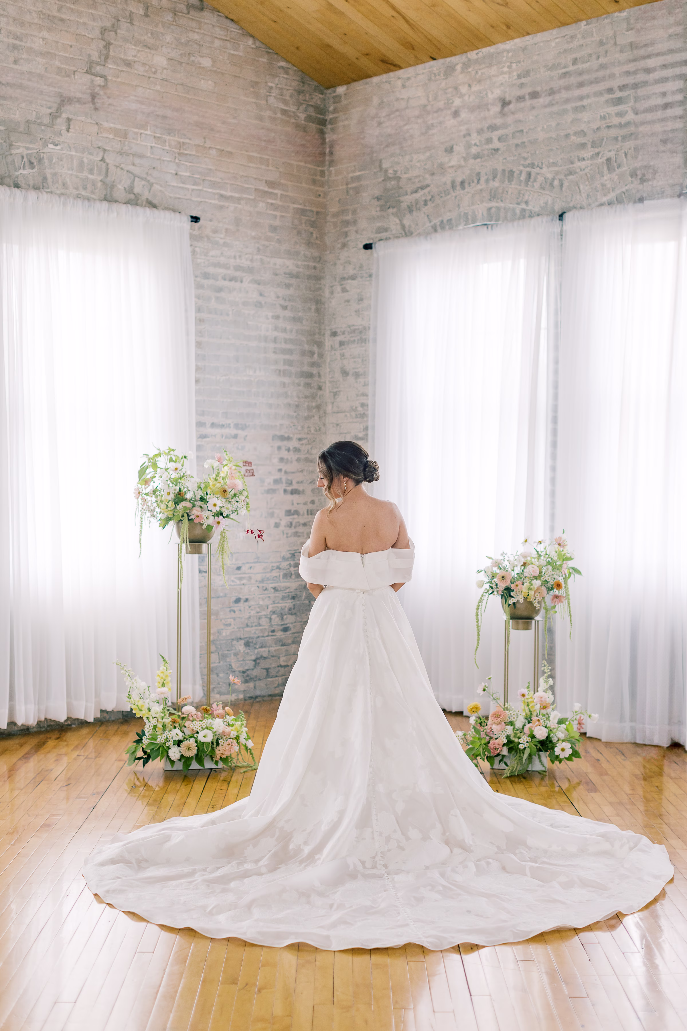 The couple wed in an indoor ceremony framed by florals, natural light, and a timeless brick backdrop. Right after the ceremony, Mallory and Ryan stepped away for a private moment. Mallory reflected, “It was a chance to soak in the moment and be fully present with each other. During that time, we shared our personal vows with just the two of us. It was intimate, emotional, and one of the most meaningful parts of our wedding.”